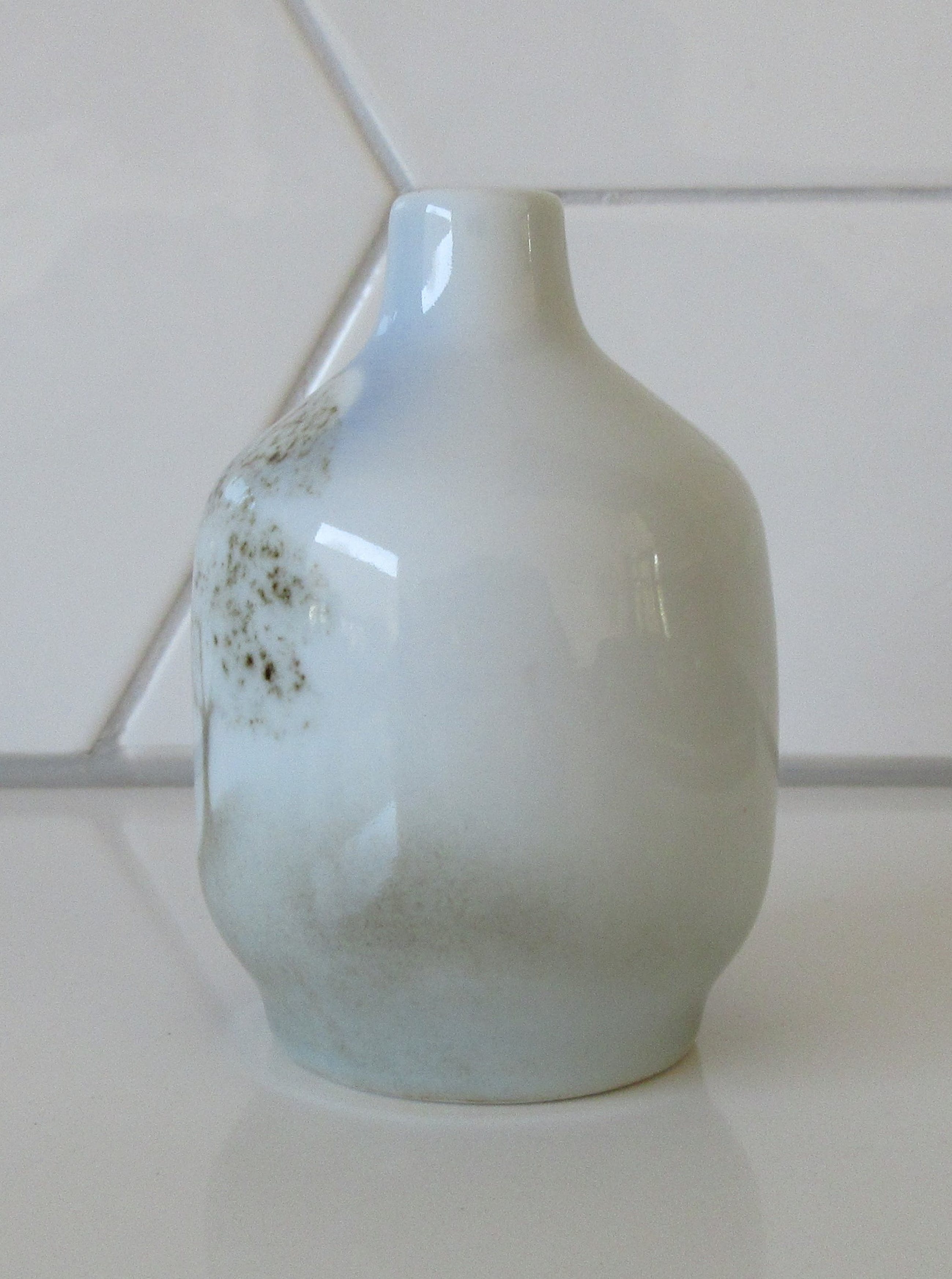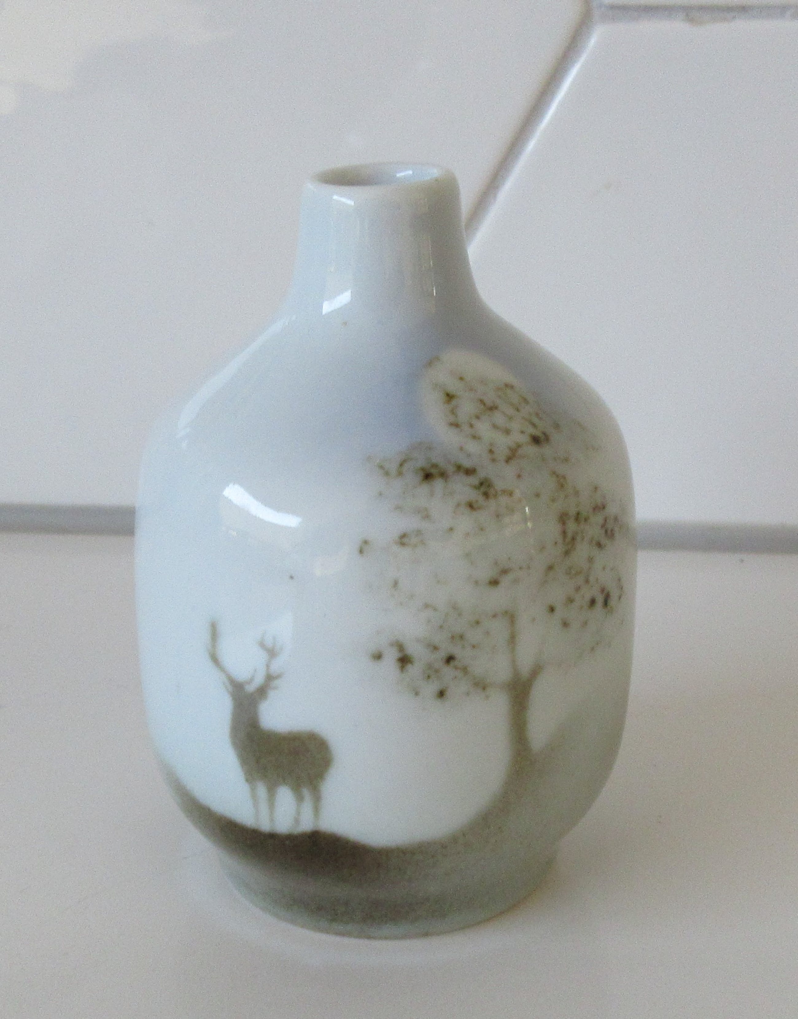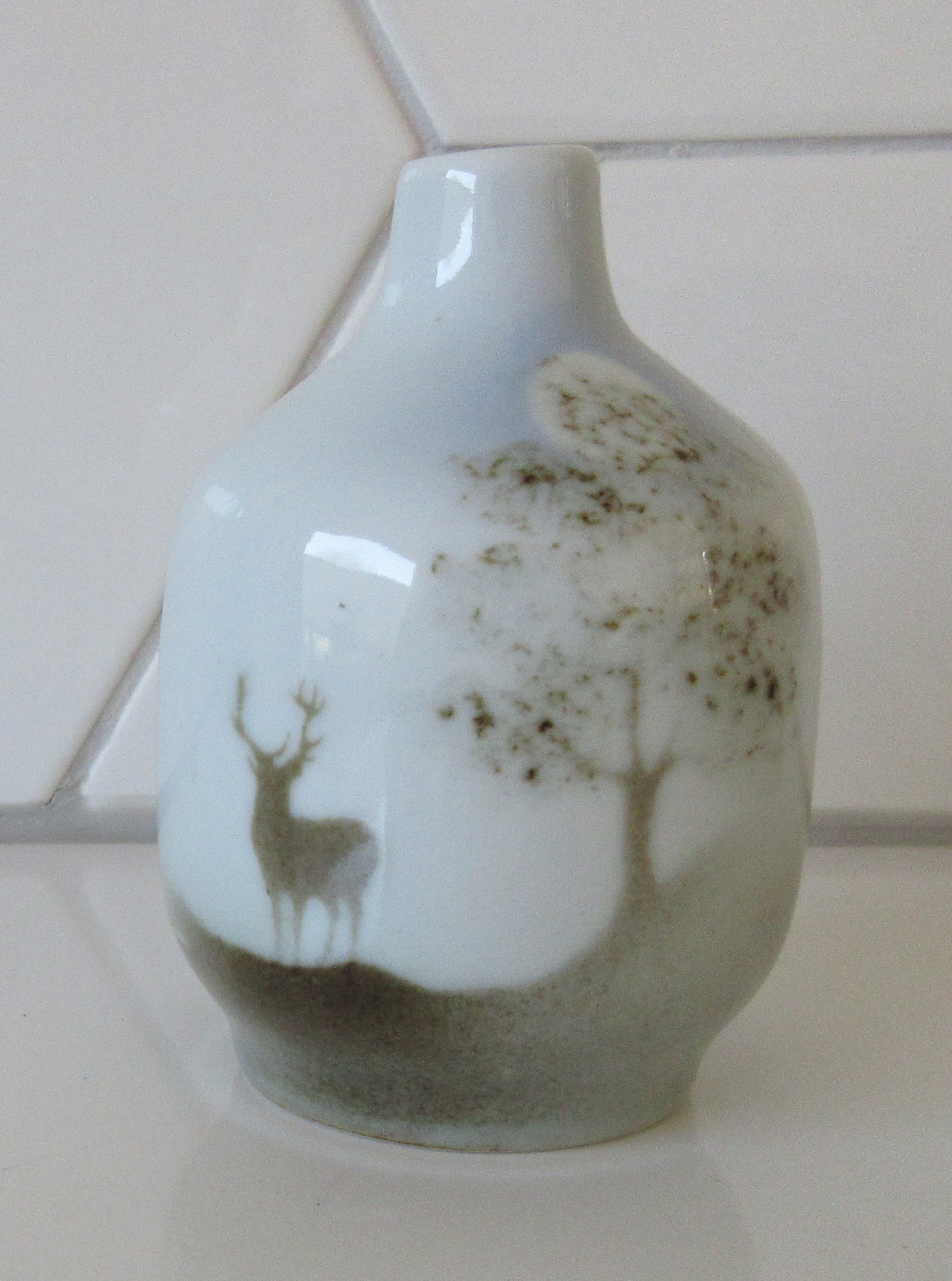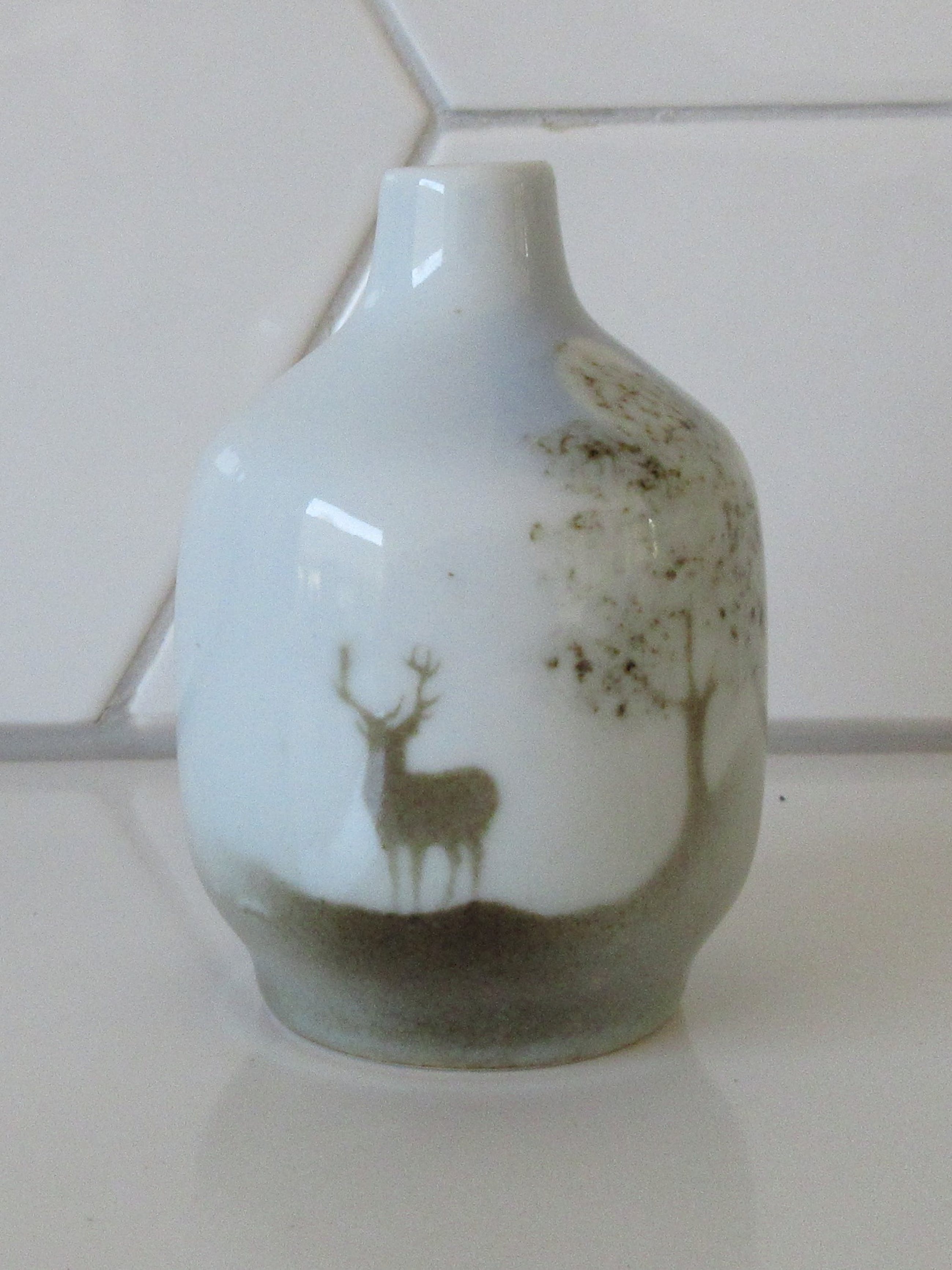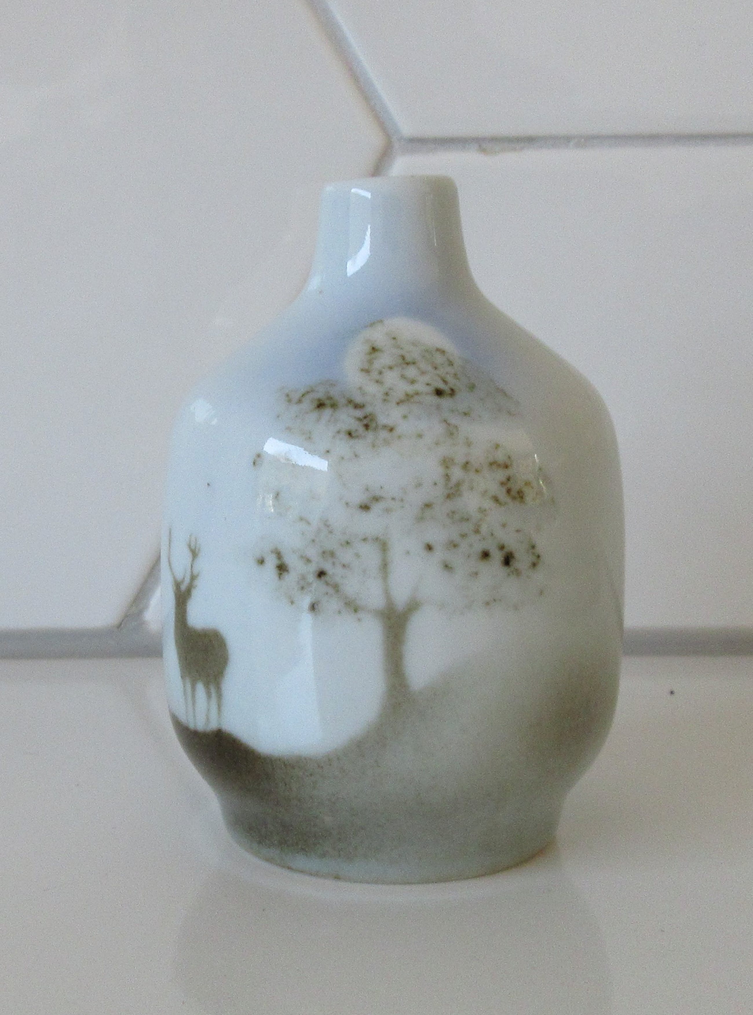Highbank Porseleinen Bibelotte vaasjes met afbeelding Schots winterlandschap. In prima onbeschadigde conditie. Aan de onderzijde voorzien een geprint blindmerk.