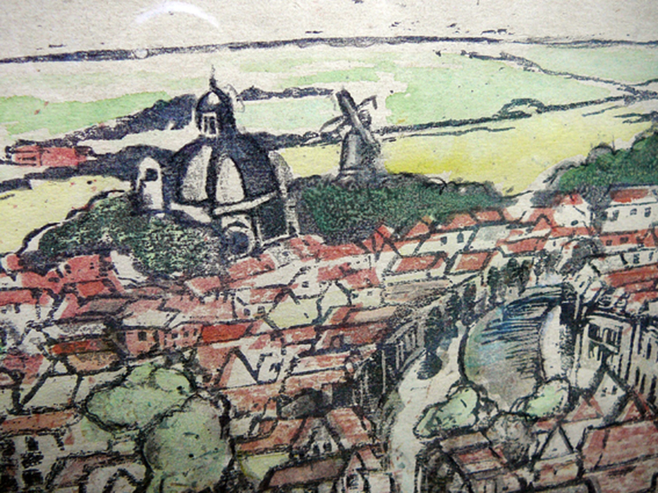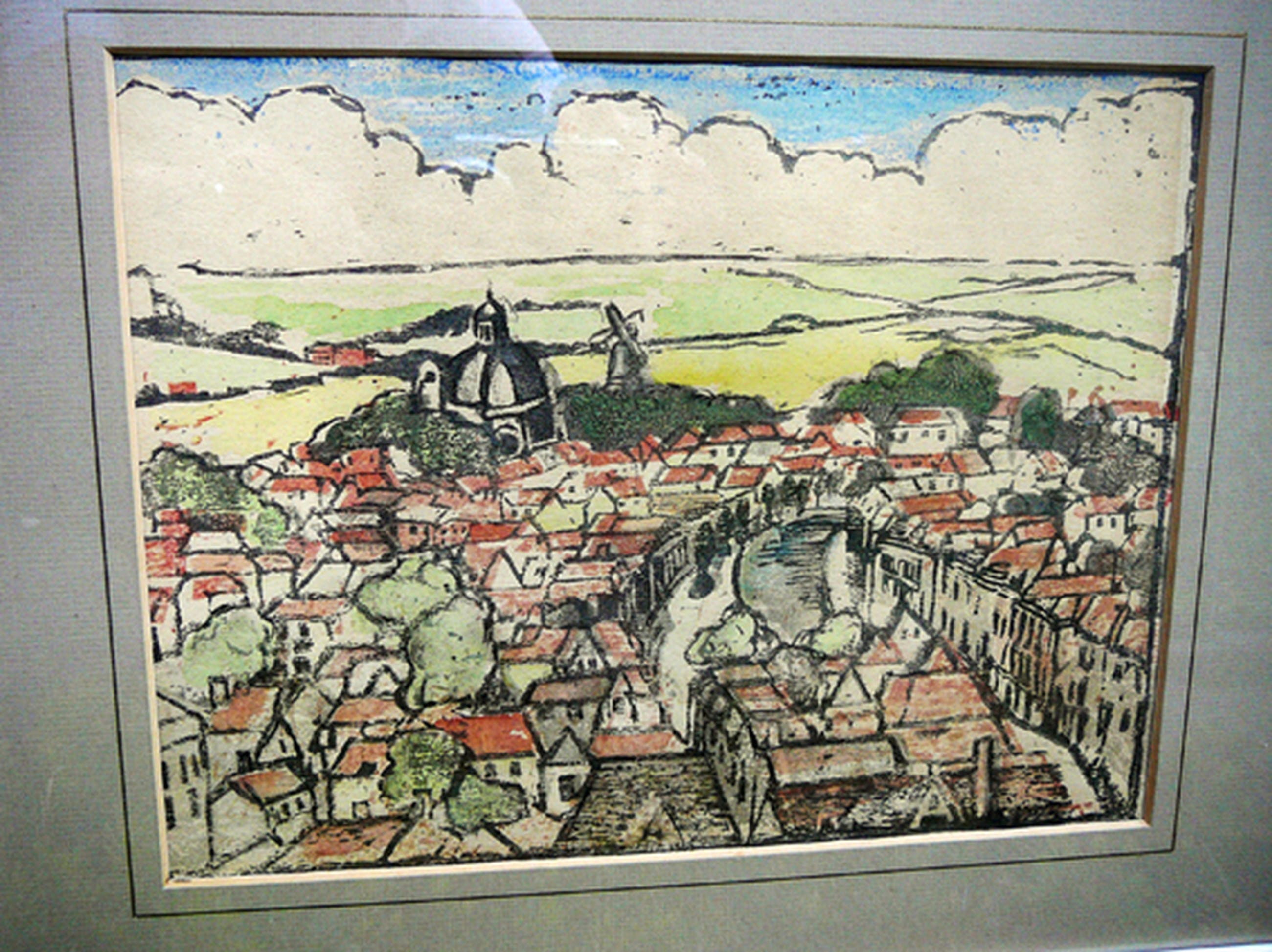 Fleurige houtsnede met een voorstelling van een mij onbekend dorpje of stad ergens in Nederland rond 1928. Niet zichtbaar gesigneerd (lijst is niet geopend geweest).