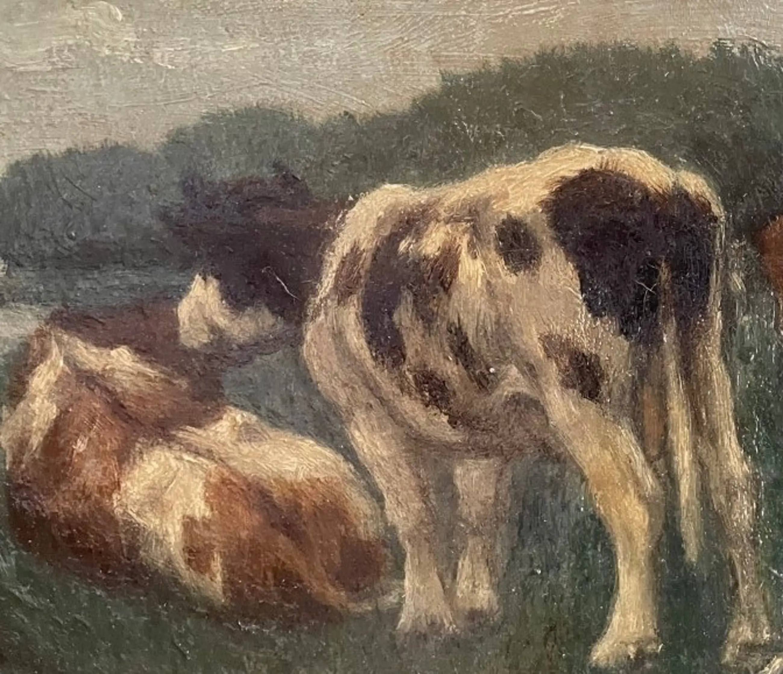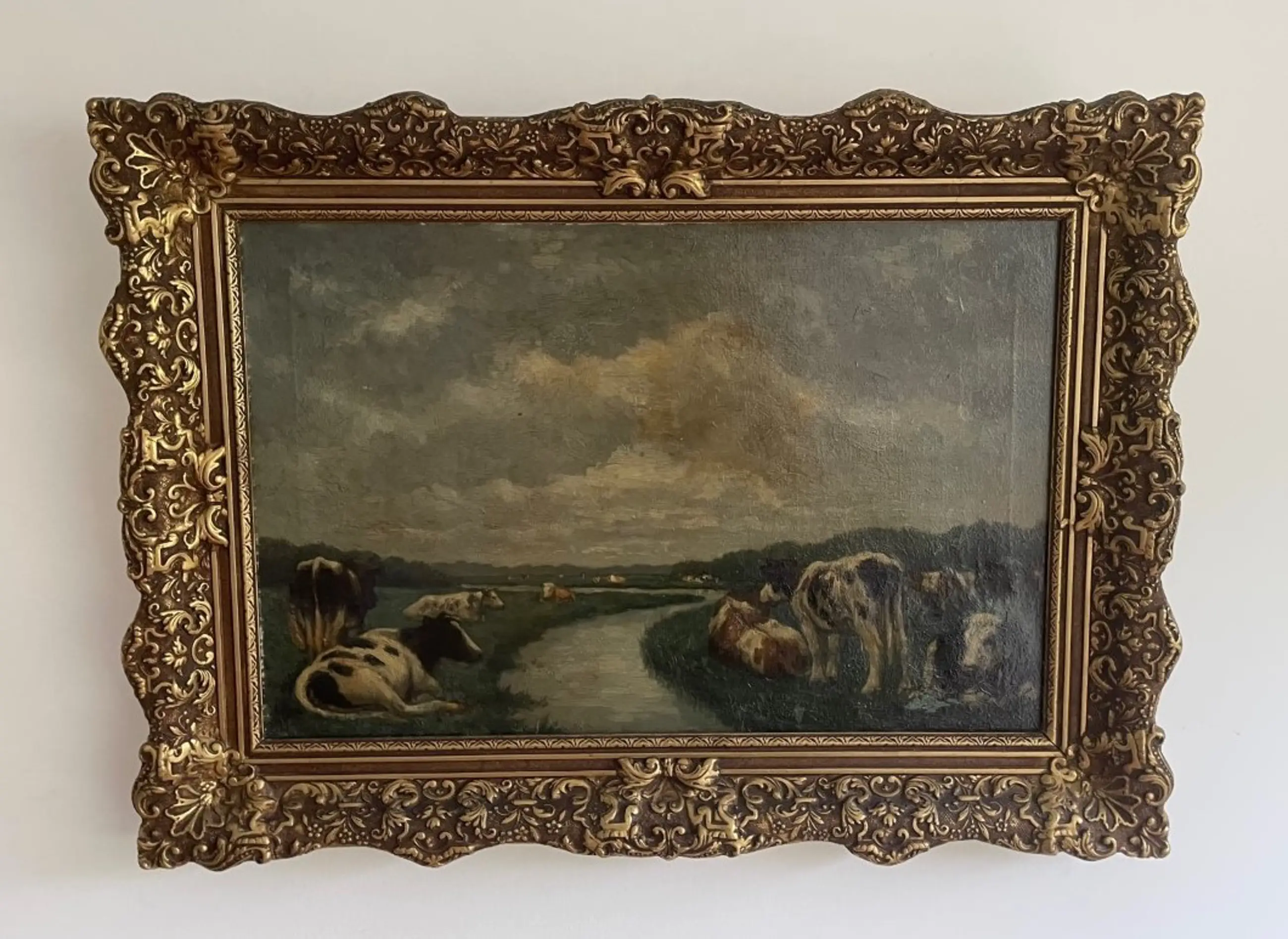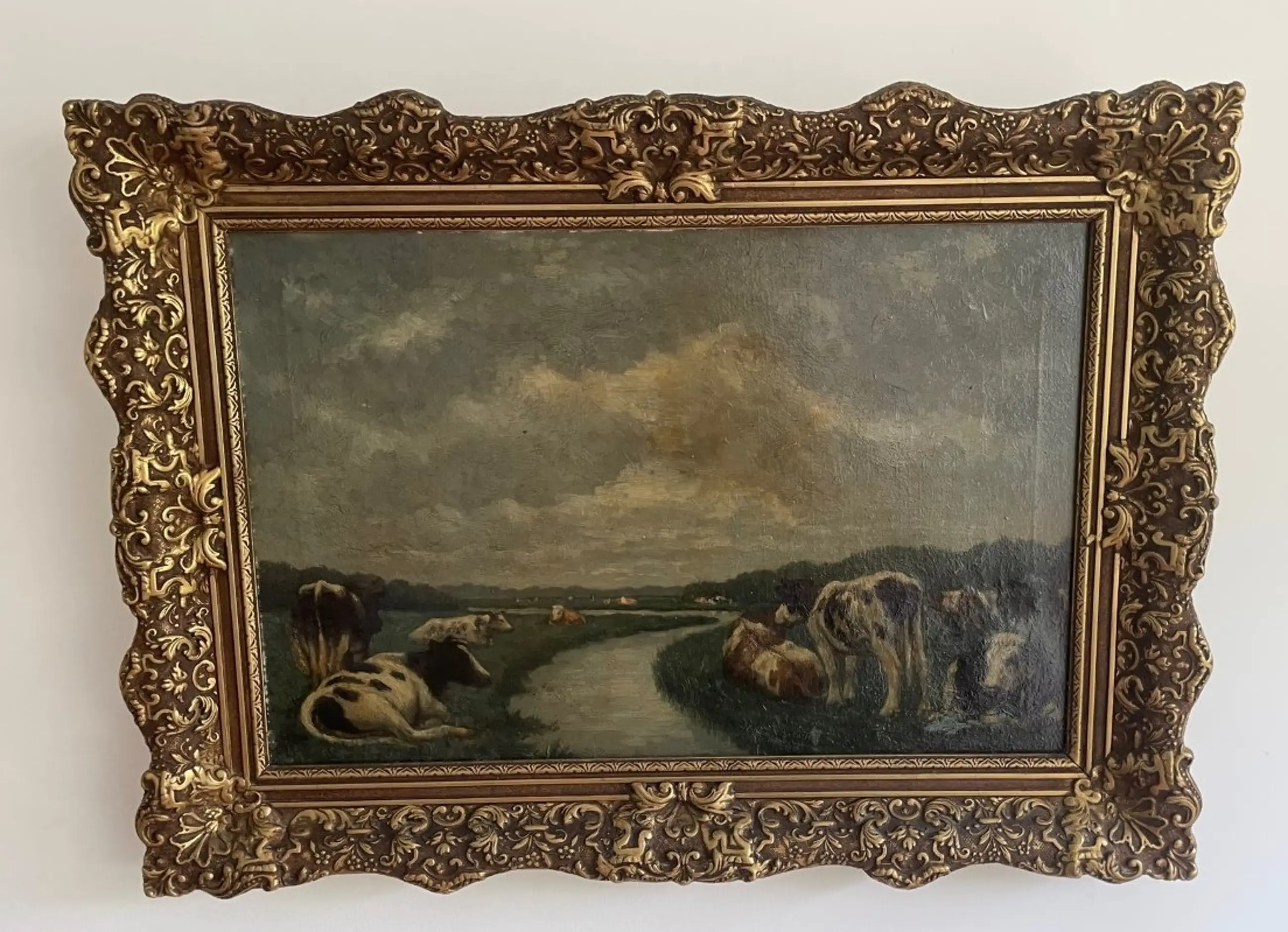 Hollands landschap met koeien in grasland en meanderend slootje/riviertje door het grasland heen met op de achtergrond bomengroep of een boszoom en een grijs wolkendek. Niet gesigneerd, wel gedateerd 1909 aan de achterzijde van het doek. Voorzien van houten goud vergulde lijst in goede conditie.