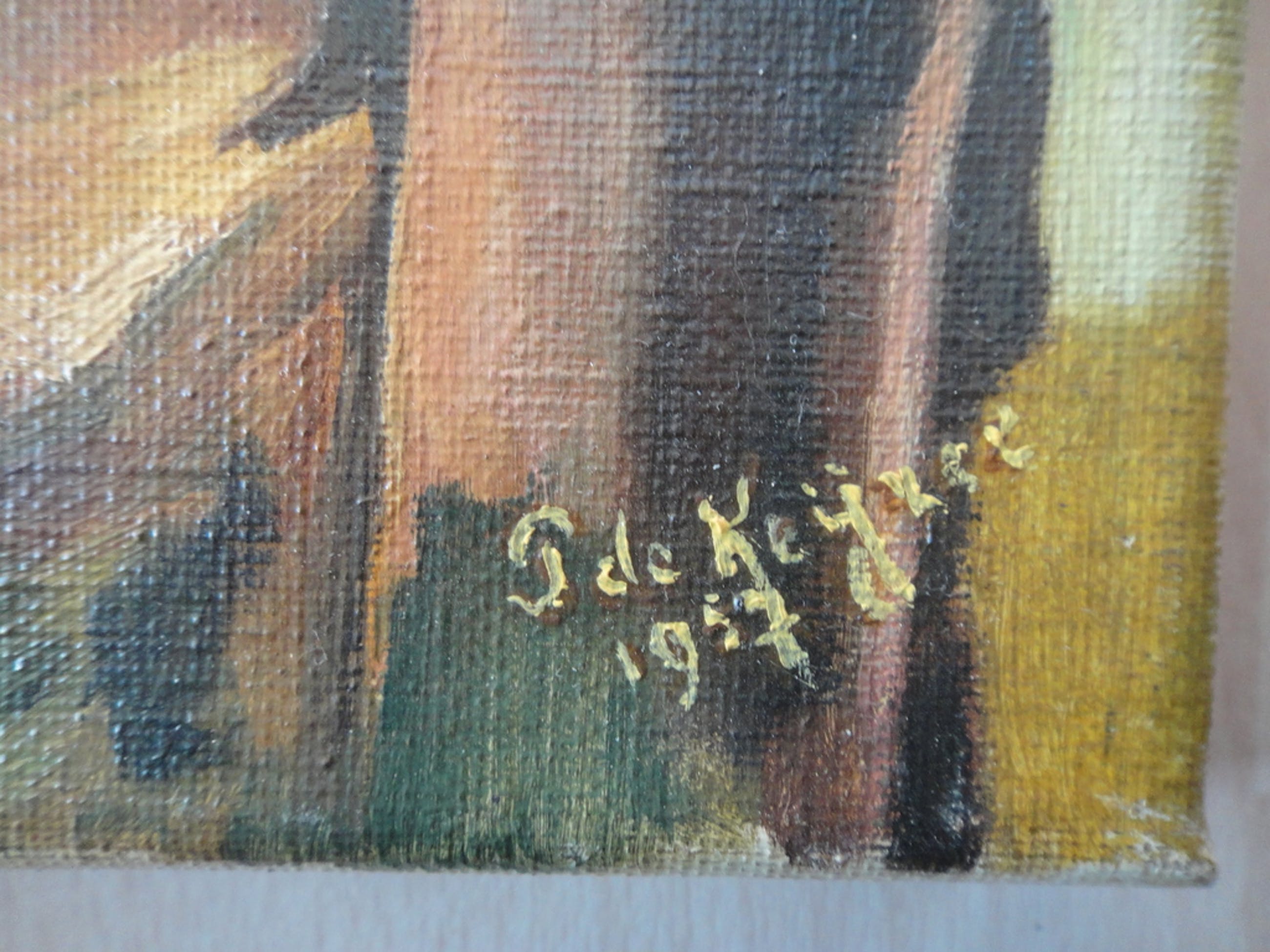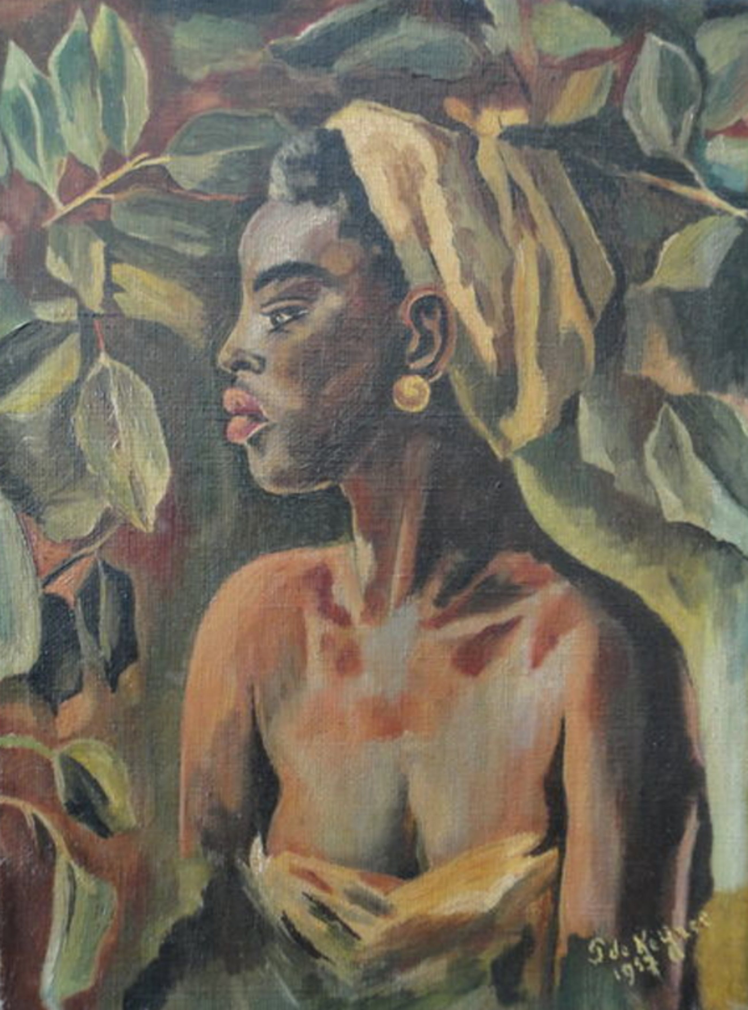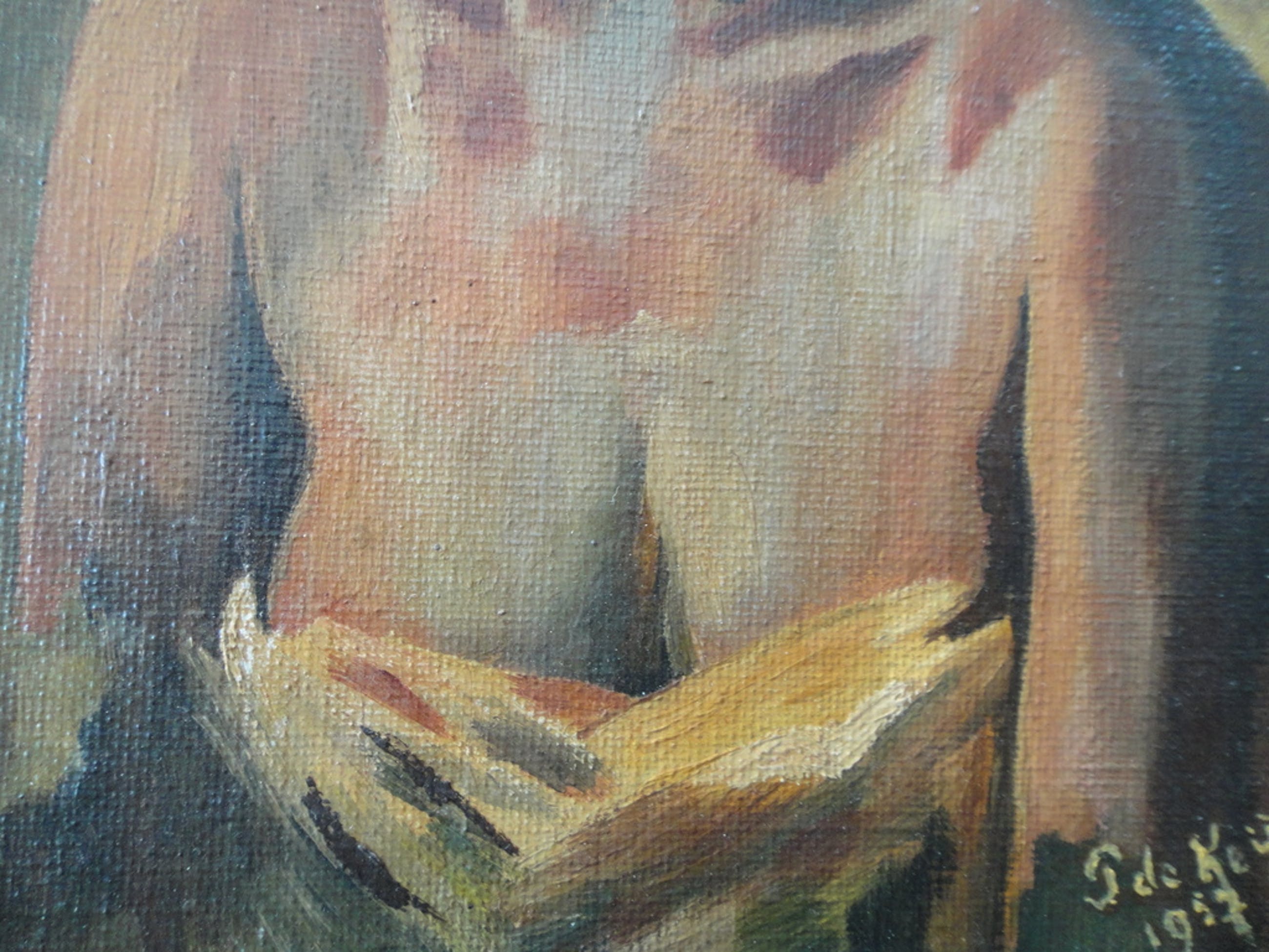 Het doek is rechtstonder gesigneerd: 'T of P de Keijzer' en gedateerd: '1957'.Hollandse school (20e eeuw) - Portret van een schaars geklede dame