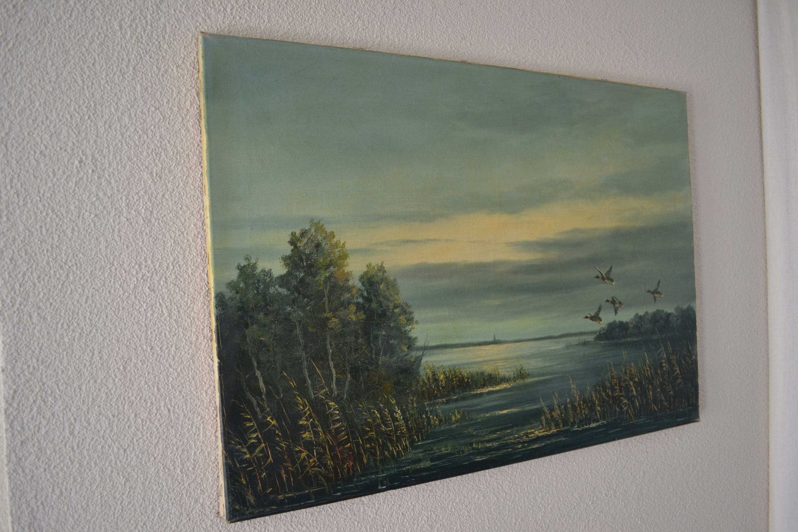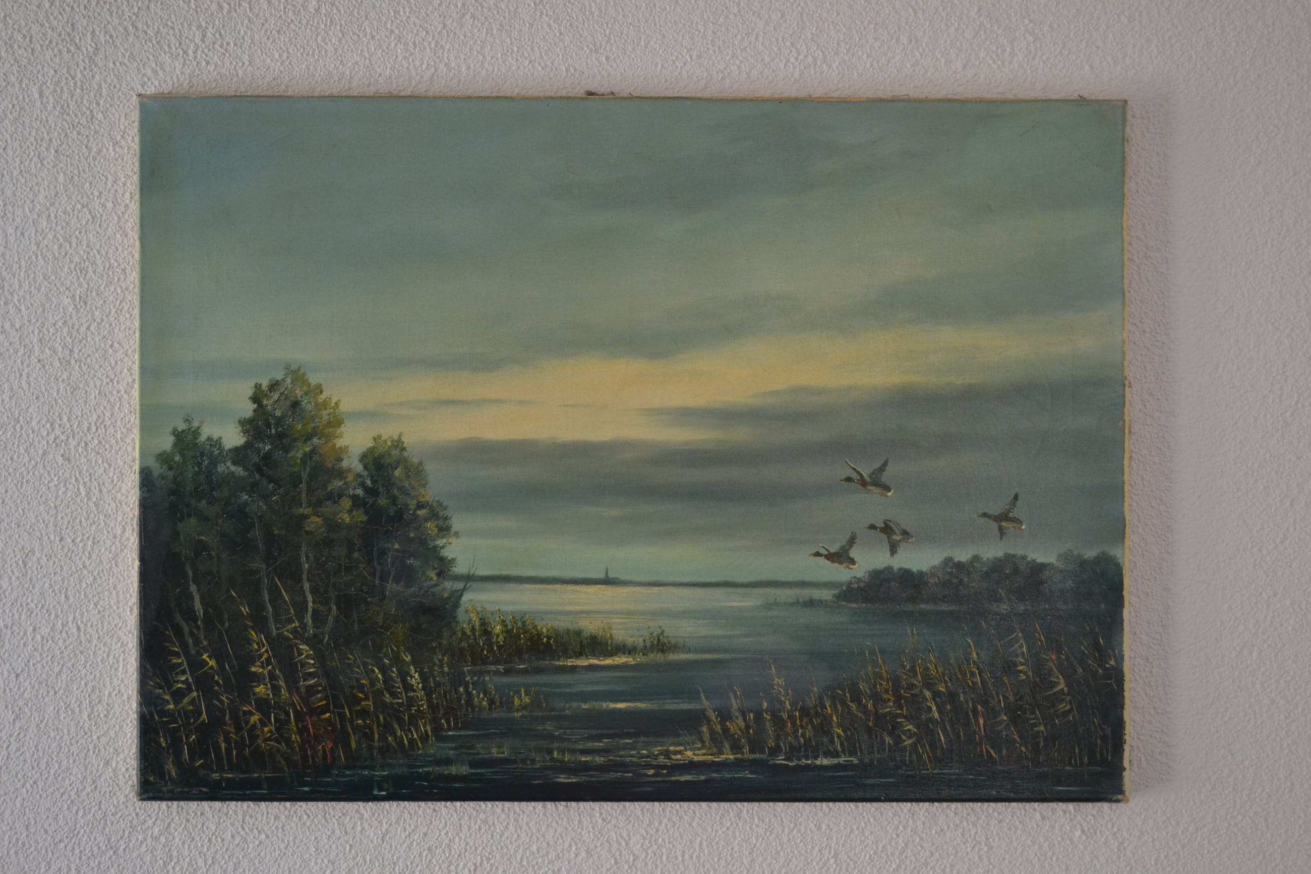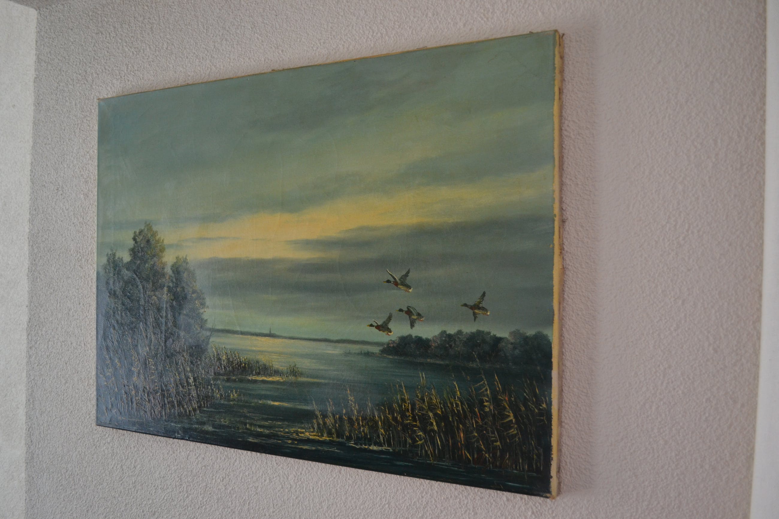 Schilderij met voorstelling van water en overvliegende eenden. In goede conditie, 20ste eeuw.Linksonder gesigneerd maar moeilijk leesbaar (Olshof?) Wordt goed verpakt en aangetekend verstuurd.