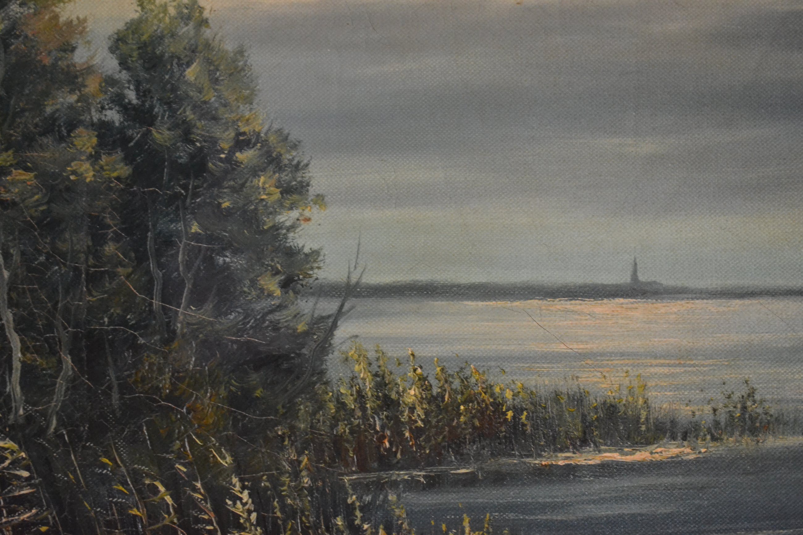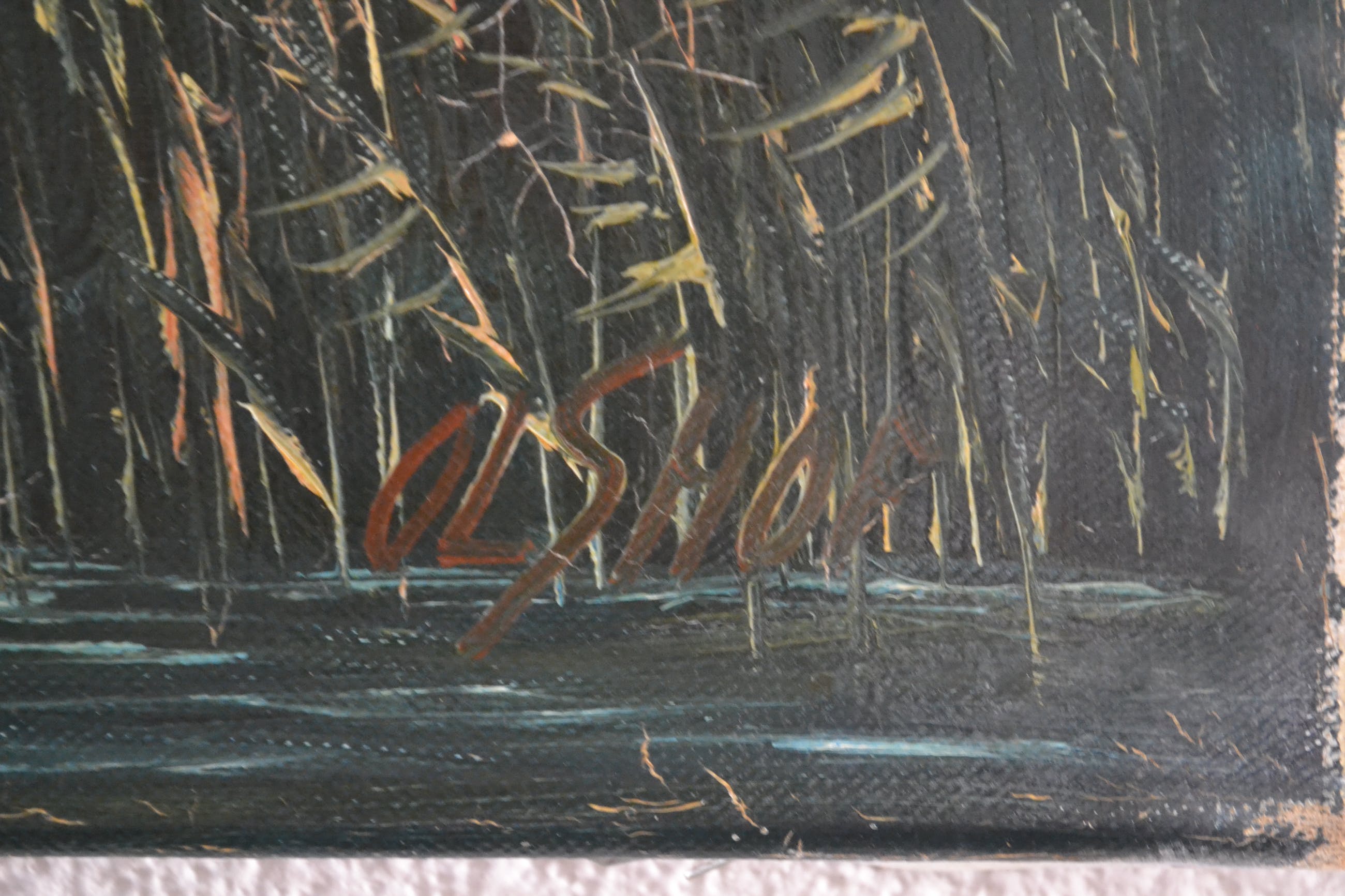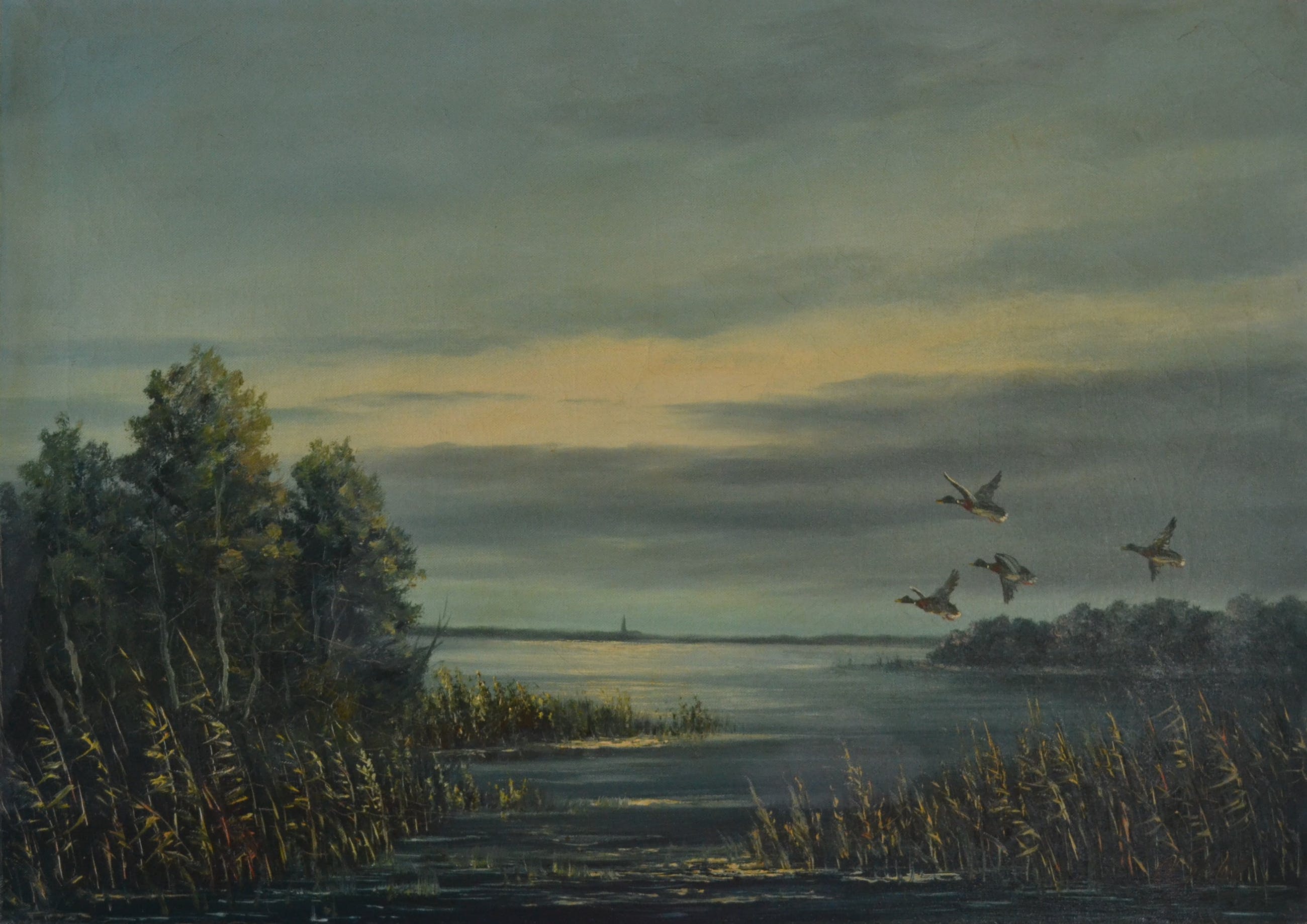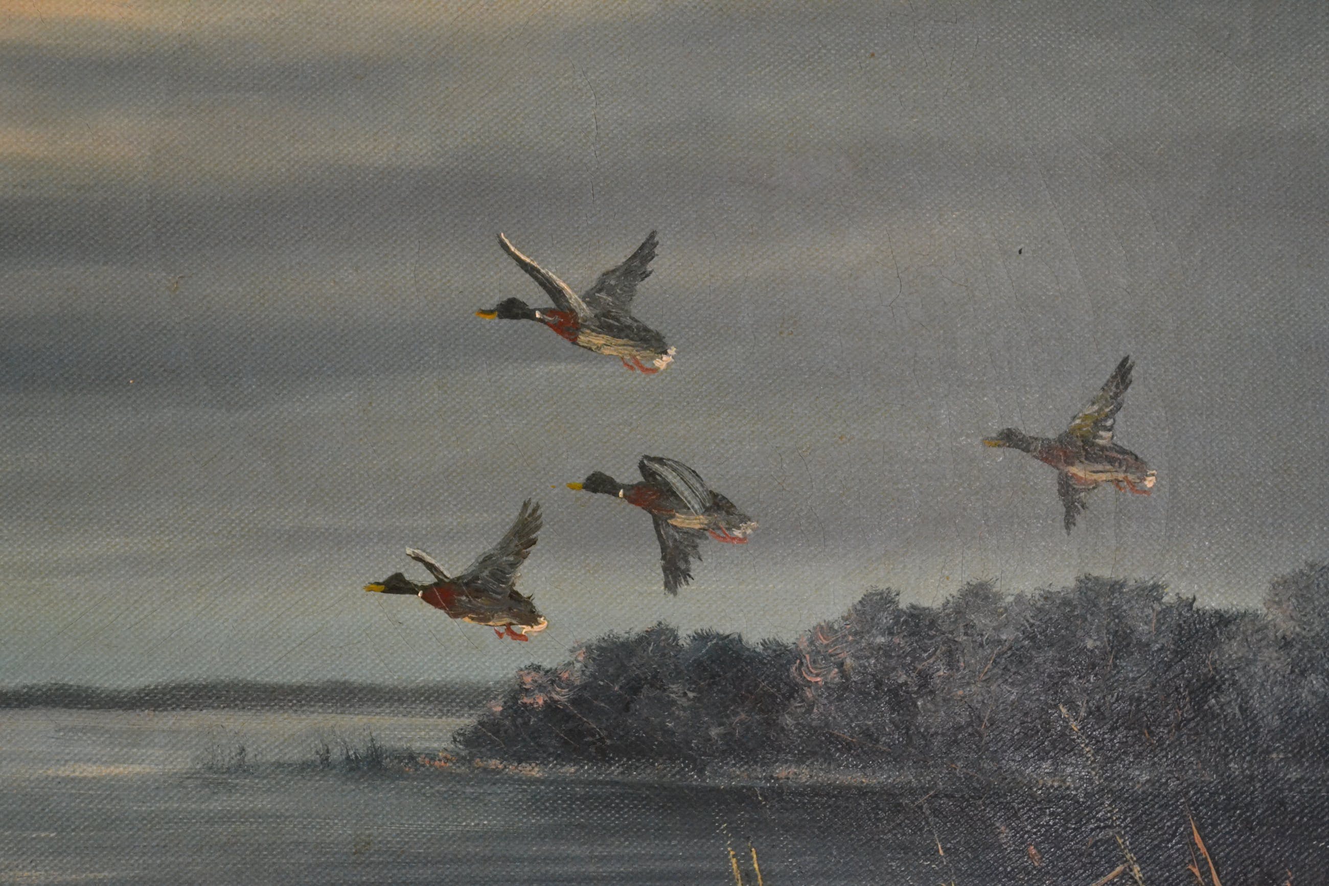 Schilderij met voorstelling van water en overvliegende eenden. In goede conditie, 20ste eeuw.Linksonder gesigneerd maar moeilijk leesbaar (Olshof?) Wordt goed verpakt en aangetekend verstuurd.