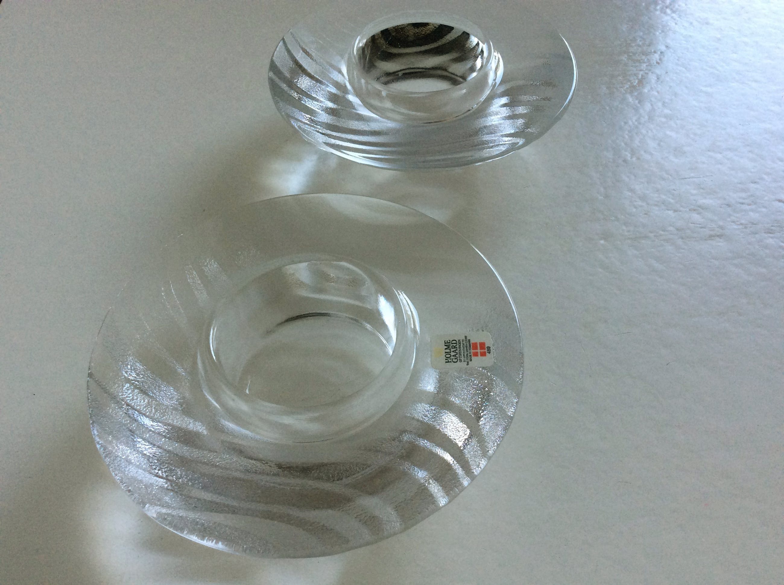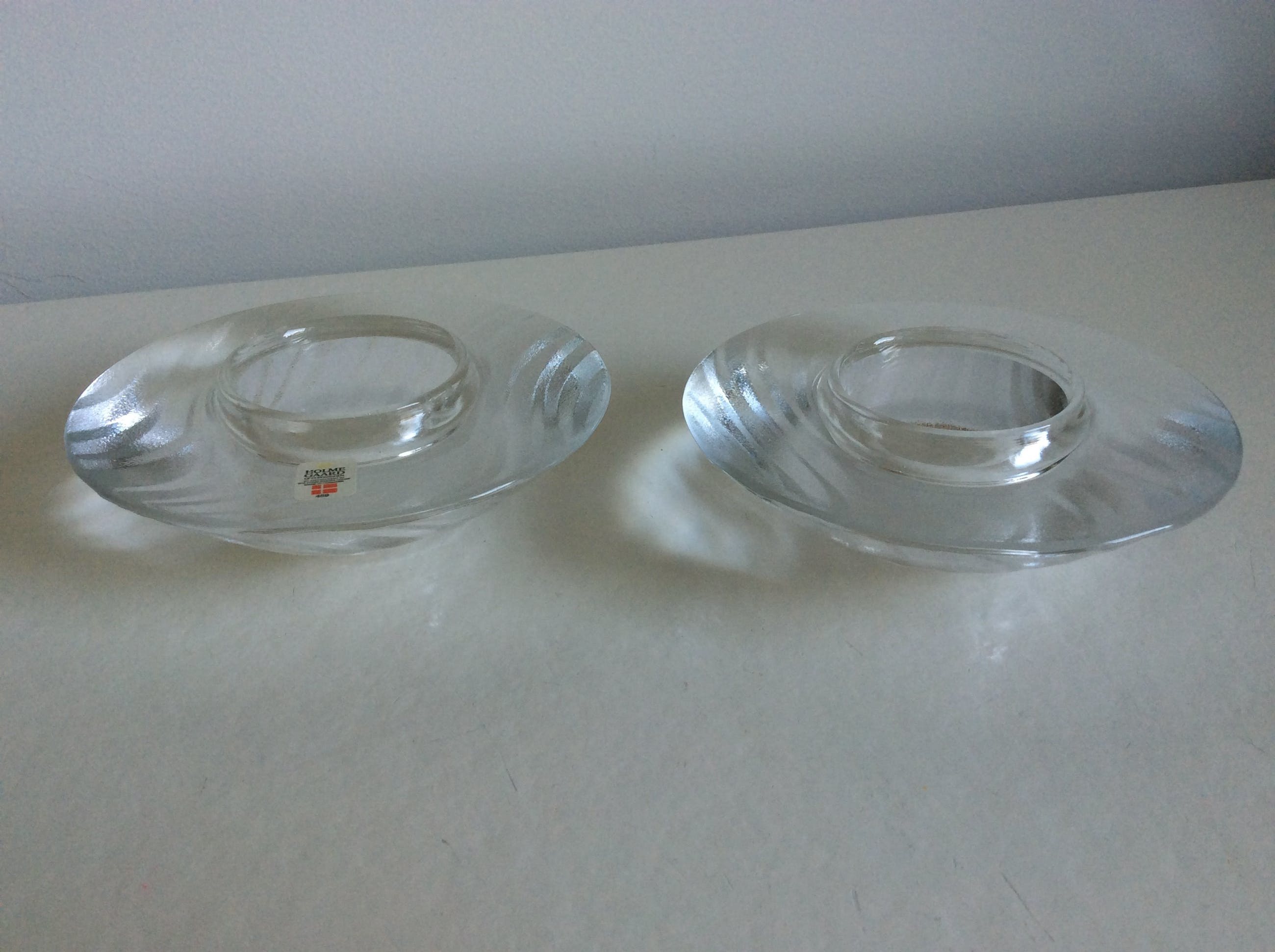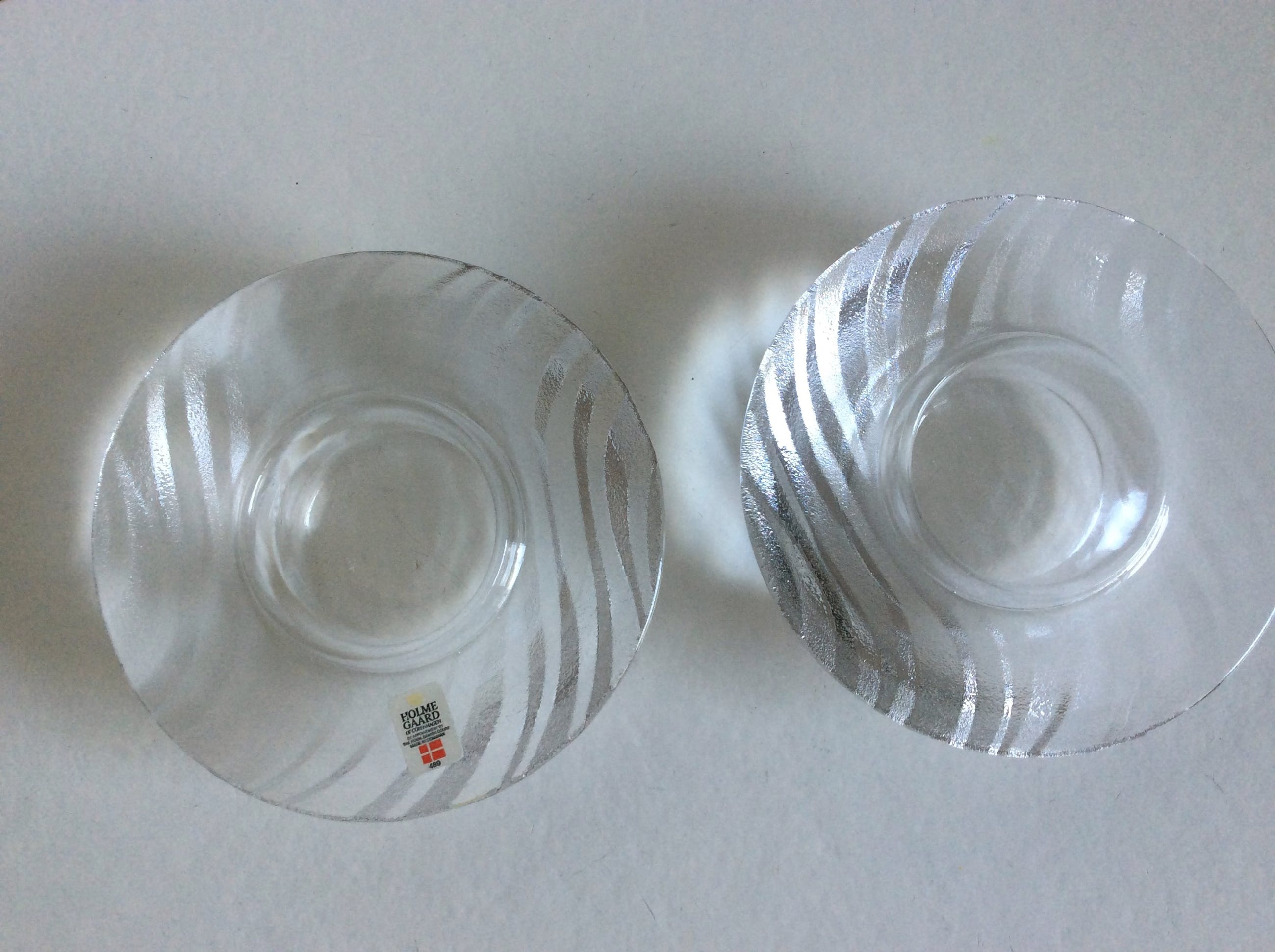 Set van 2 kristallen votives (waxinehouders) van Holmegaard met zebra/swirl motief.Een object heeft originele sticker van Holmegaard. Eind 20e eeuw.Afm.; hoogte 4,5 cm; max. doorsnede 13,5 cm. Niet gesigneerd, in prima conditie.