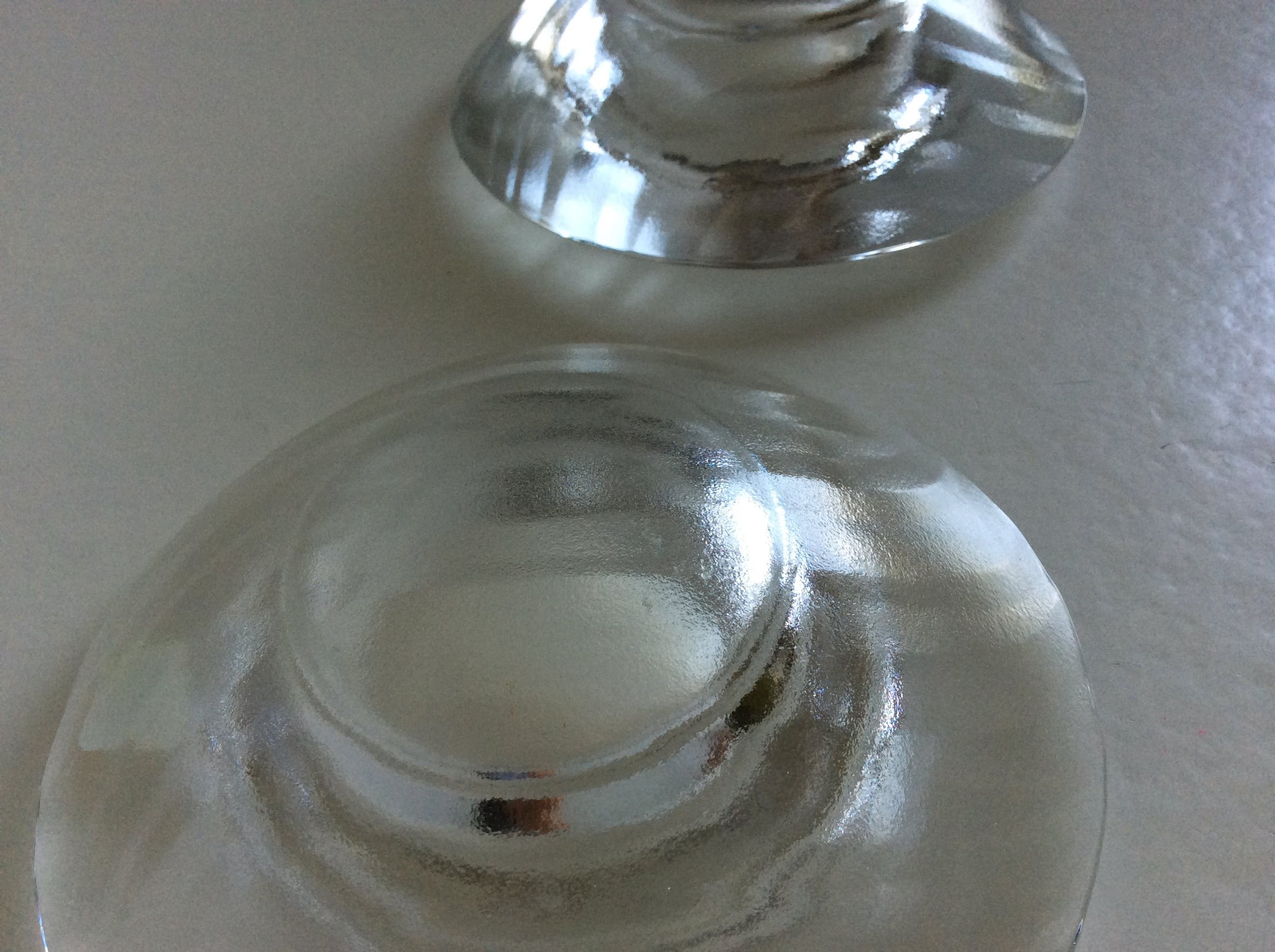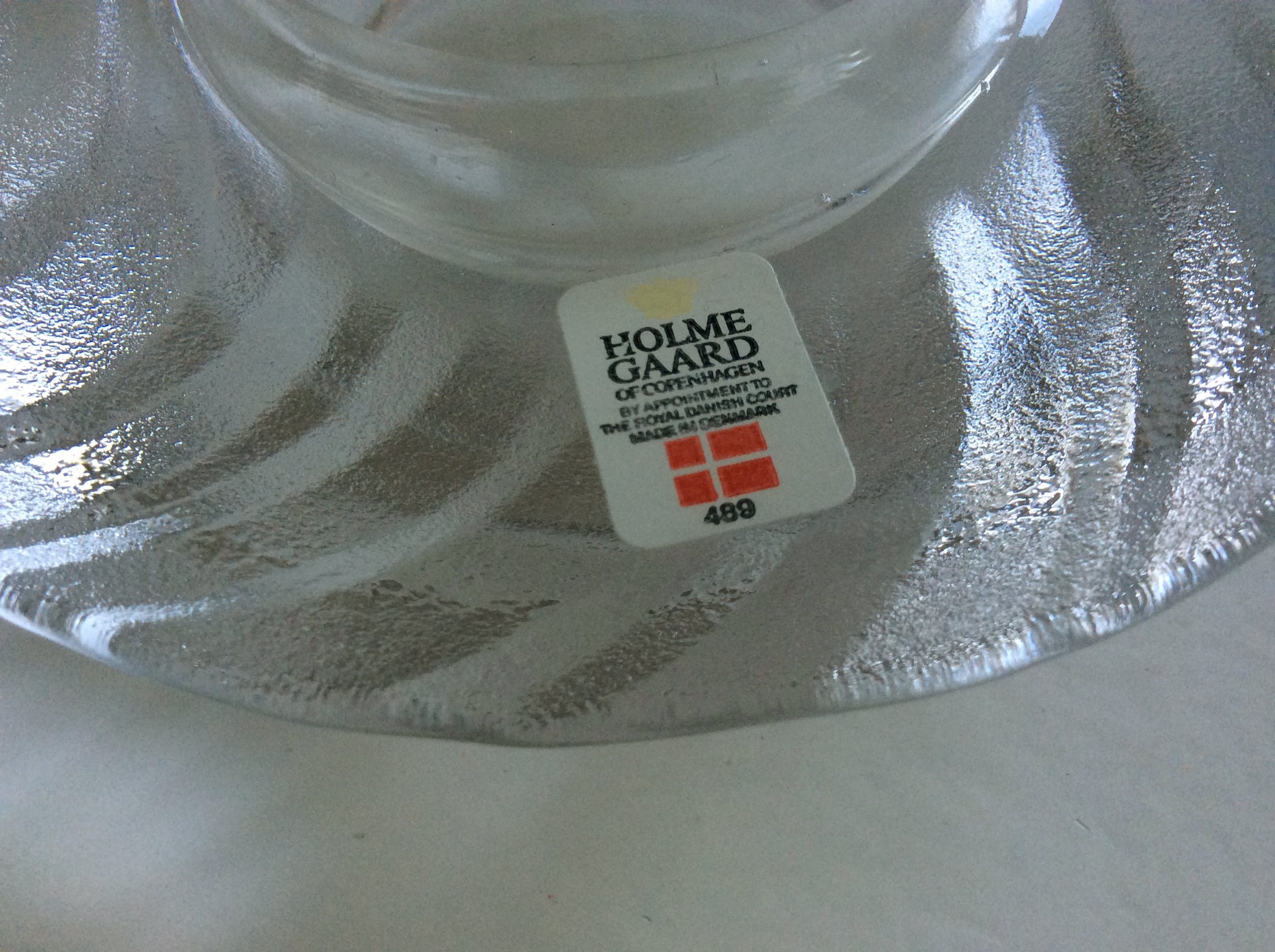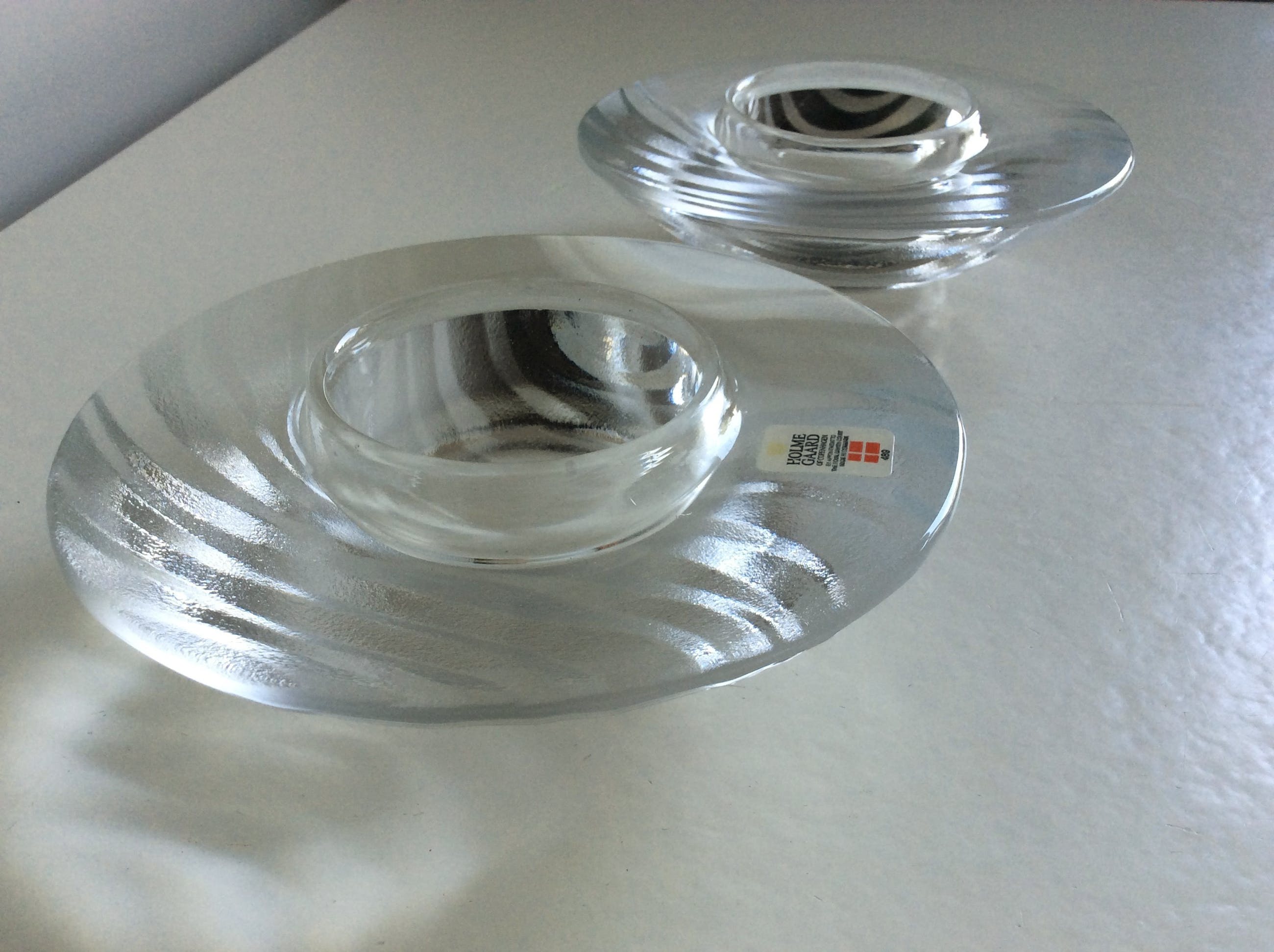 Set van 2 kristallen votives (waxinehouders) van Holmegaard met zebra/swirl motief.Een object heeft originele sticker van Holmegaard. Eind 20e eeuw.Afm.; hoogte 4,5 cm; max. doorsnede 13,5 cm. Niet gesigneerd, in prima conditie.