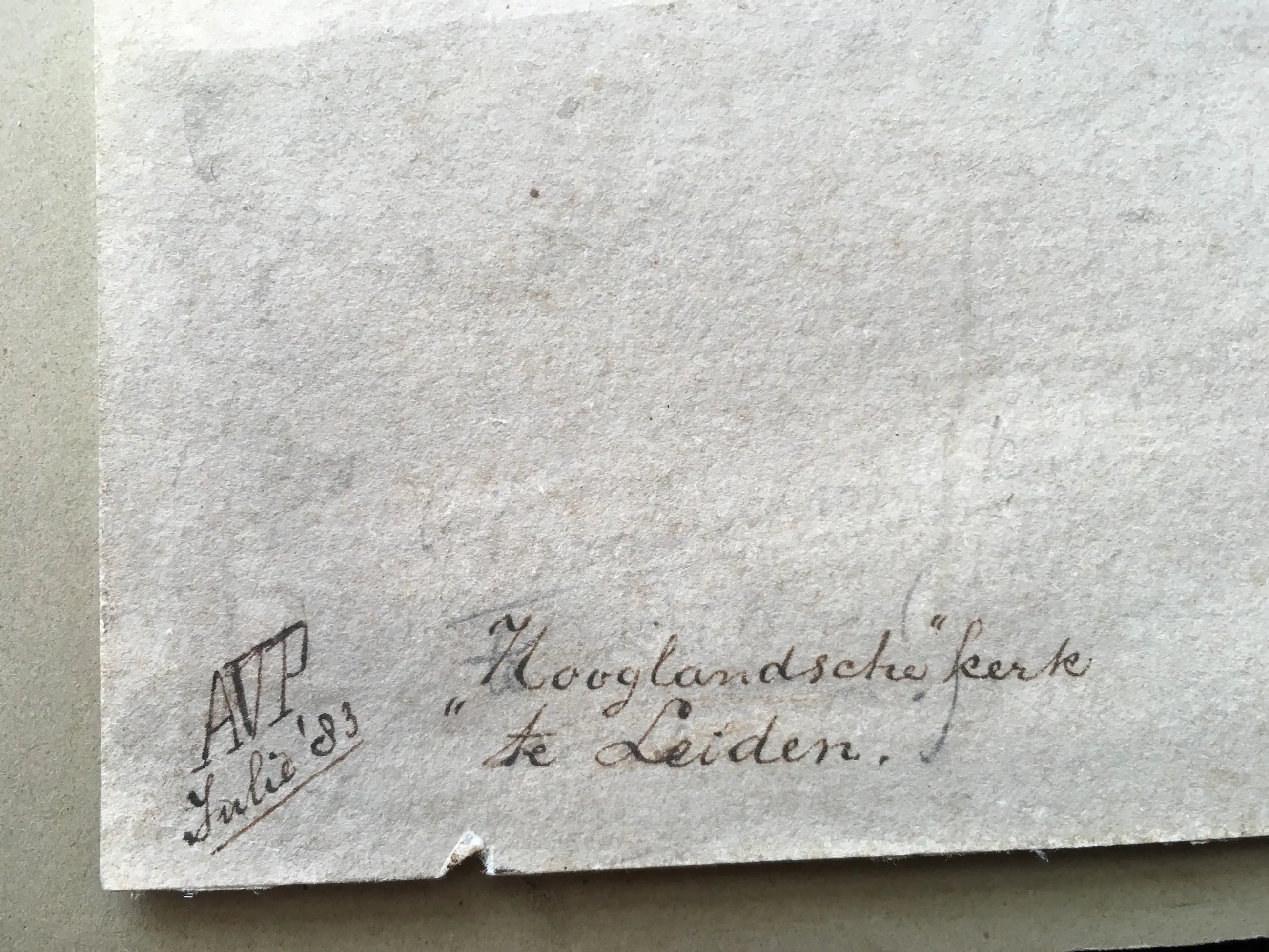 Potloodtekening van de Hooglandsche kerk in Leiden, van juli 1883. Gesigneerd met AVP, wat Anne van Prooijen zou kunnen zijn maar dat is niet zeker. De tekening is in heel goede staat.