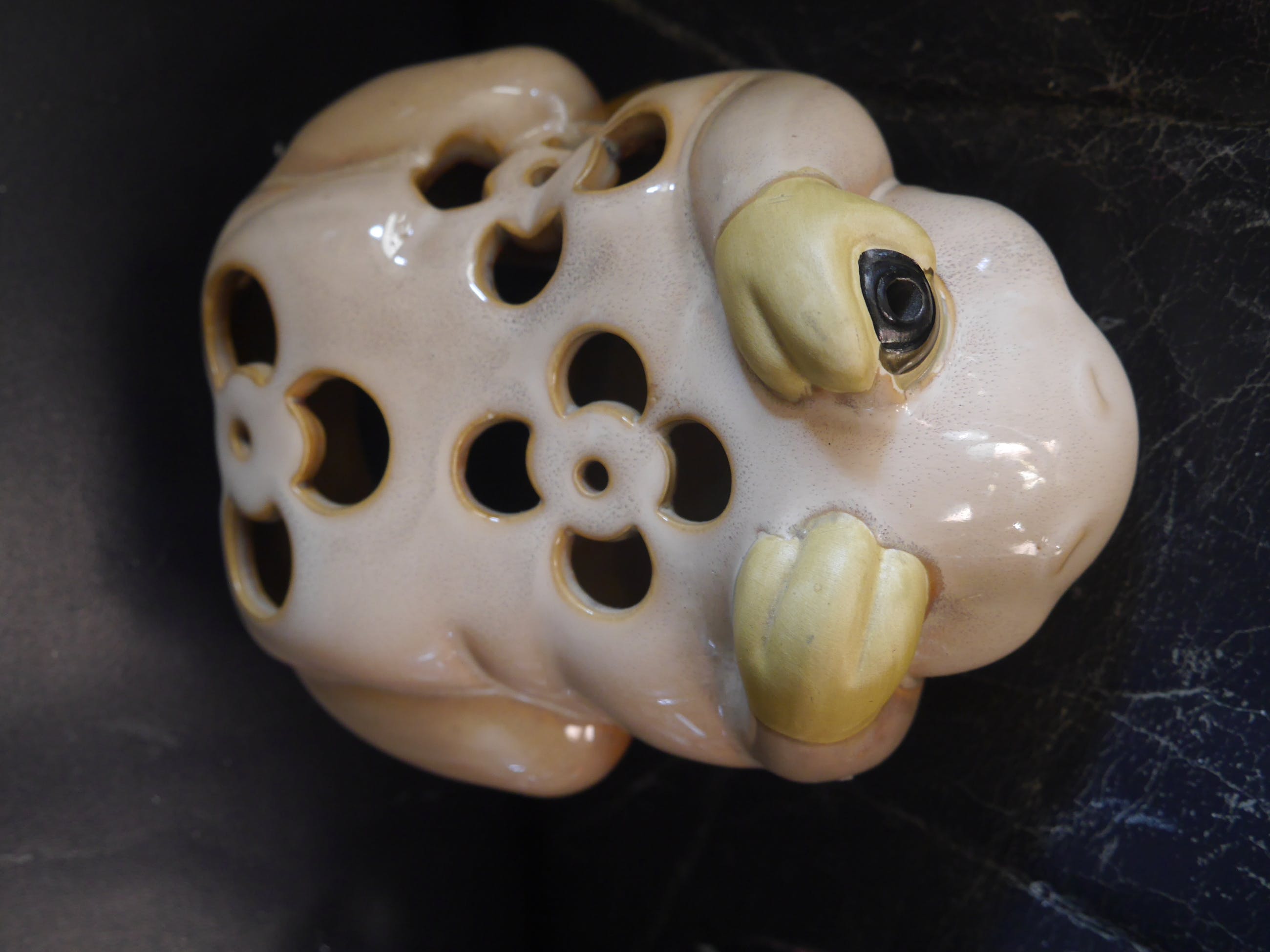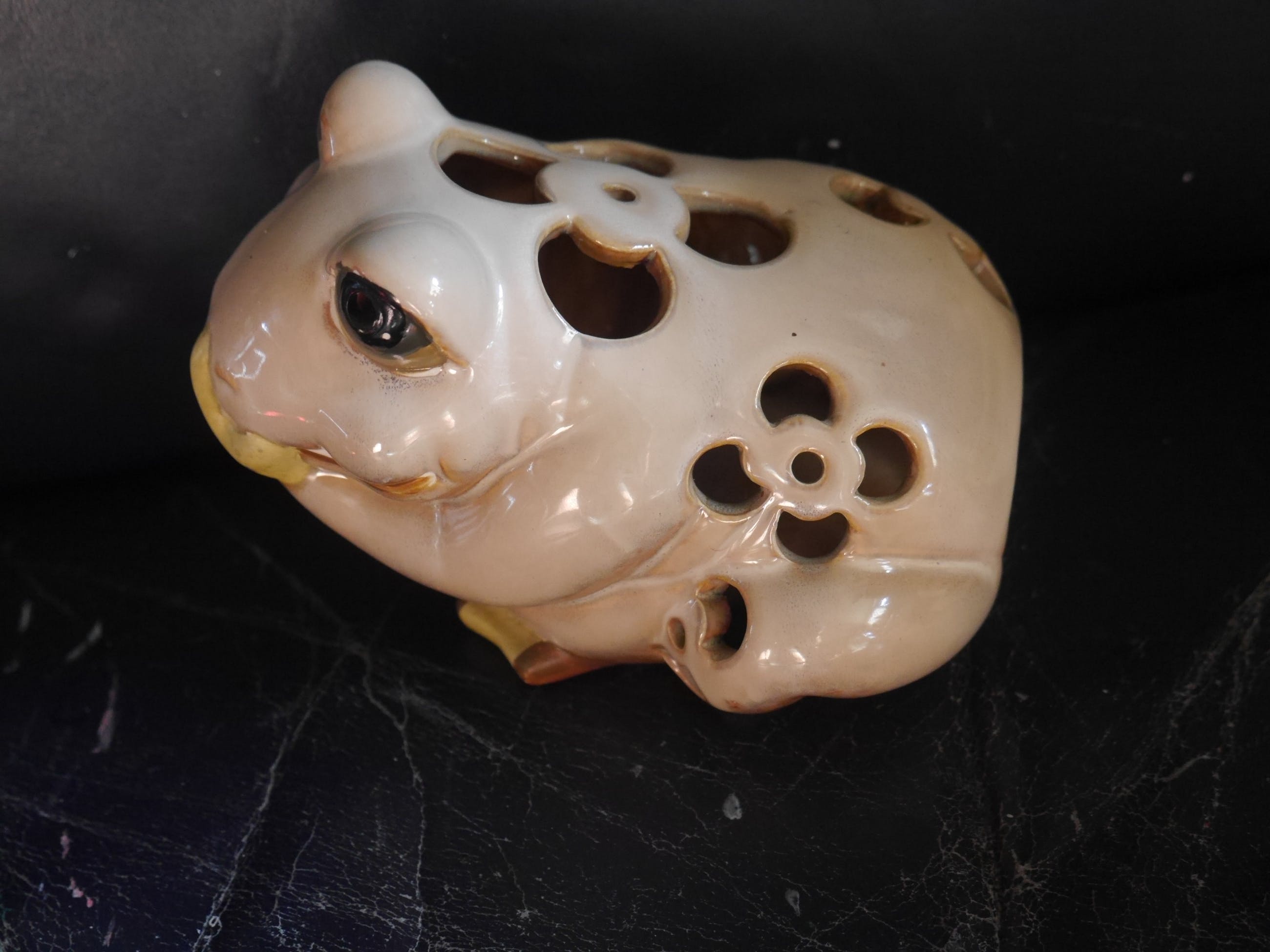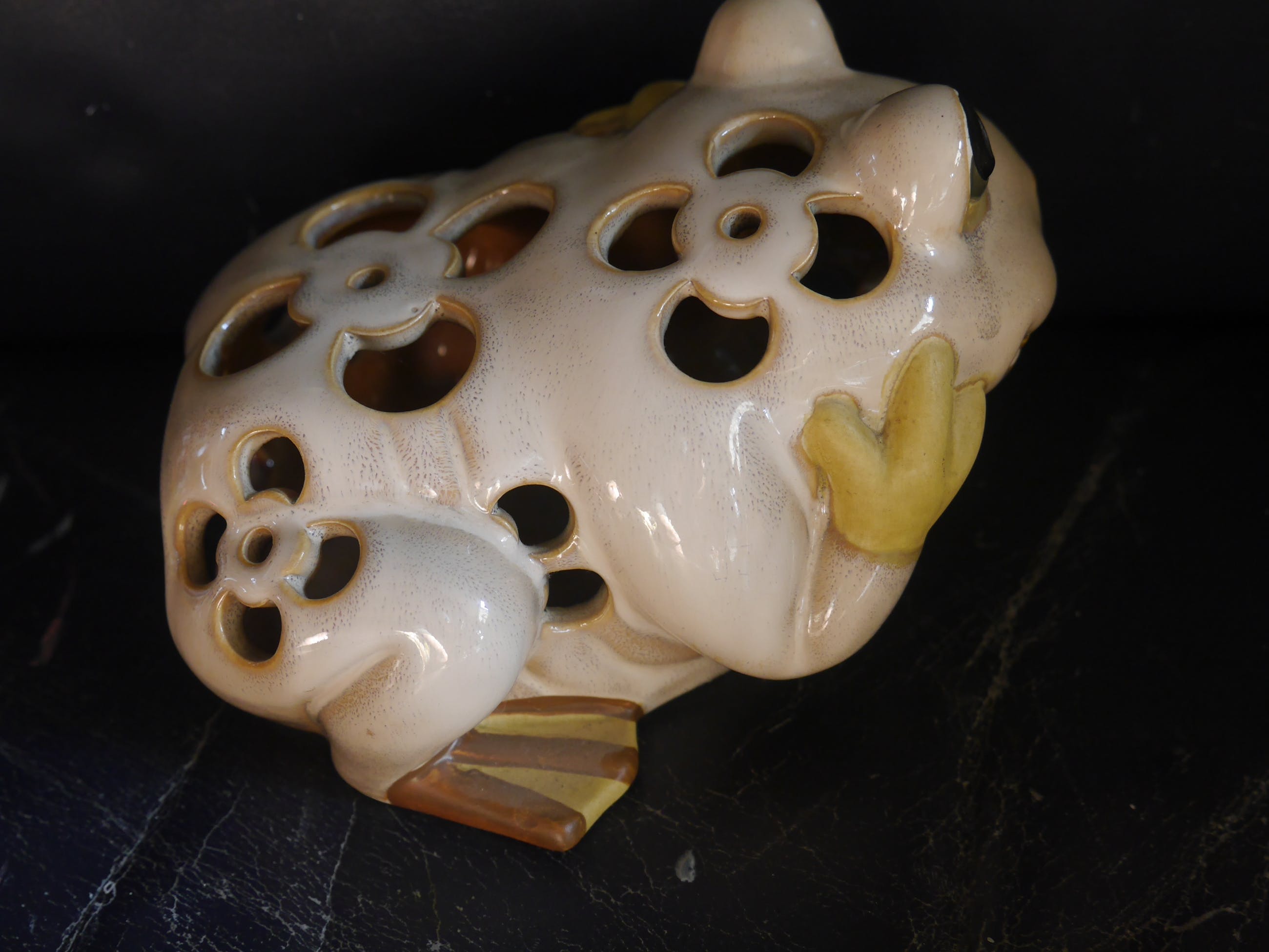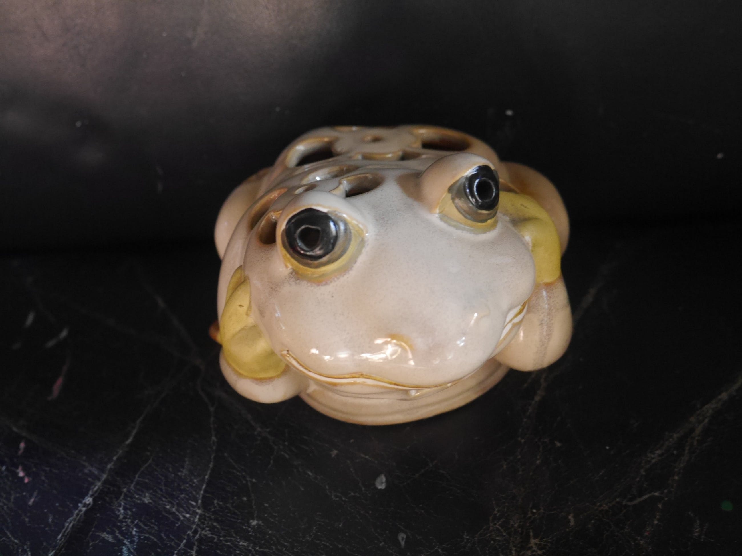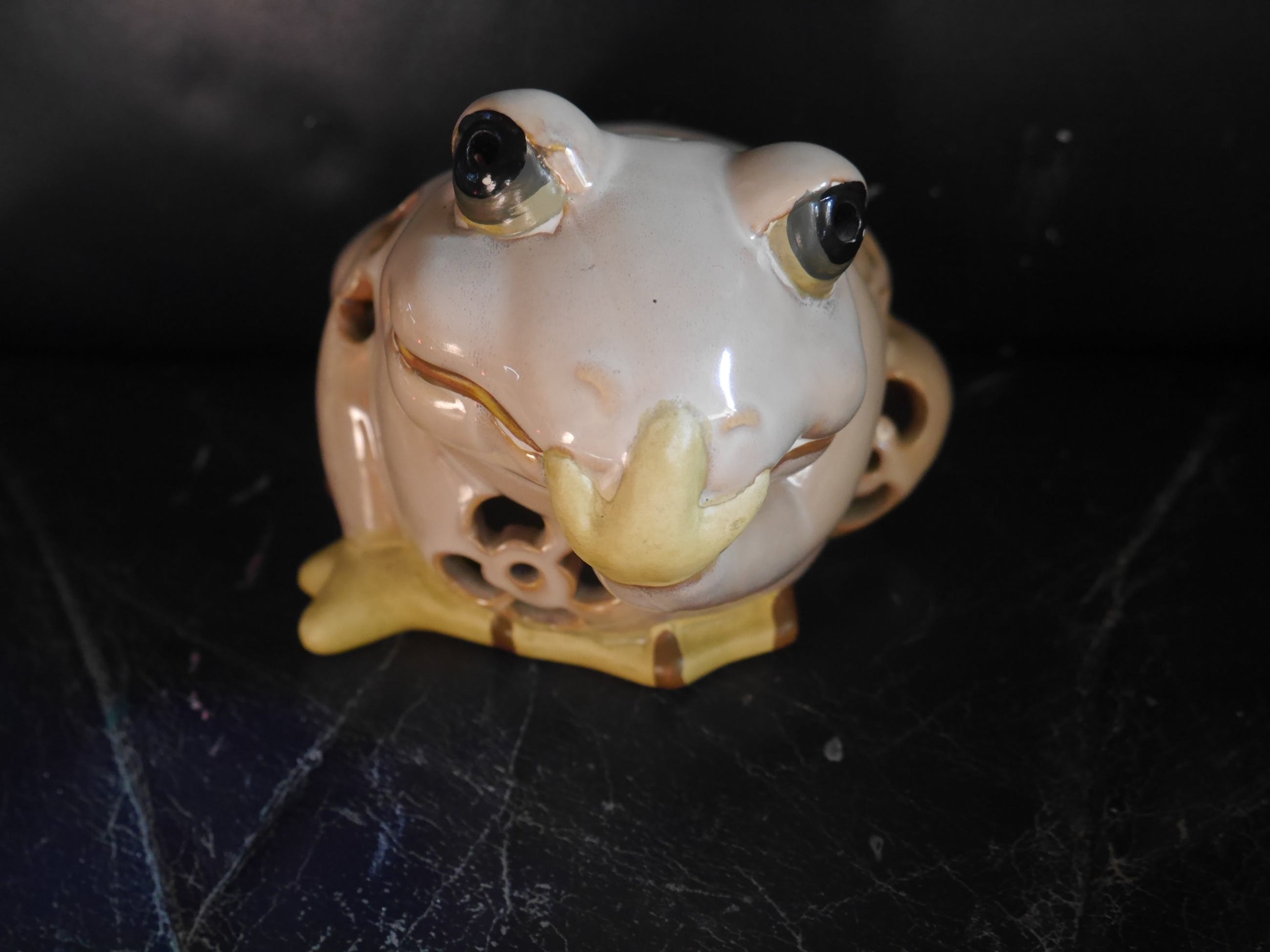3 tuinkandelaars van aardewerk of keramiek . horen zien en zwijgen in de kikker variant. voor waxinelichtjes.