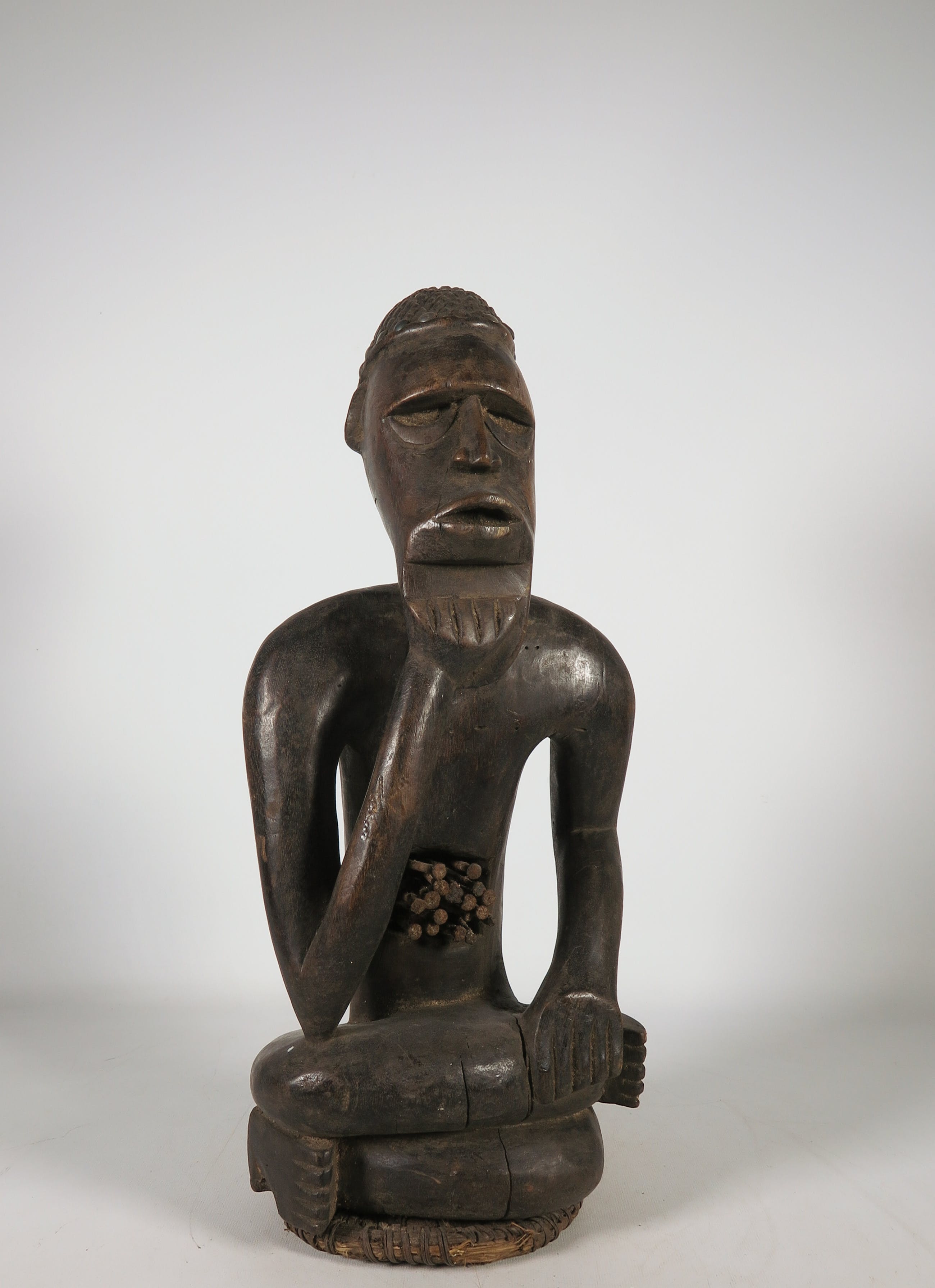 Mediterende mannelijke figuur, zijnde een mediterende clan ouderling. Gat in de buik met ijzeren spijkers en spijkers om het hoofddeksel.
