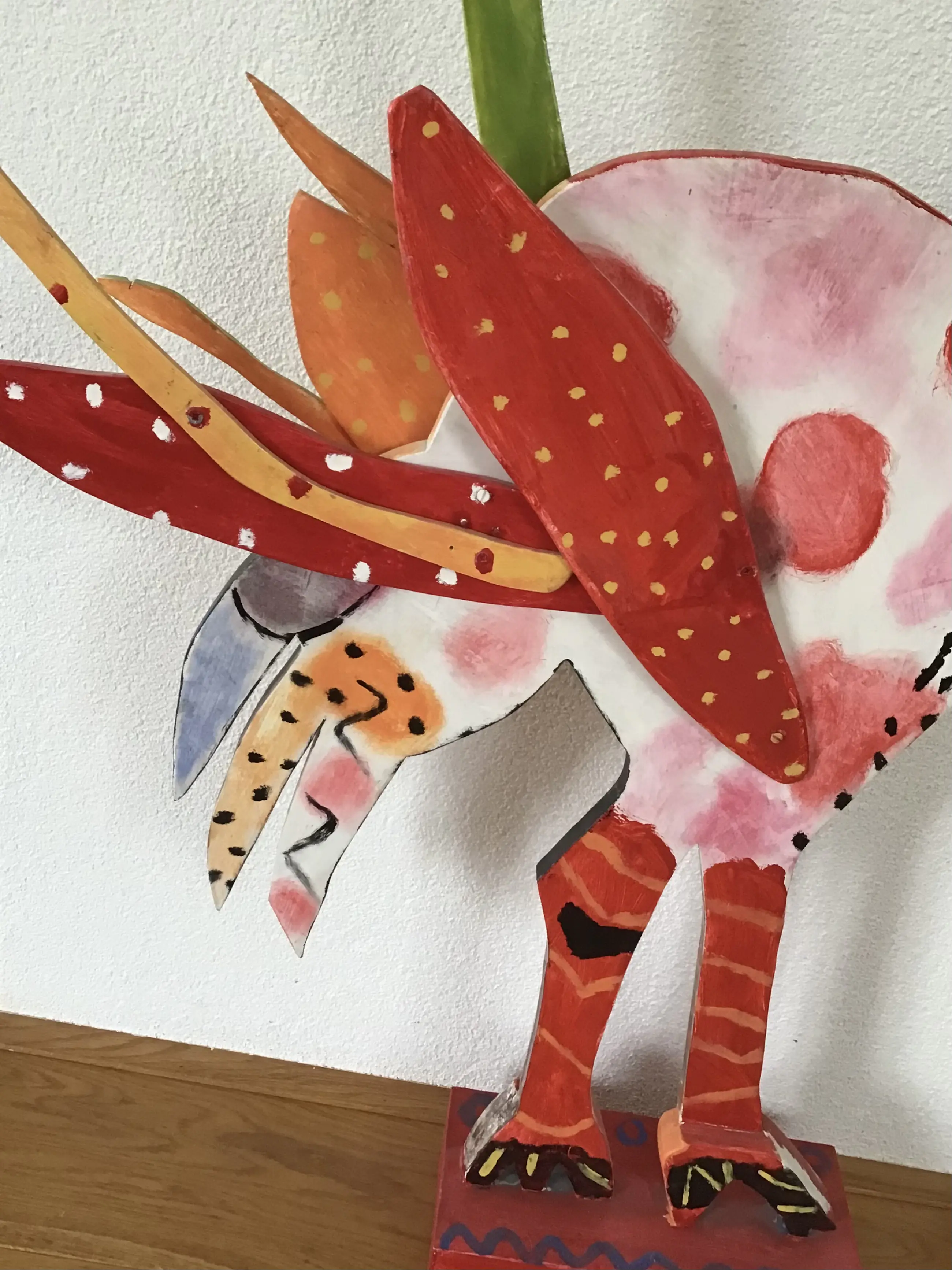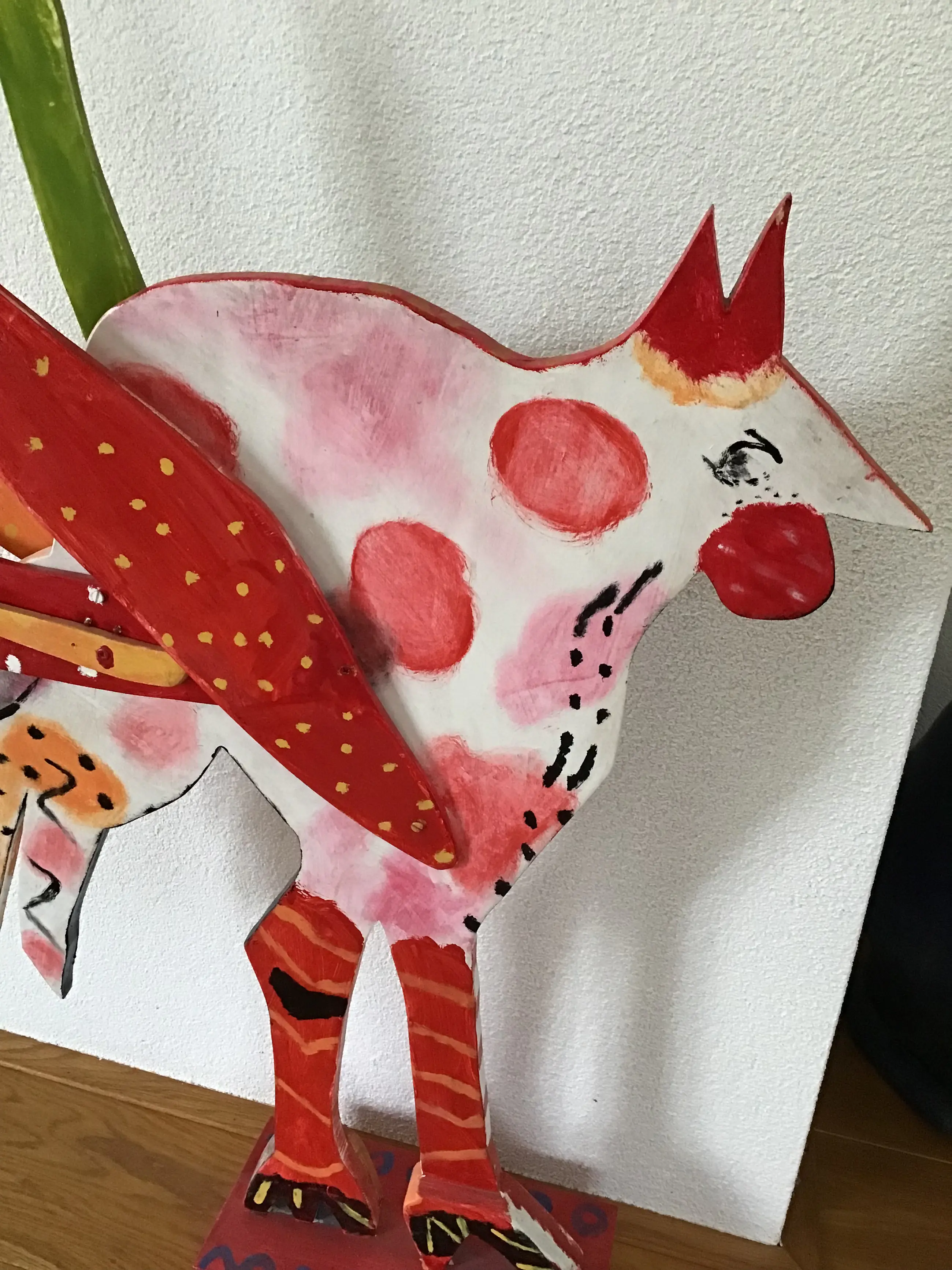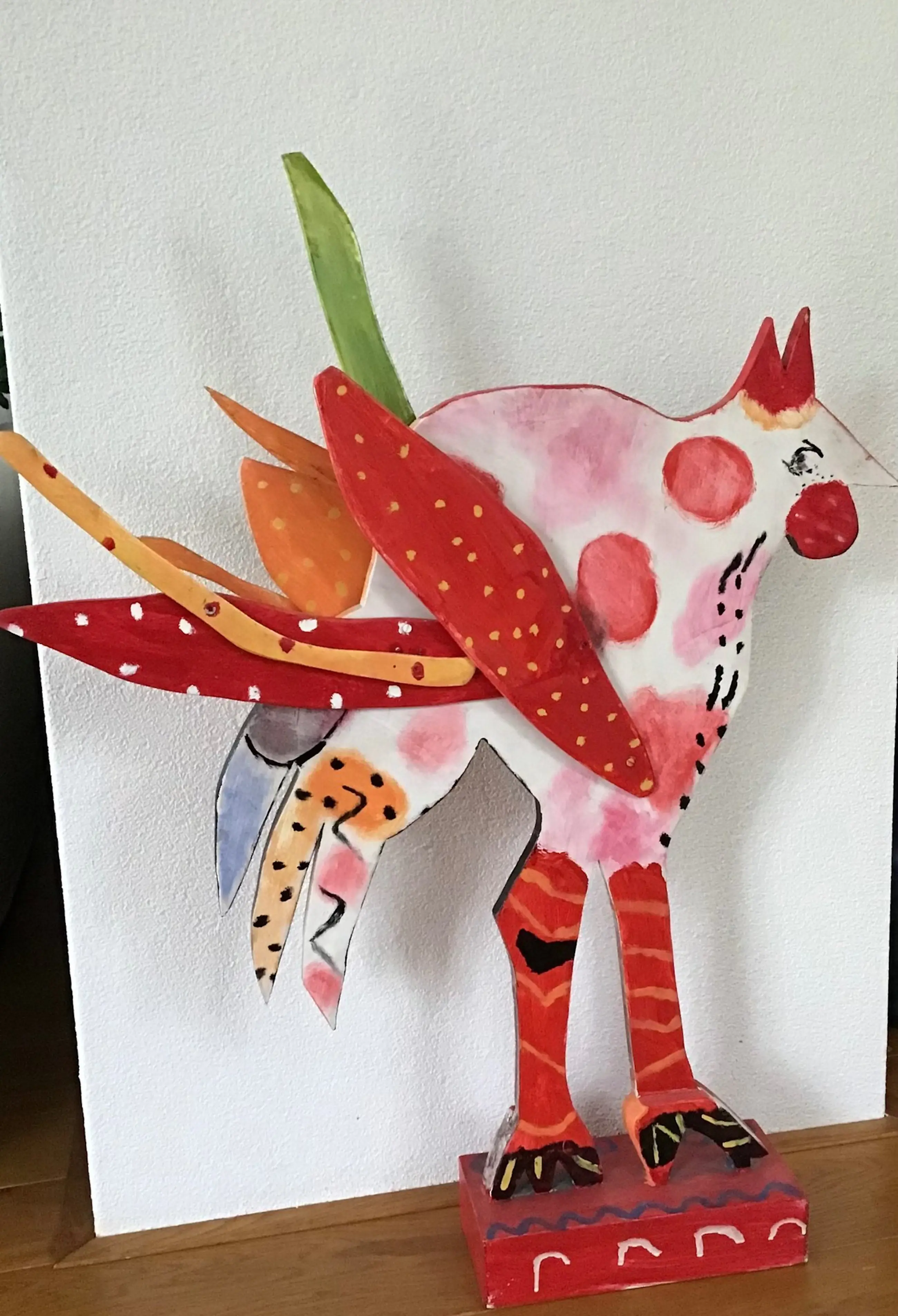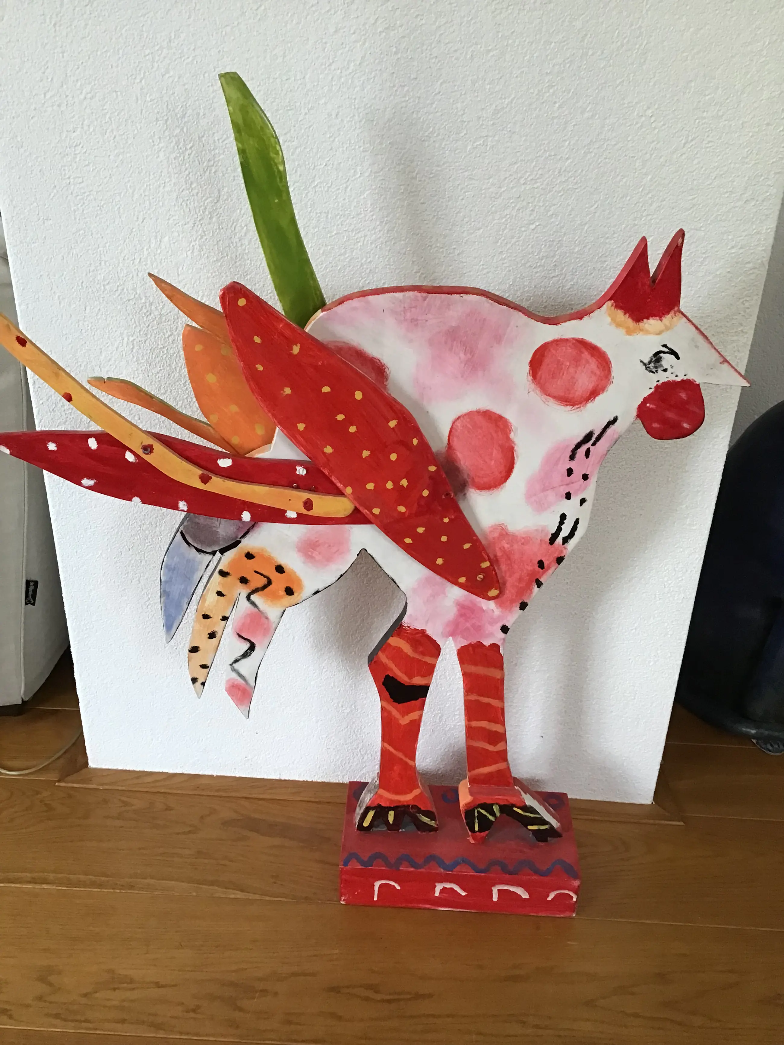 Kleurrijke houten sculptuur van vogel (kip)? naar Dominque Chan 2 verschillende kanten Hoogte 98 cm Breedte 73 cm Staat op sokkel Conditie goed Liefst ophalen