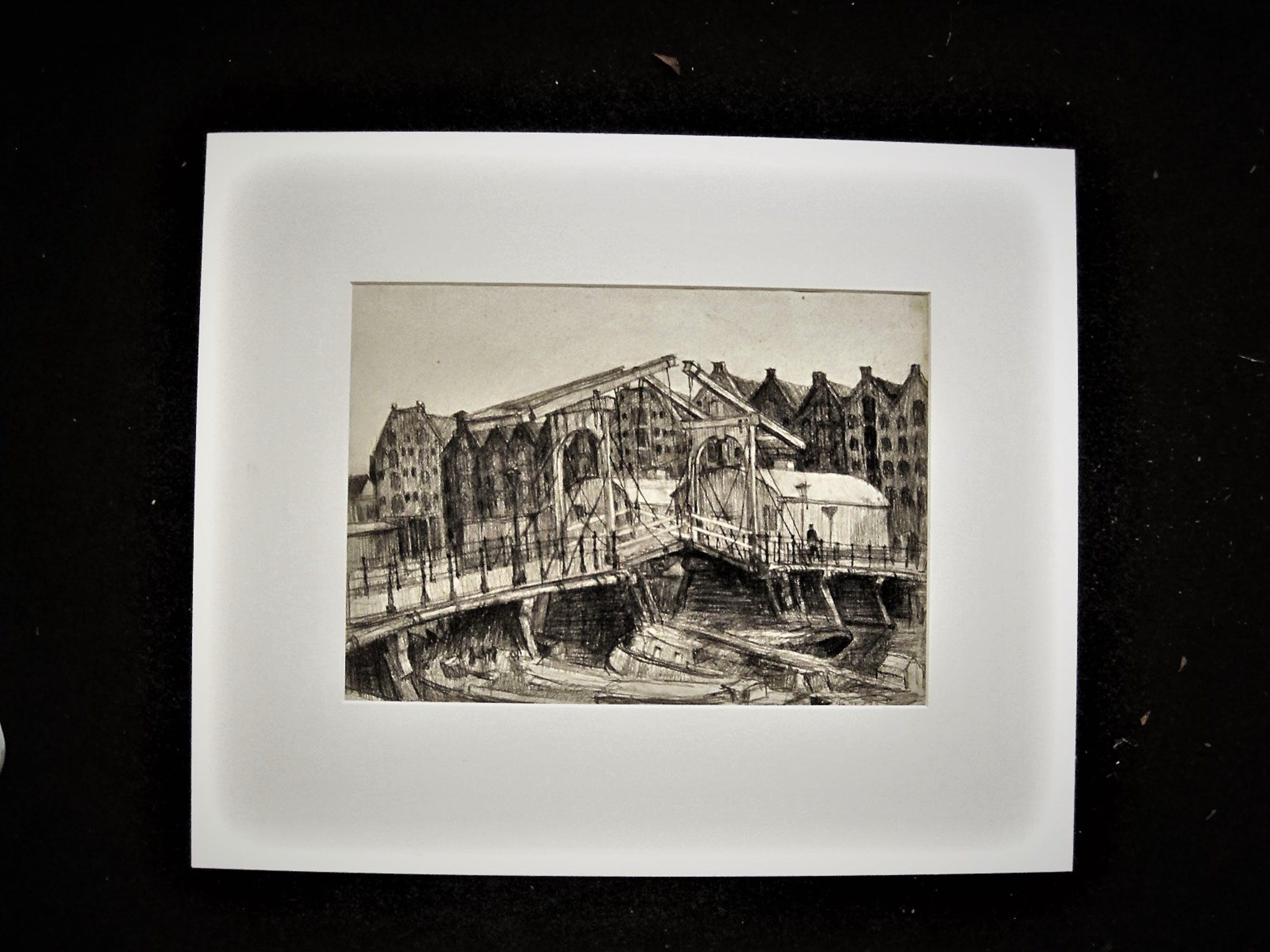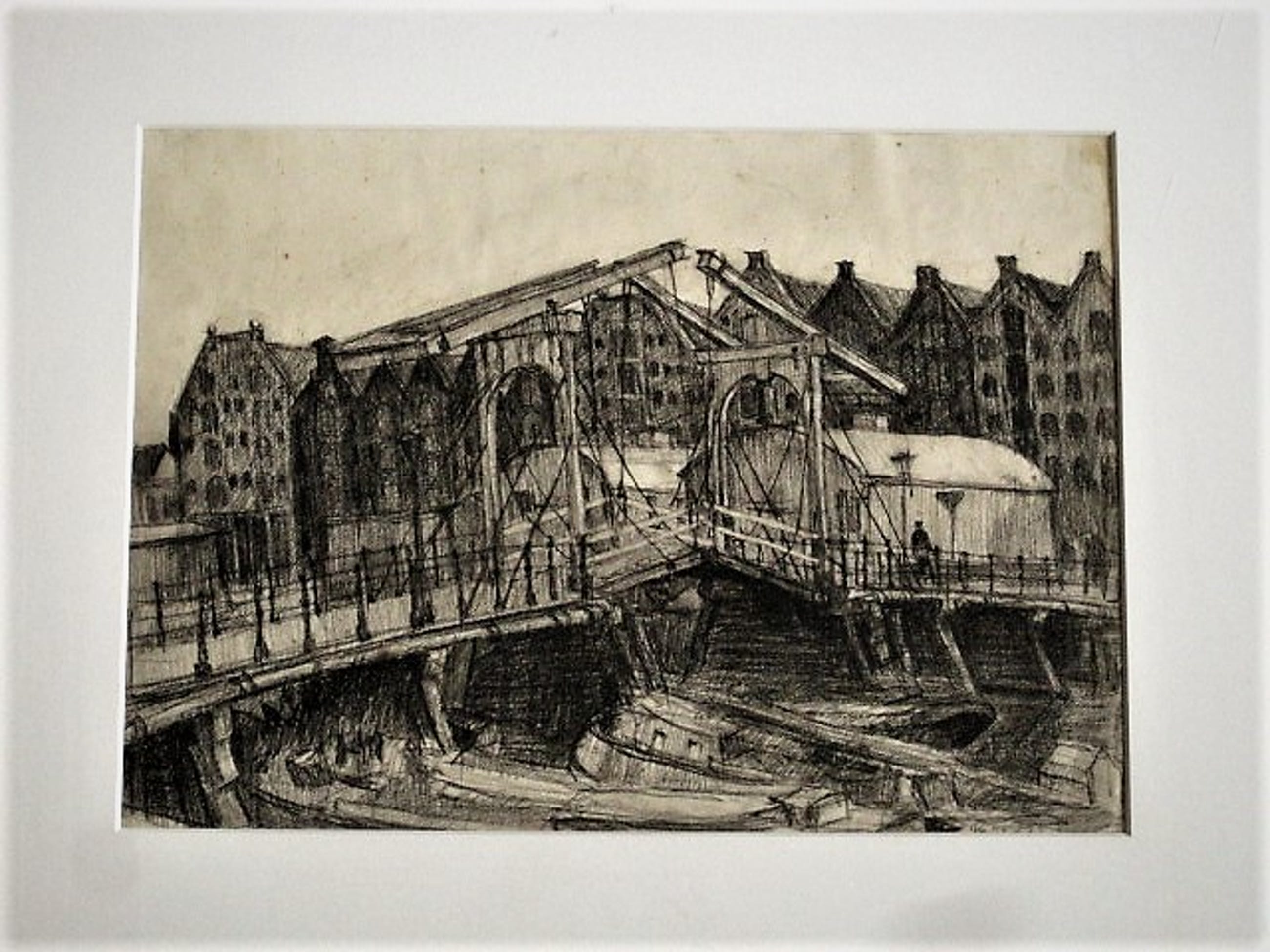 Mooie, omstreeks 1920/1930 te dateren Houtskool op papier tekening met voorstelling van een Amsterdams stadsgezicht "het Prinseneiland met de Drieharingenbrug". Deze grote Houtskool op papier tekening verkeert in goede staat, behalve een lichte verkleuring rechtsboven (tegen passe partout aan). Afmetingen van het papier zijn ca. 30x40cm (HxB). Inclusief passe partout zijn de maten 50x60cm. Herkomst : kunsthandel Ariens Kappers / nwe Spiegelstraat Amsterdam.