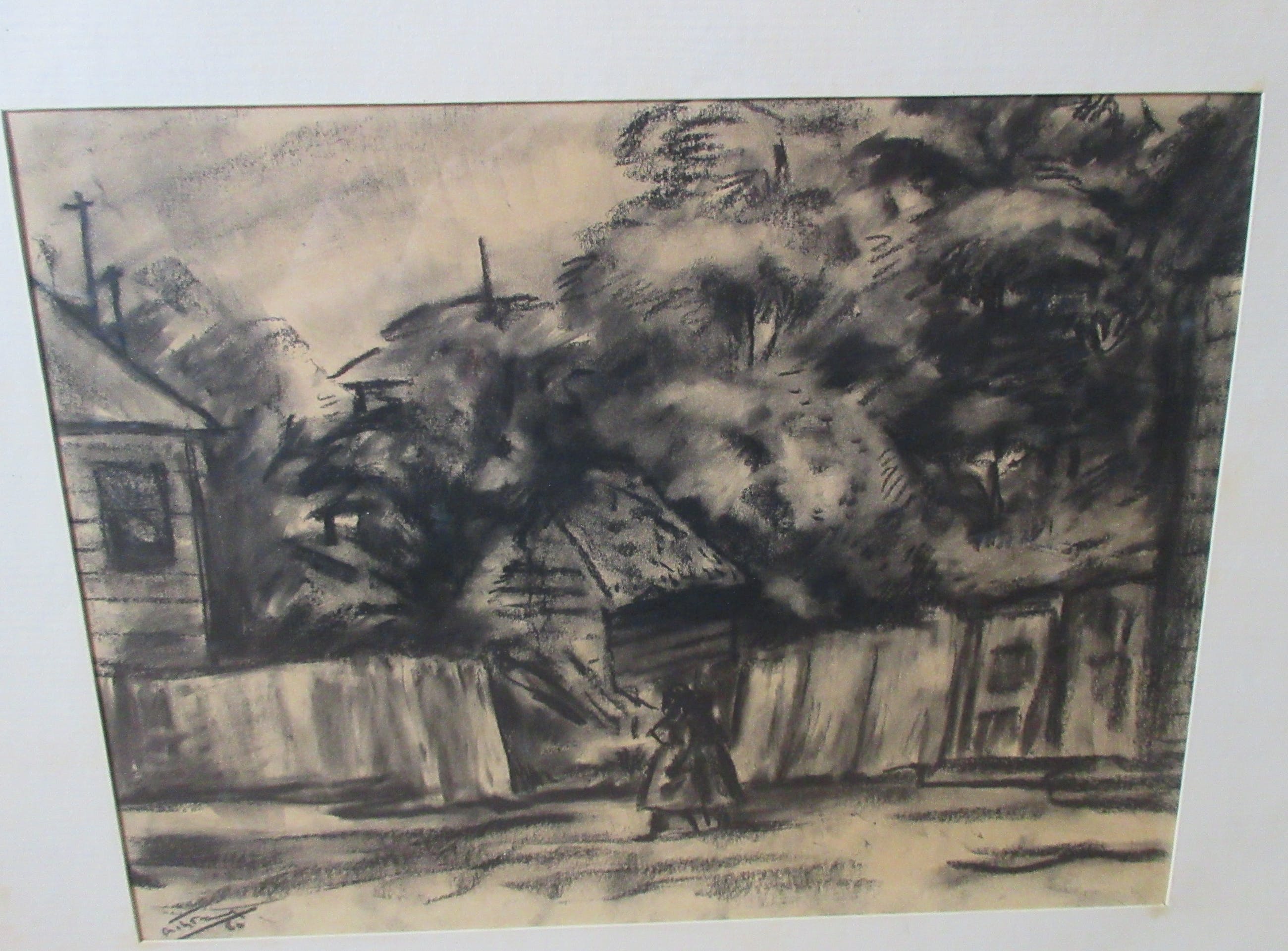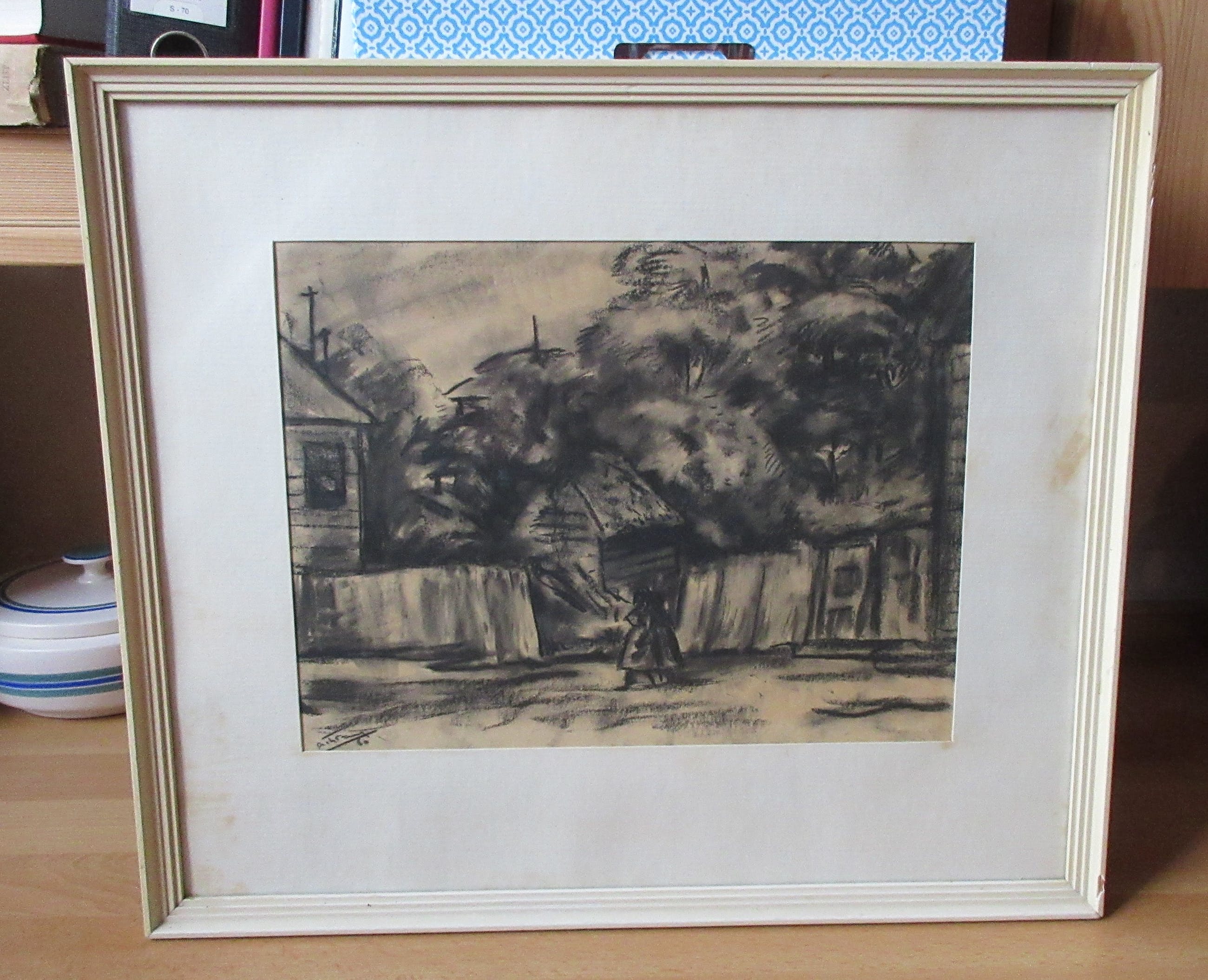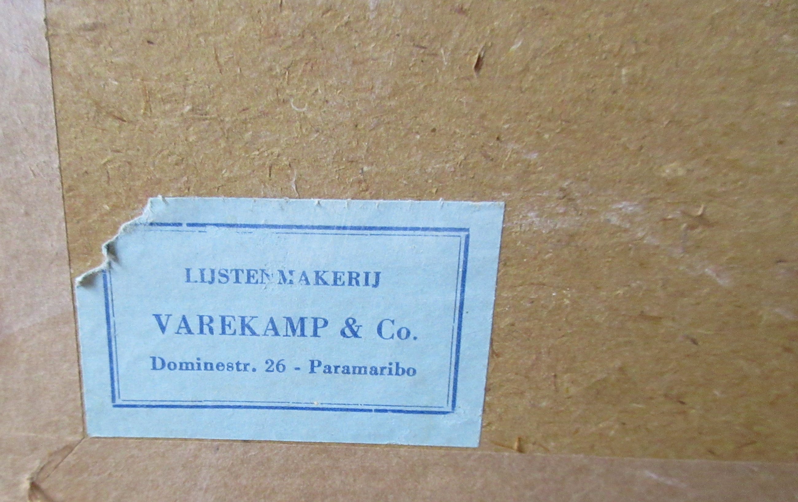 Houtskool tekening Surinaams landschap of straatje - gesigneerd. Linksonder gesigneerd Rik Cramer(s) of Cremer(s)?? Aan e achterzijde voorzien van sticker van lijstenhadel Varekamp & Co uit Paramaribo.