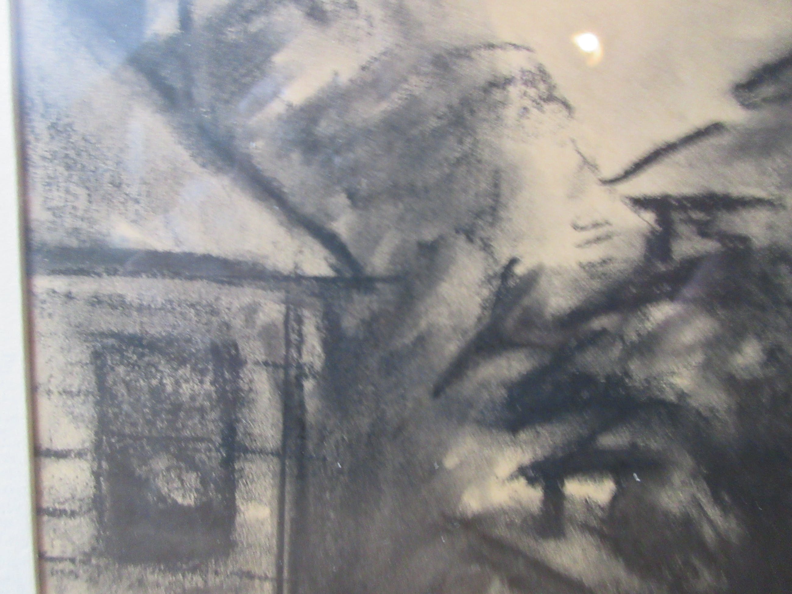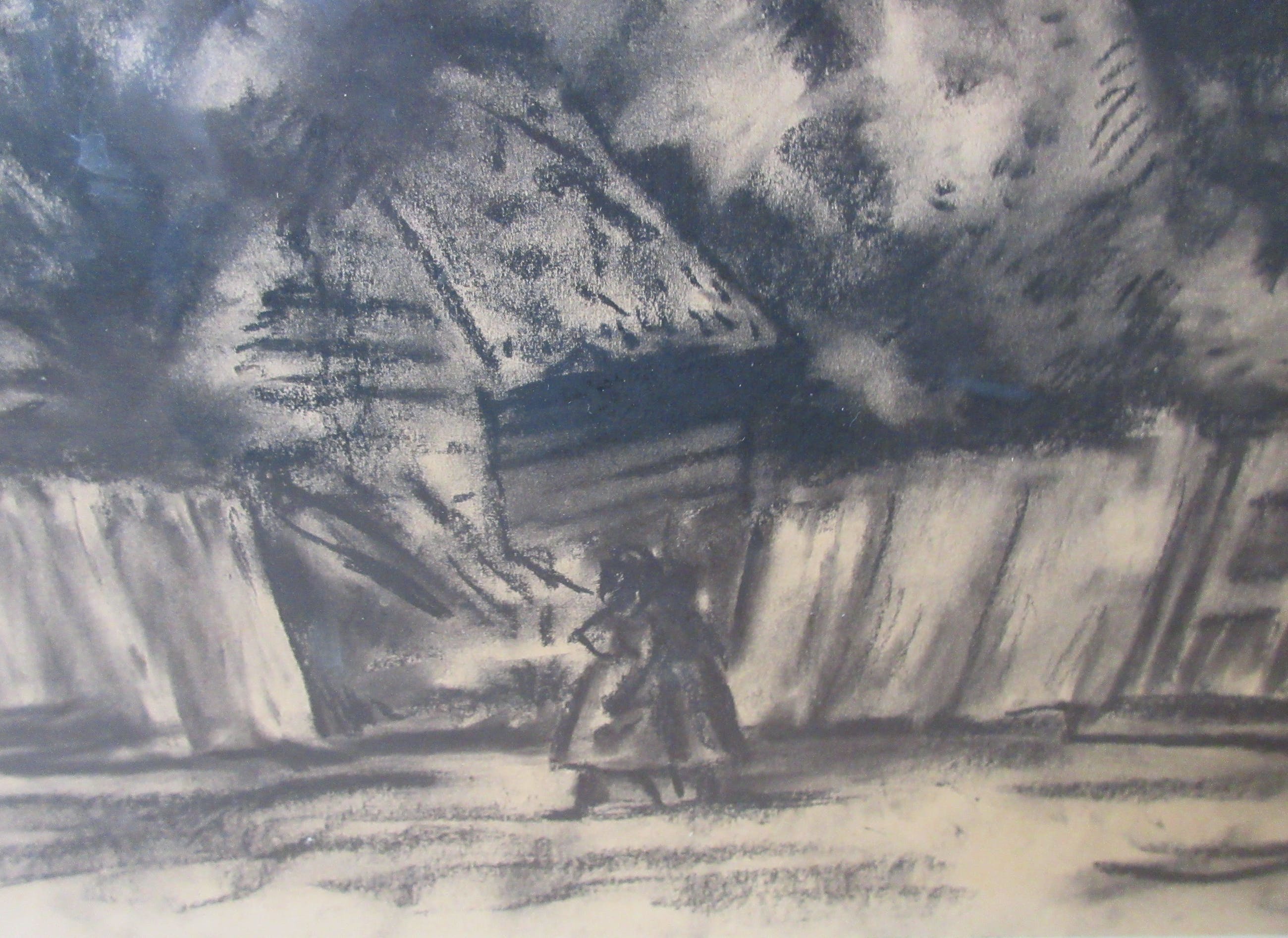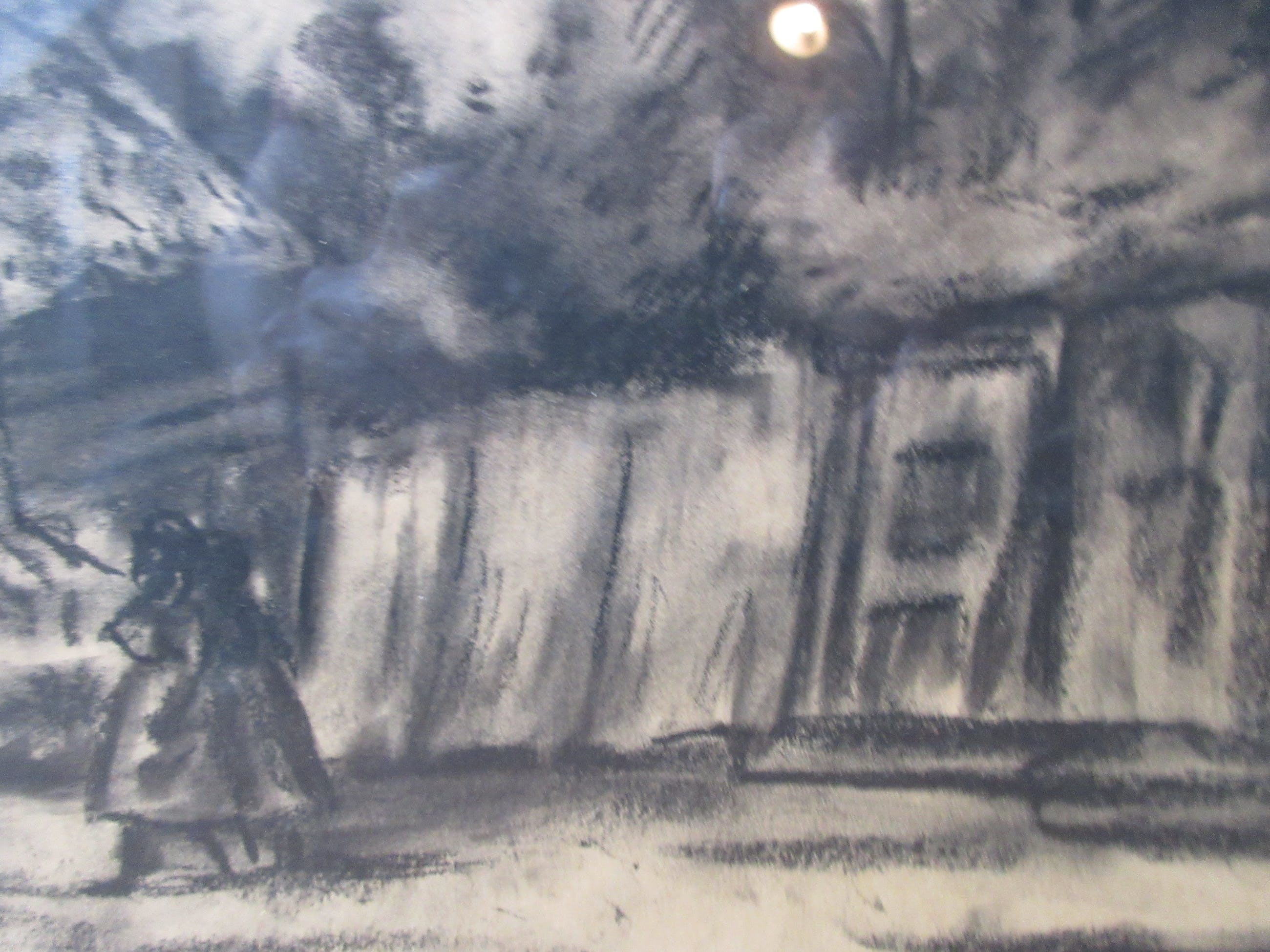 Houtskool tekening Surinaams landschap of straatje - gesigneerd. Linksonder gesigneerd Rik Cramer(s) of Cremer(s)?? Aan e achterzijde voorzien van sticker van lijstenhadel Varekamp & Co uit Paramaribo.