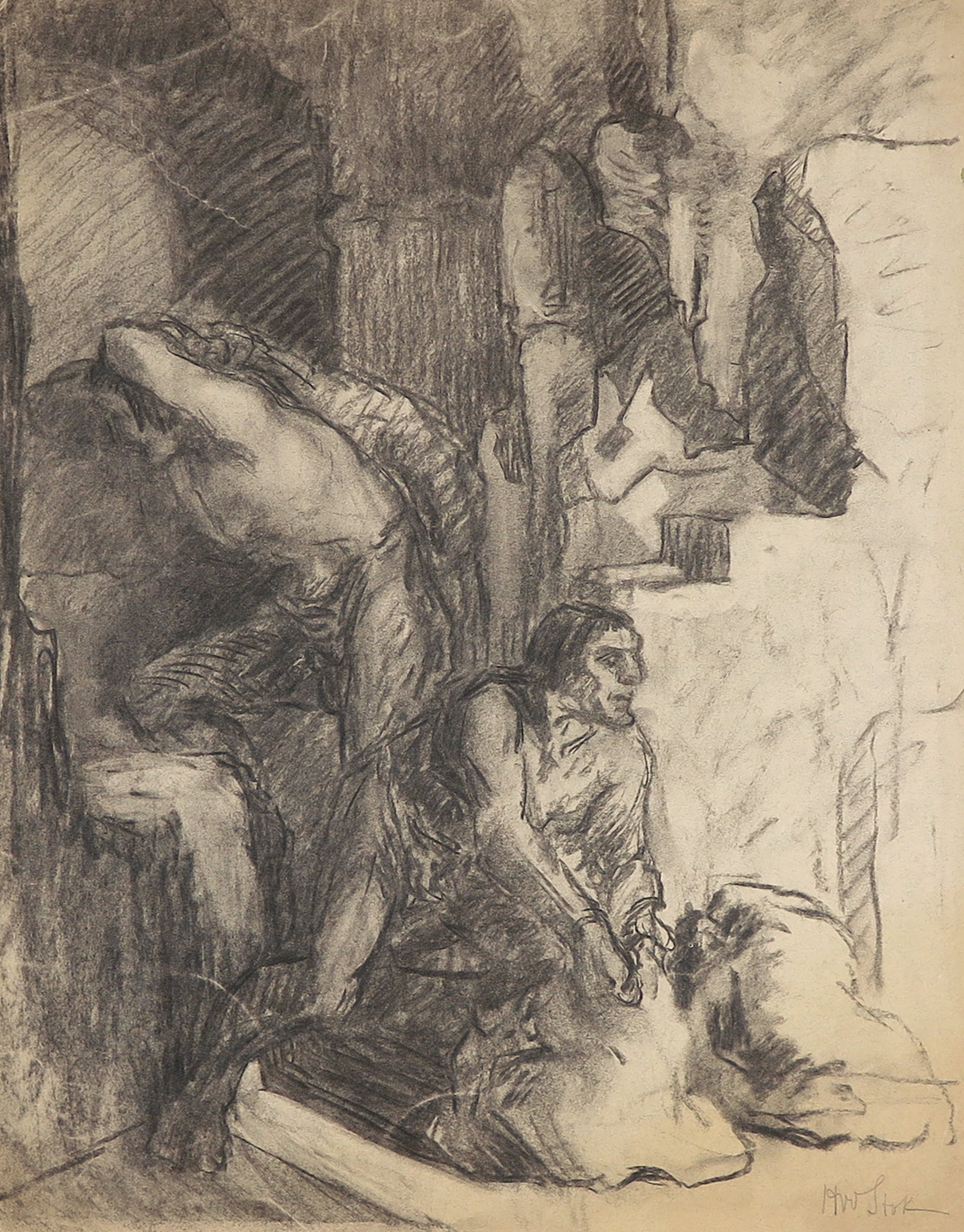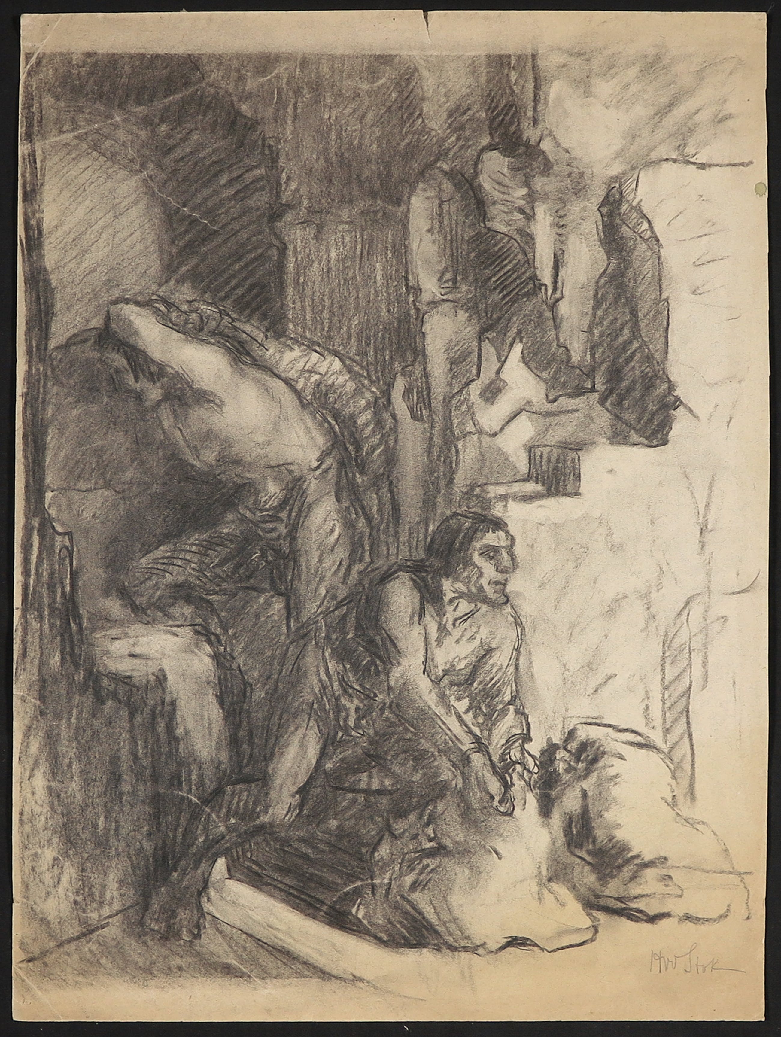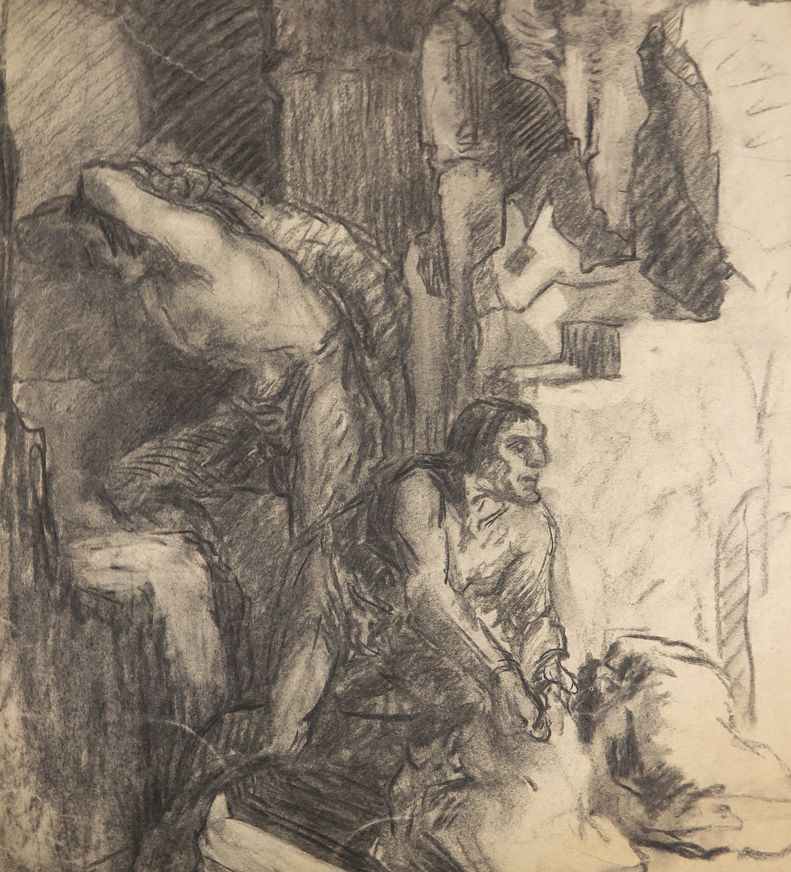 Niet of onleesbaar gesigneerd - Houtskooltekening, Twee figuren in een grot kopen? Bied vanaf 1!