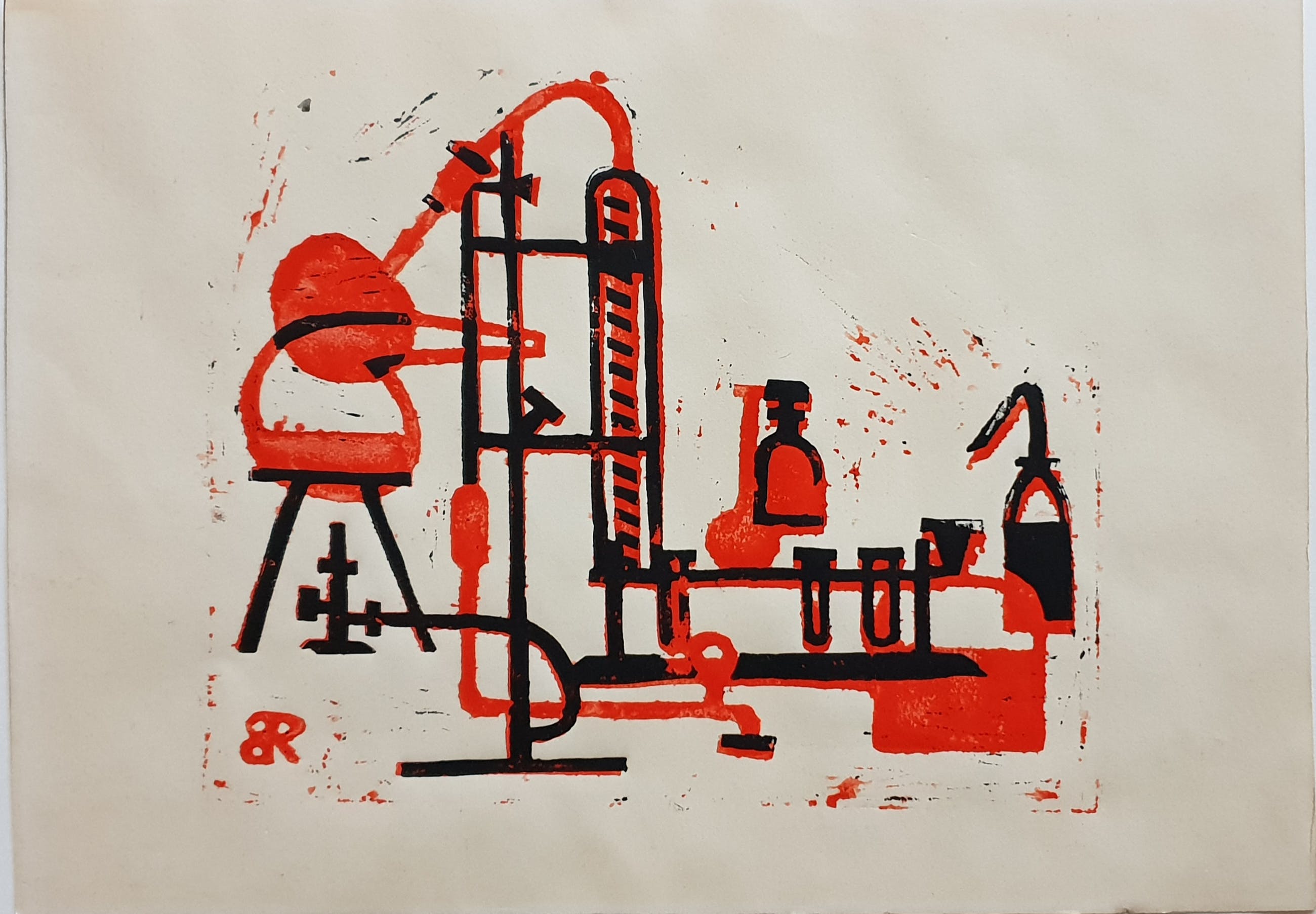 Onbekende monogramHoutsnede laboratorium materiaalPapiermaat 19,50 x 28,50 cmBeeldmaat 16 x 19 cm