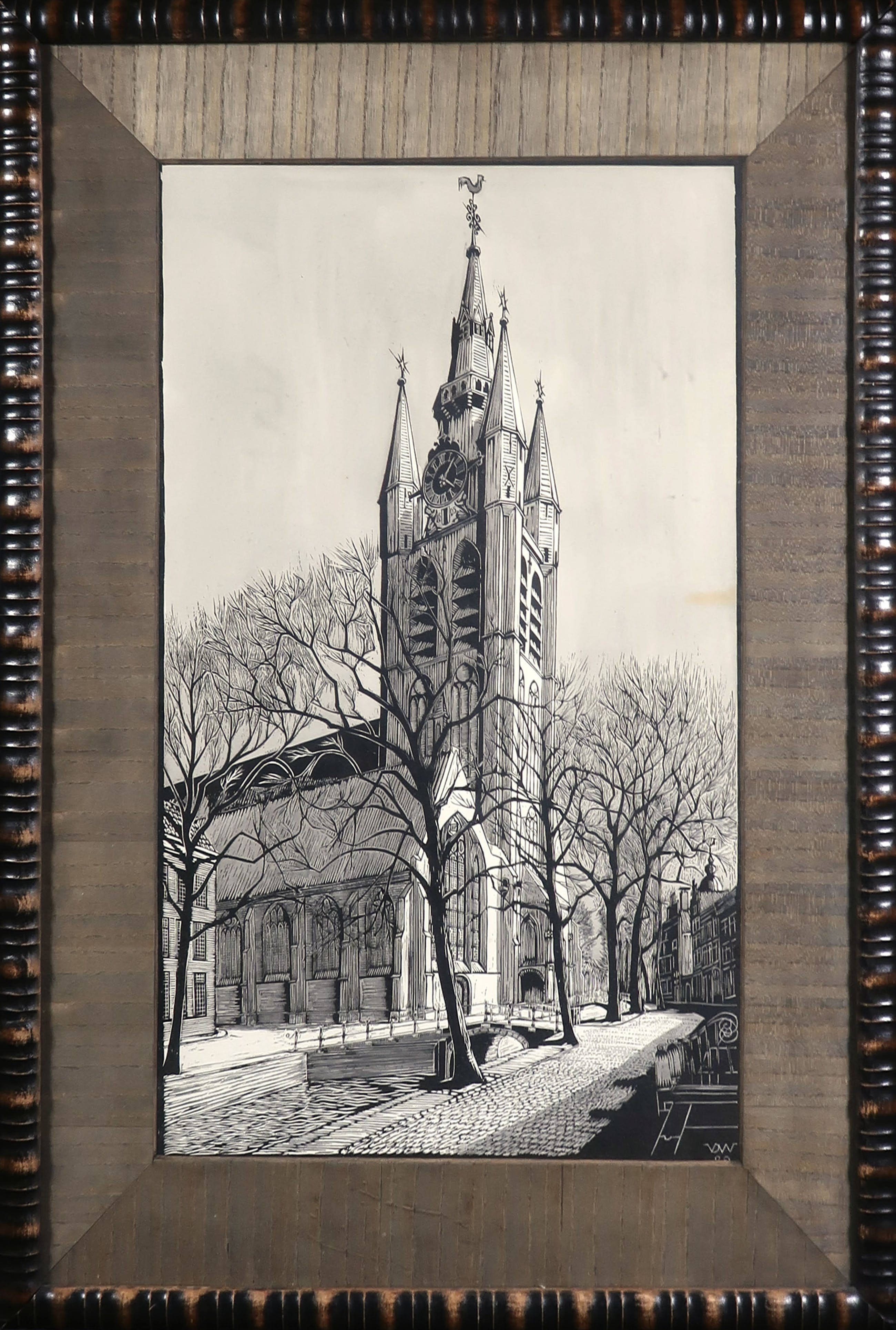 Niet of onleesbaar gesigneerd - Houtsnede, Oude kerk te Delft - Ingelijst kopen? Bied vanaf 1!