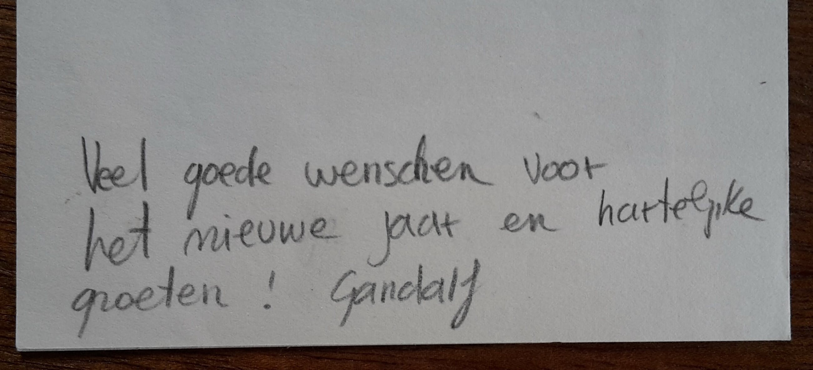 kleine houtsnede op japans papier, blad 18 x 12 cm; geplakt binnen omslag van dun papier met passepartout uitsnijding, 21 x 15 cm. Gesigneerd met monogram ("G") en jaartal, nr. 2/20. Op achterzijde omslag handgeschreven nieuwjaarswens, getekend met "Gandalf"; onbekend of dit de kunstenaar is of wie het dan is.
