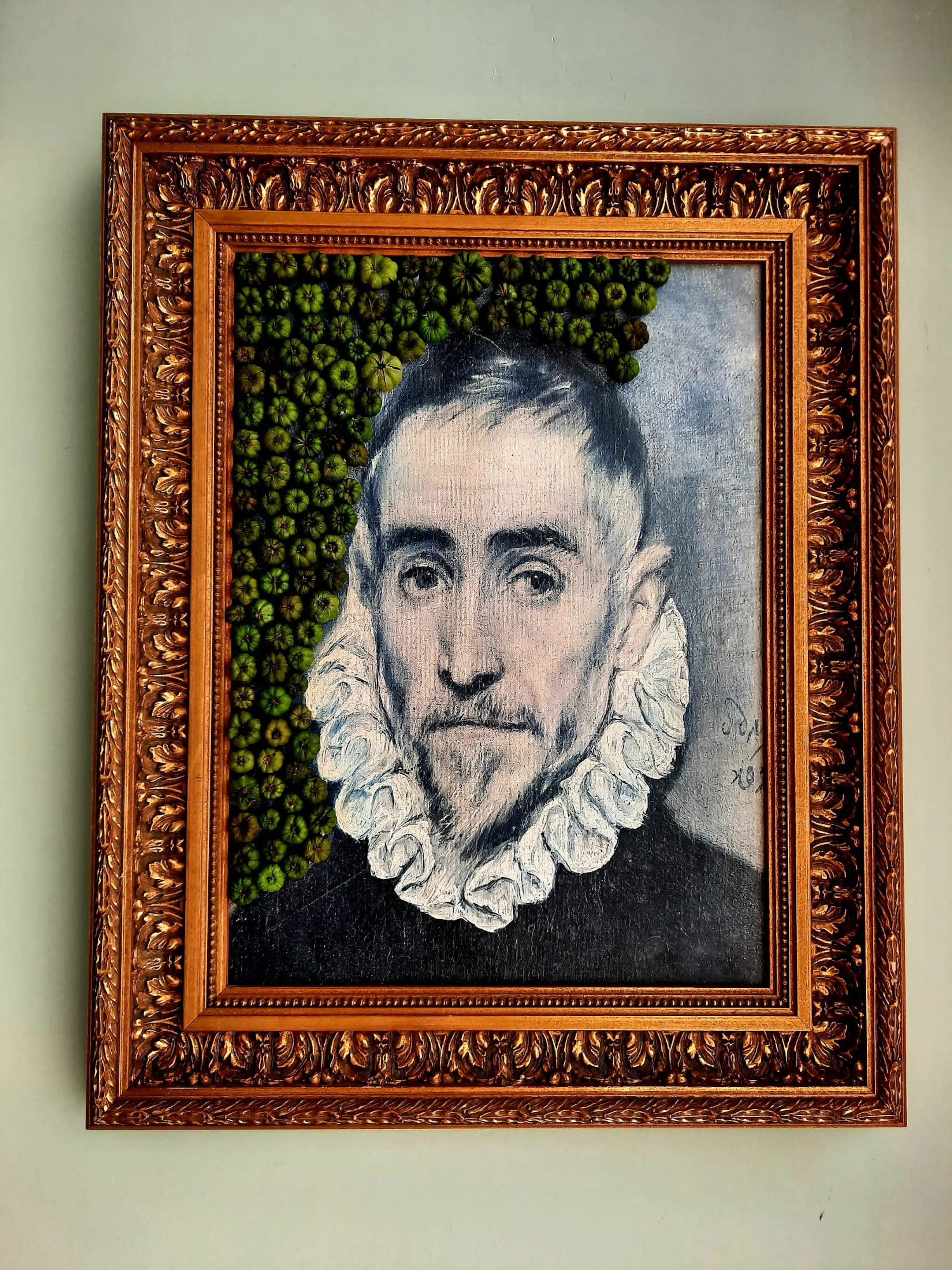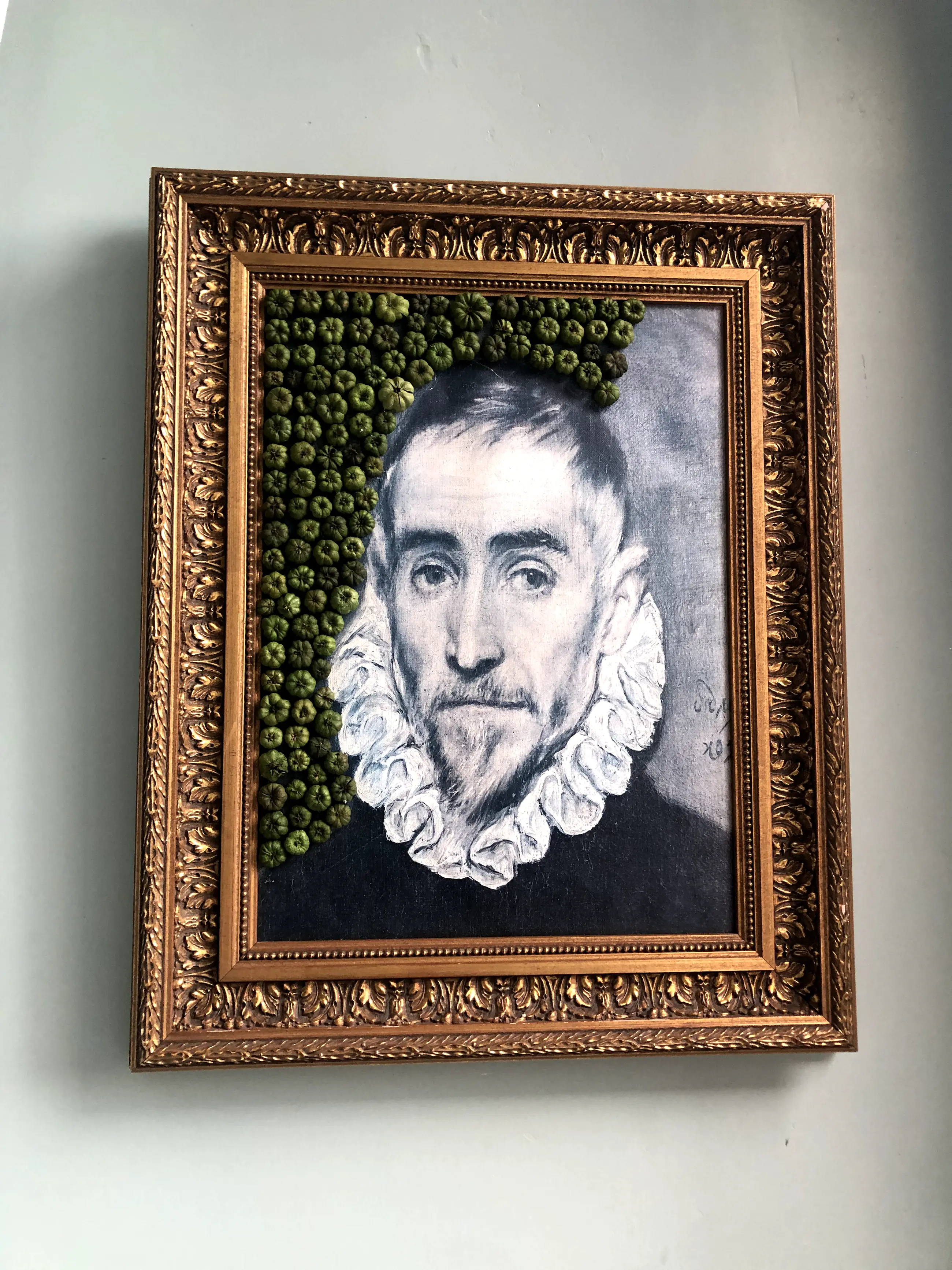 Dit kunstwerk komt van de "L&H-collezione" het is gemaakt van een schilderij die uit de wel vroegere jaren van deze eeuw is geschilderd, daarop allemaal kleine zongedroogde mini pompoenen op gemonteerd met prachtige houten kader. de kunstenaar vertelde ons in het gebrekkelijk engels dat het ging om de man zijn gedachten die rondom hem zijn beeld van de realiteit opslokte.
