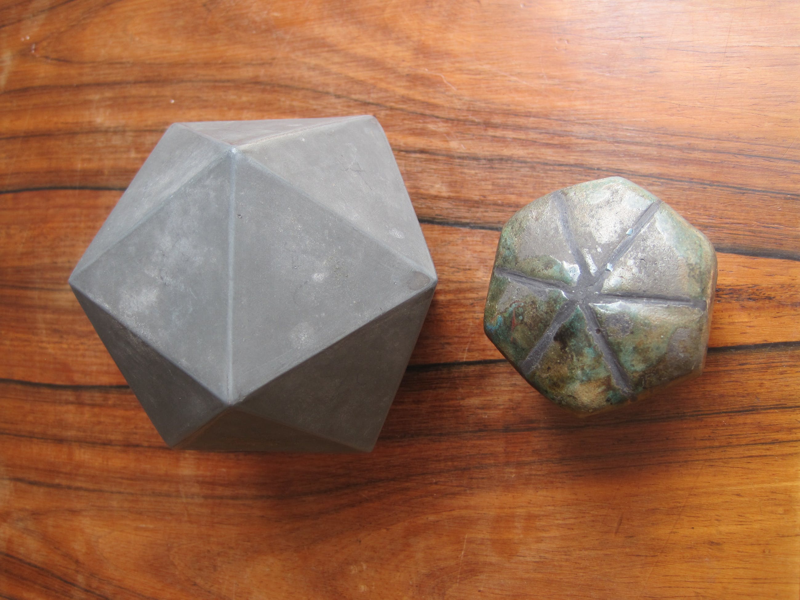 2 hele decoratieve en interessante plastieken van keramiek.De grootste is een zgn. Icosaëder of 20 vlaks figuur. Deze is geheel hol en heel dunwandig.Geen idee hoe zoiets gemaakt kan worden.Het kleine plastiek is geglazuurd en ook hol en dikwandig.Voorzien van monogram AVAfm. 5 cm hoog en 6 cm breed en diep.