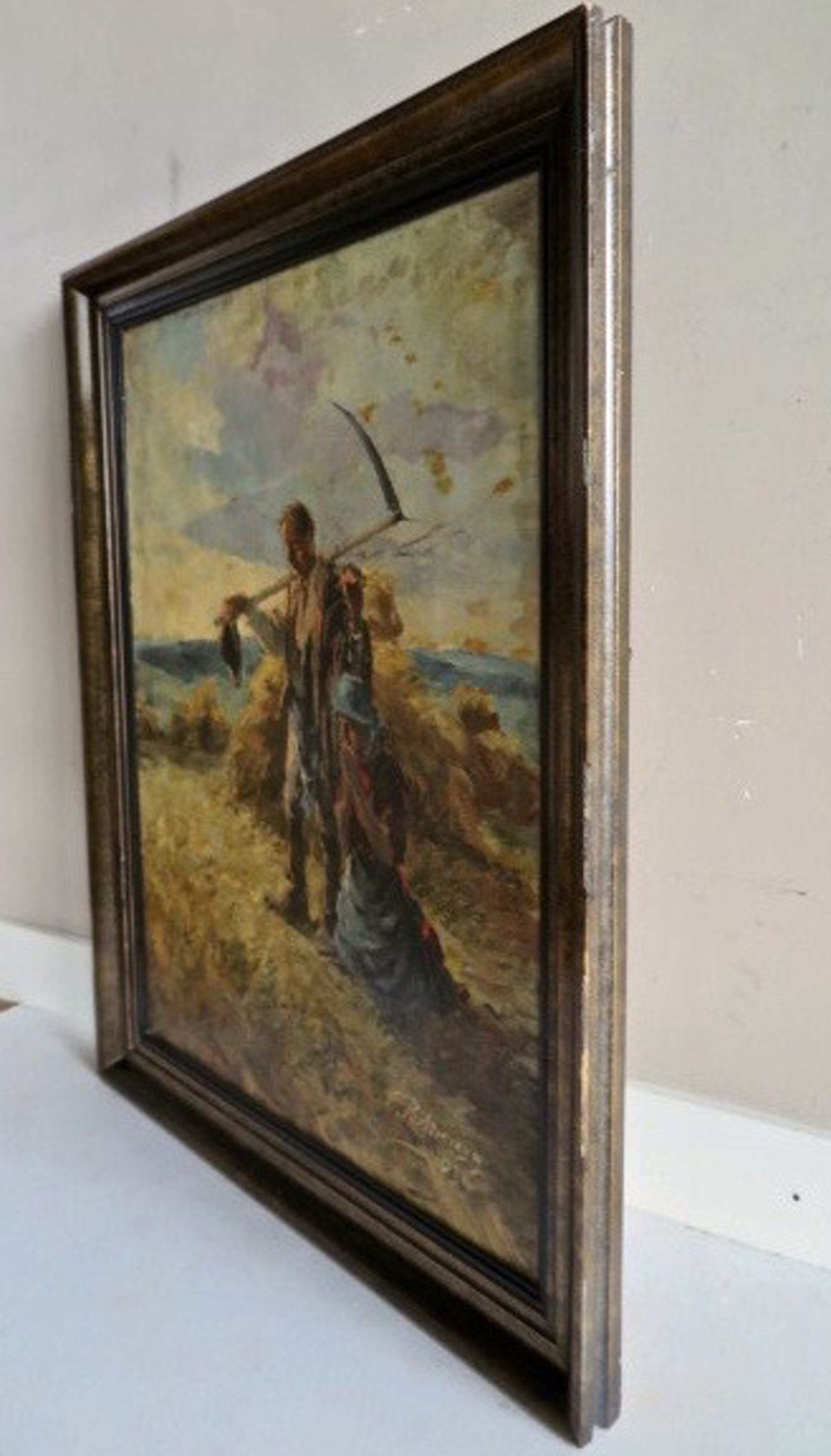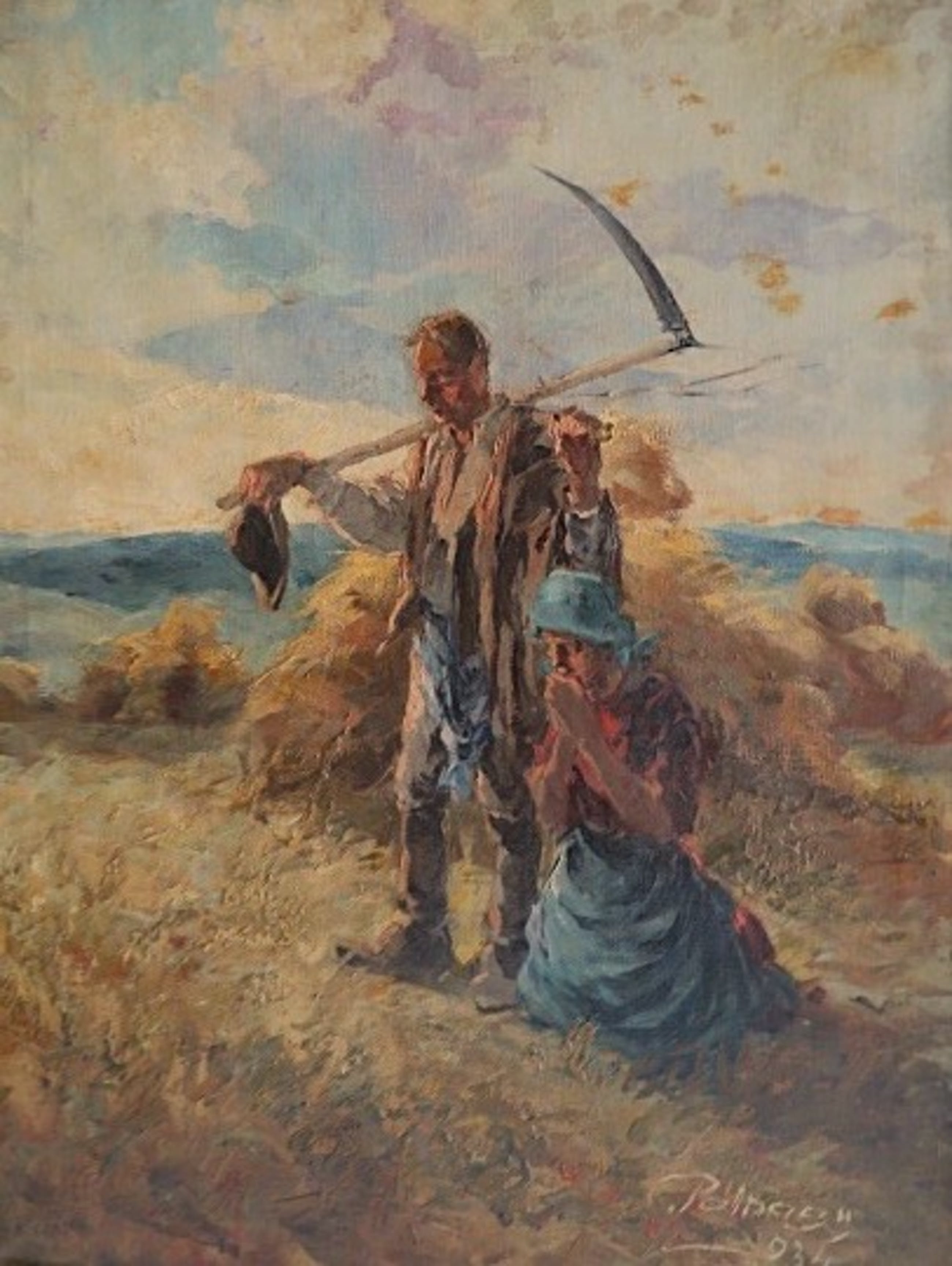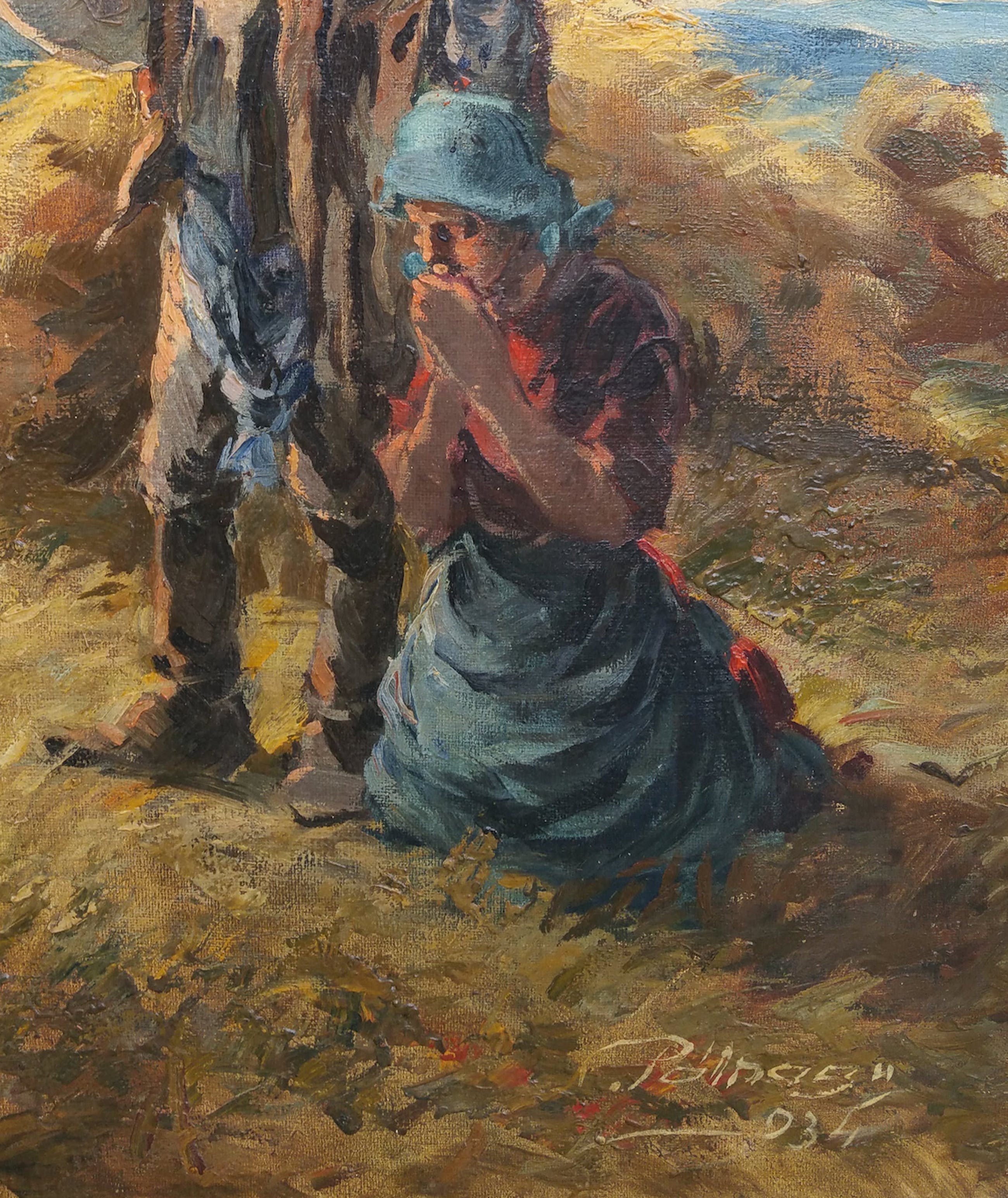 Gedateerd 1934. Man met zeis en een vrouw knielend in een dankgebed voor de behaalde oogst.