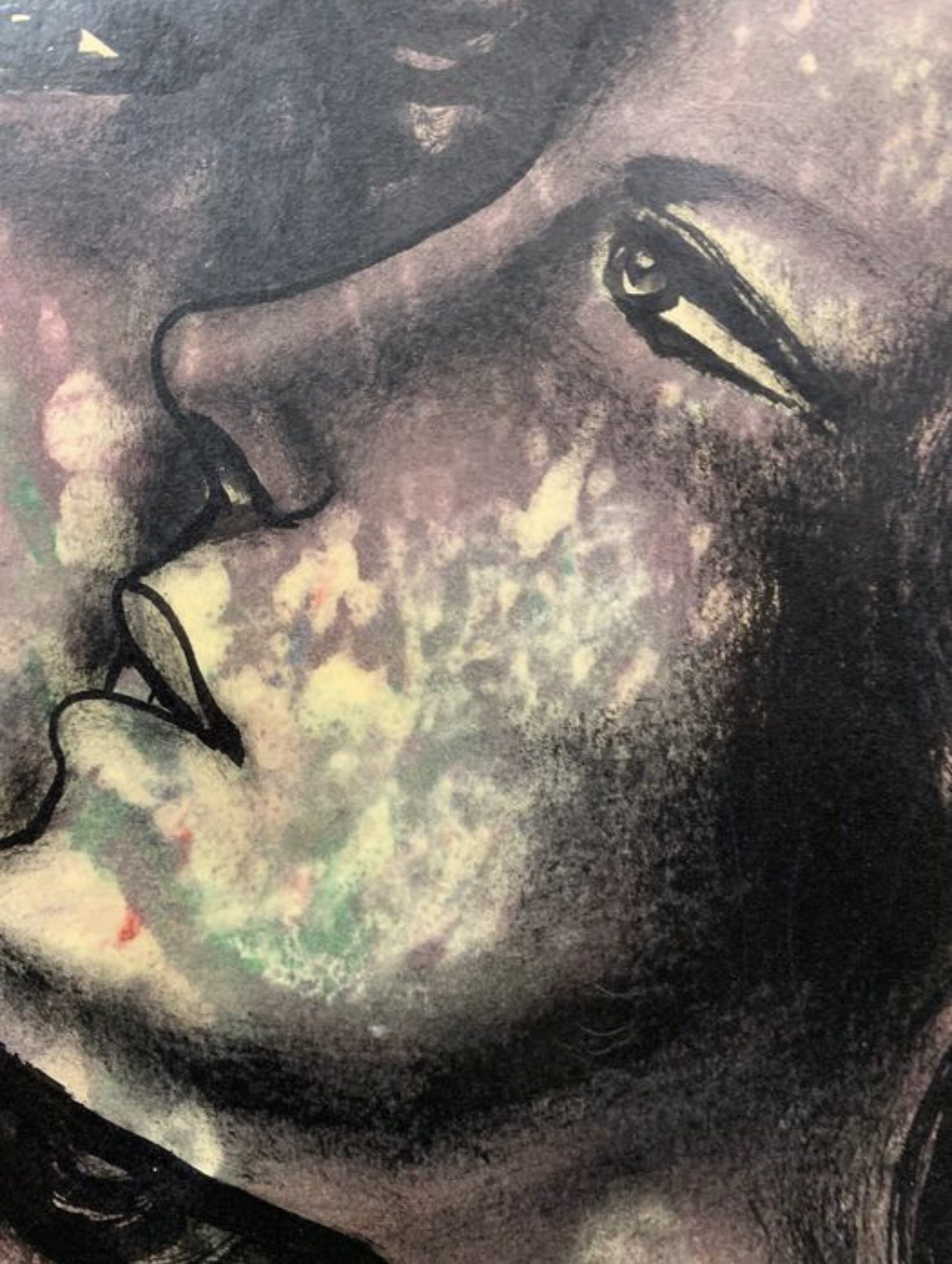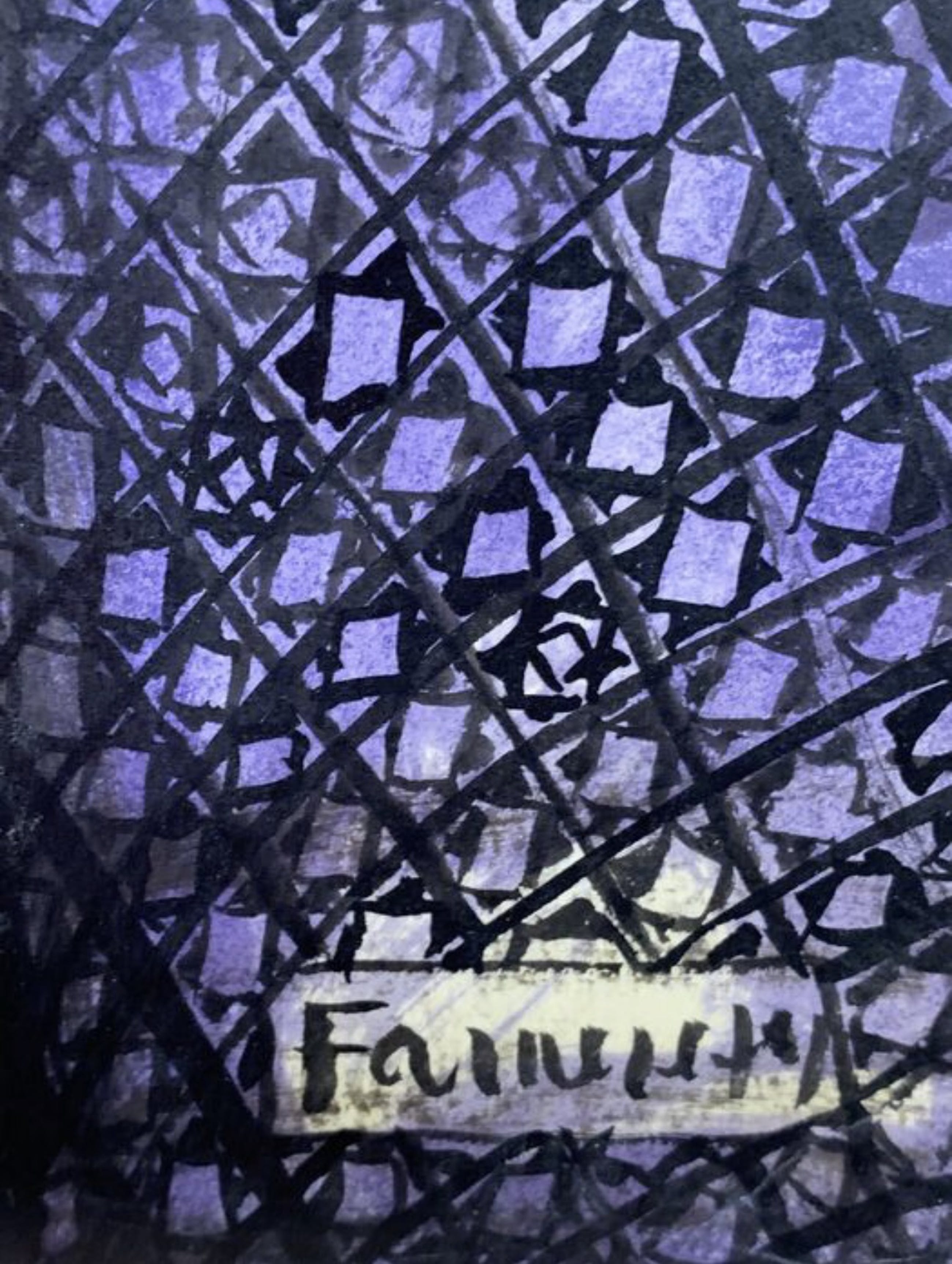 Er zijn een aantal lichte vouwen en kleine beschadigingen aan het werk te zien. Op de achterkant van het schilderij staat een pen-tekening van de kunstenaar. Zie foto's.