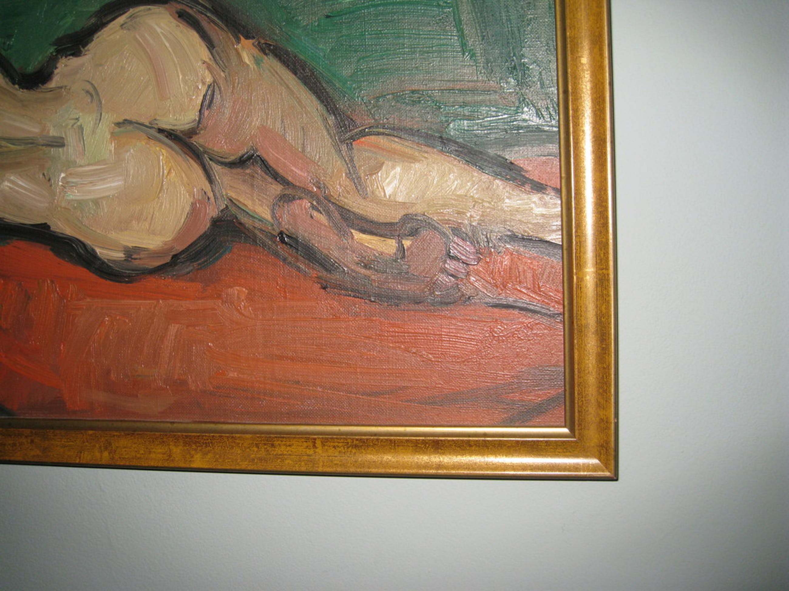 Artistiek en goed geschilderd modern vrouwelijk naakt in royaal opgezette acrylverf linnen op board afmeting 52x42cm. Professioneel omlijst in nieuwe vergulde galerielijst afgewerkt met wolkpaneel. afm.56x46cm. Het geheel is in voortreffelijke staat. ongesigneerd
