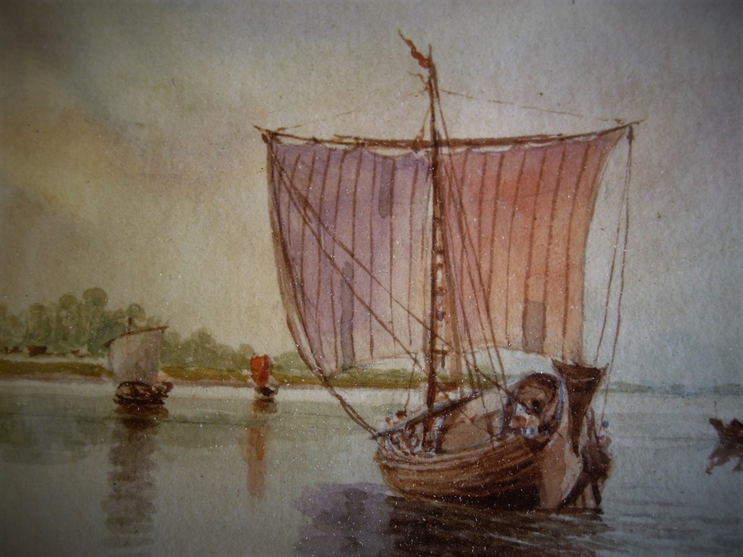 Onbekend - Indonesie omstreeks 1900 gesigneerde aquarel "zeilboten op rivier bij tempel" - Verkocht