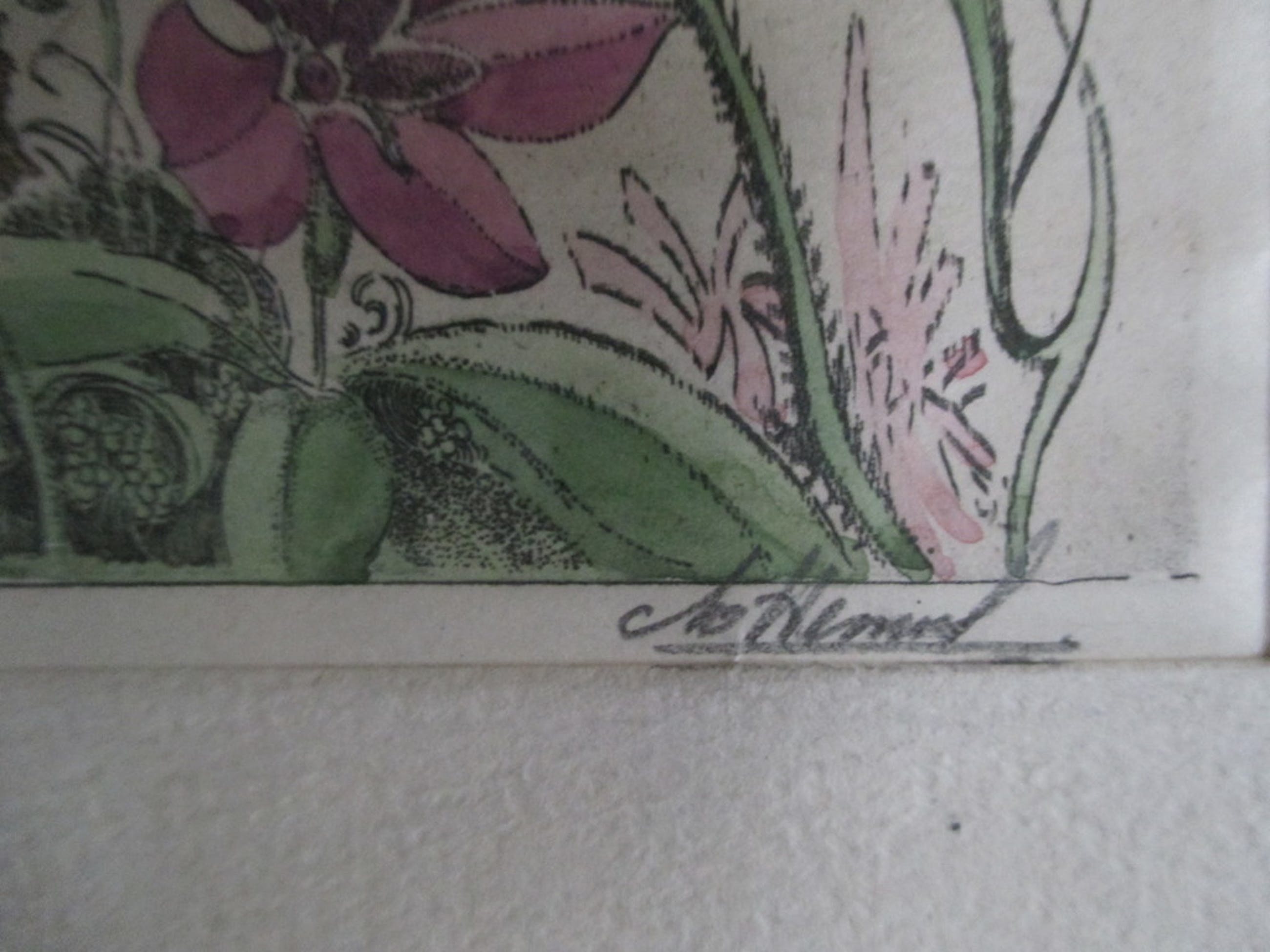 Ingekleurde gravure (of ets), r.o gesigneerd. Ingelijst achter glas, afm. lijst 20,5x23 cm, beeld 11,5x12,5.