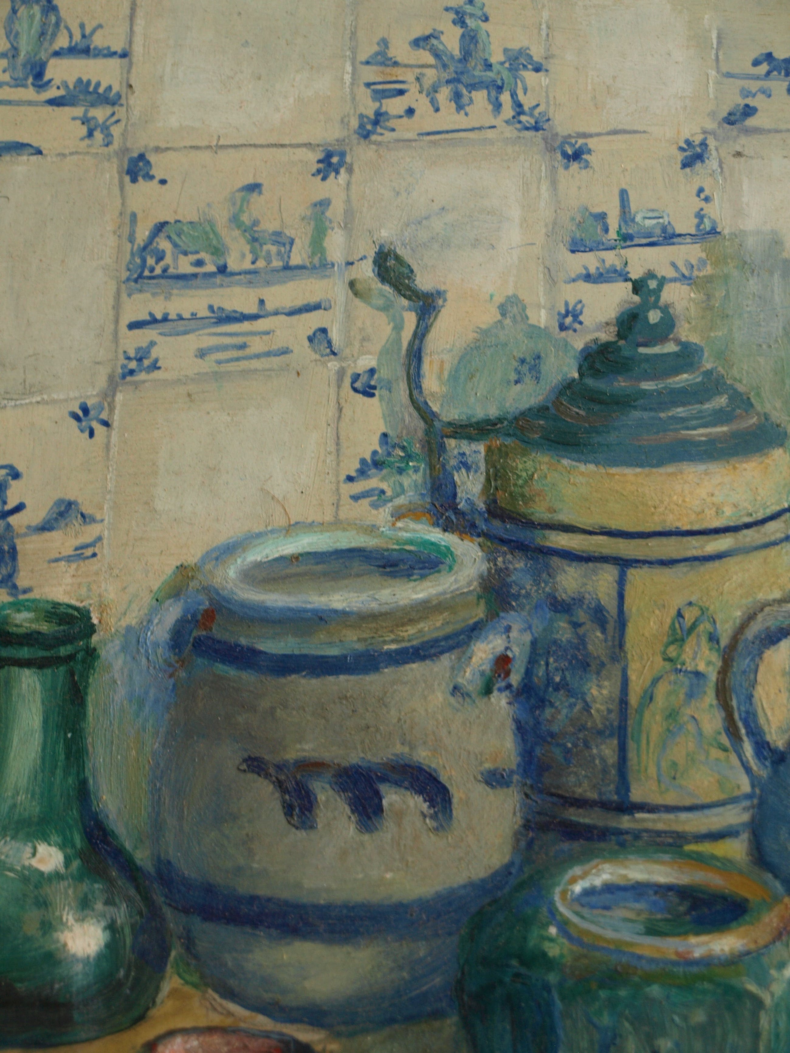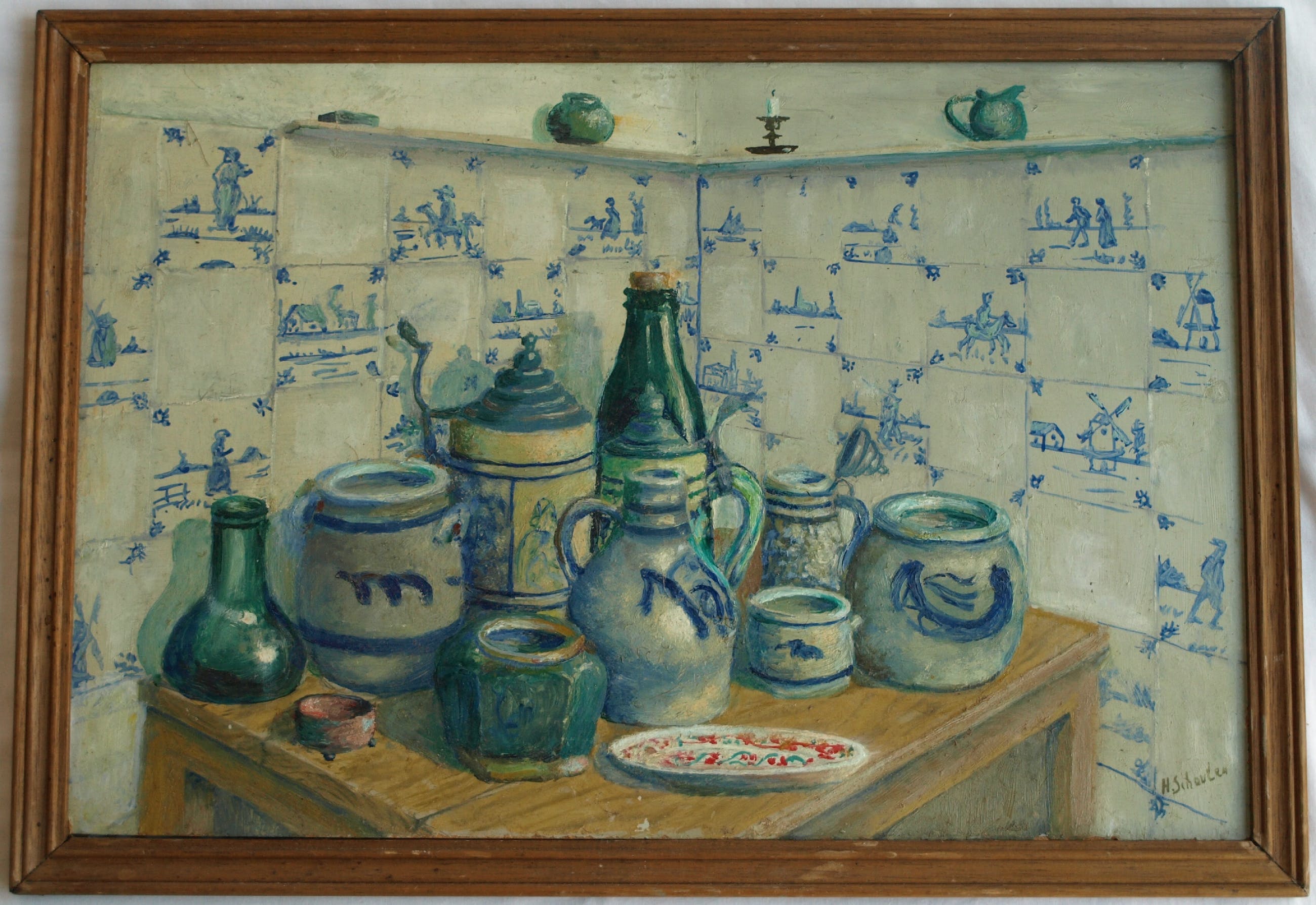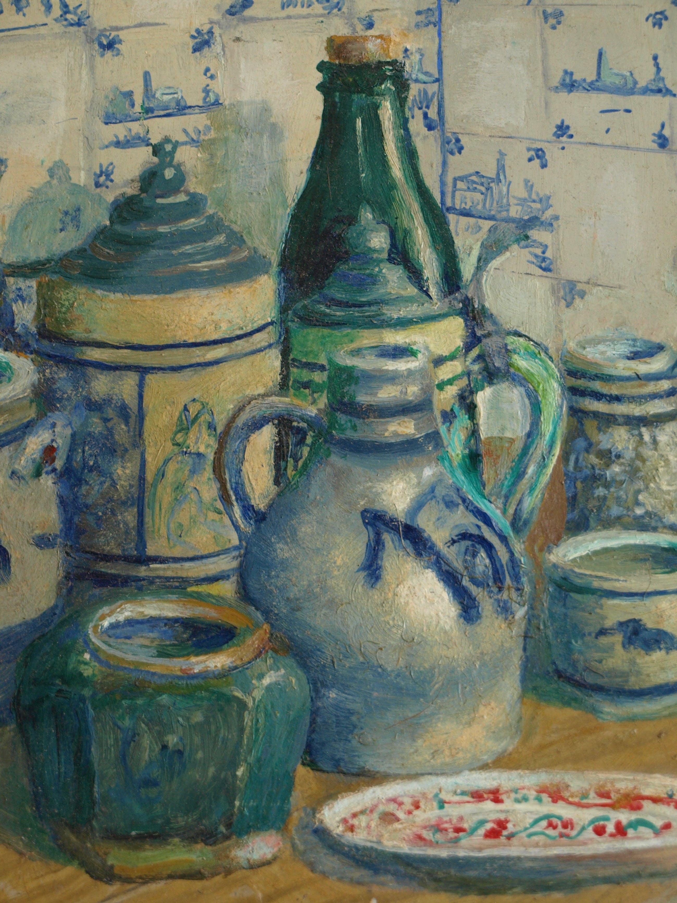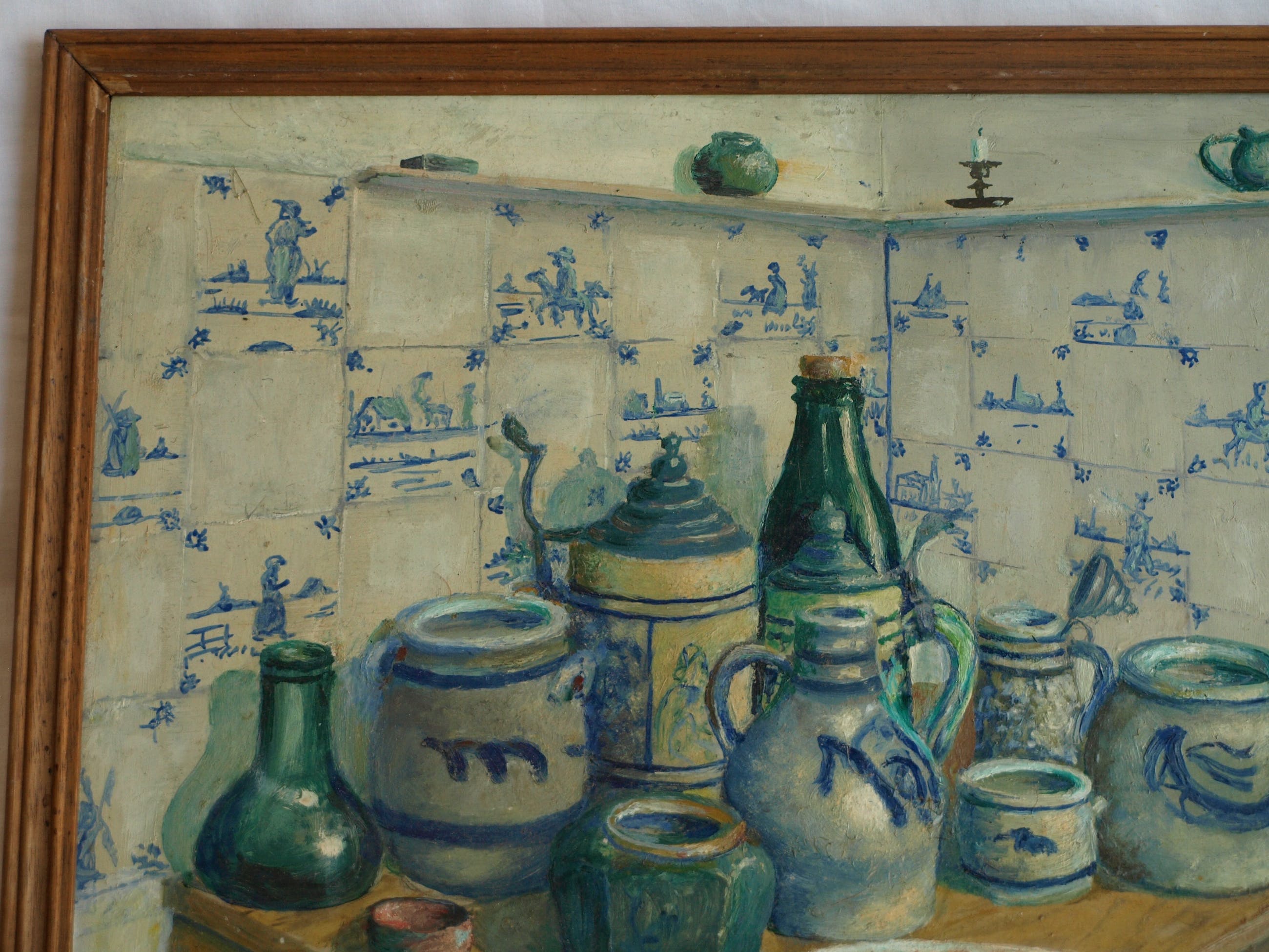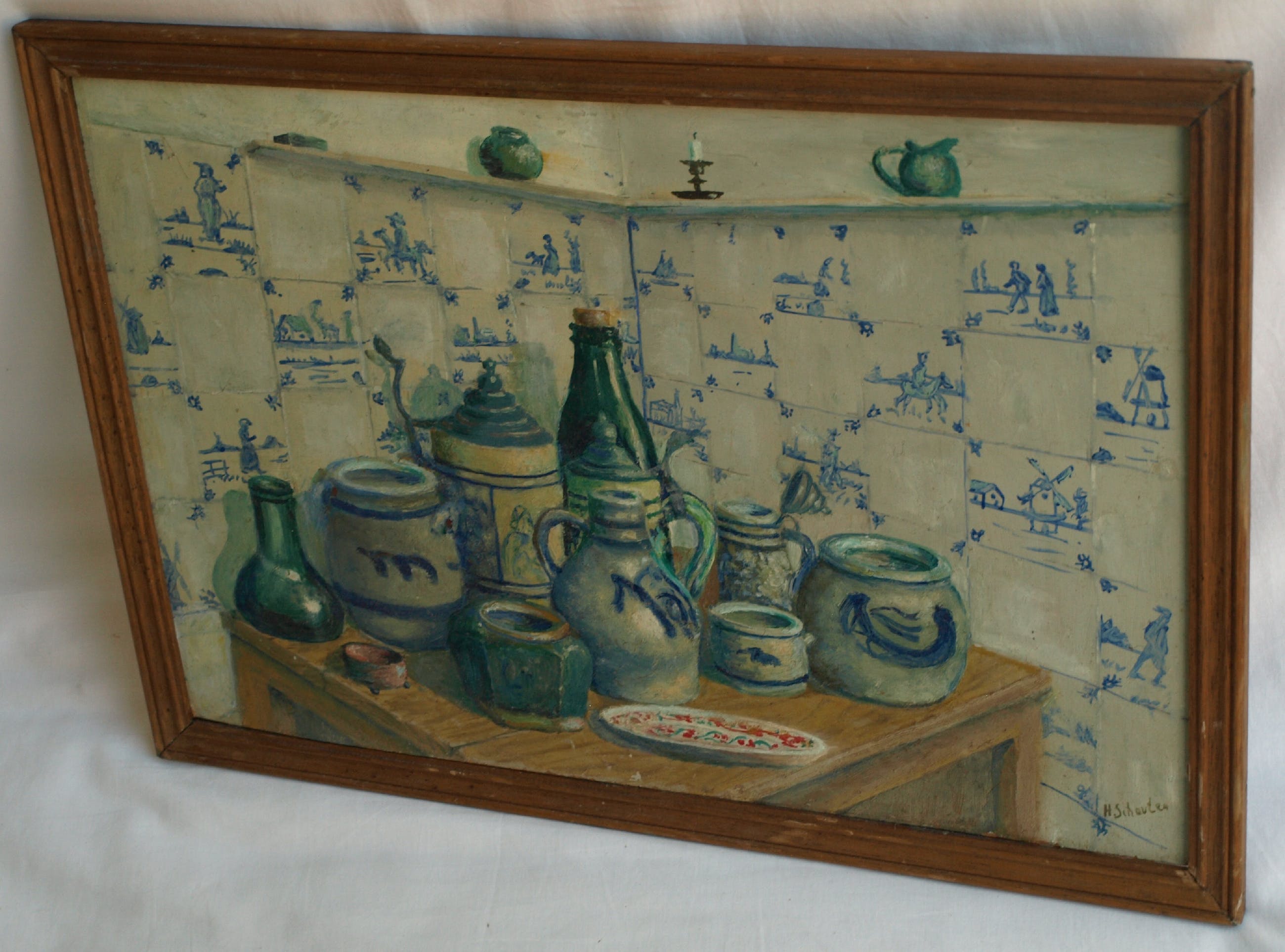 Onbekend - Ingelijst, olieverf op board , stilleven “Aardewerk met bierpullen” - Verkocht