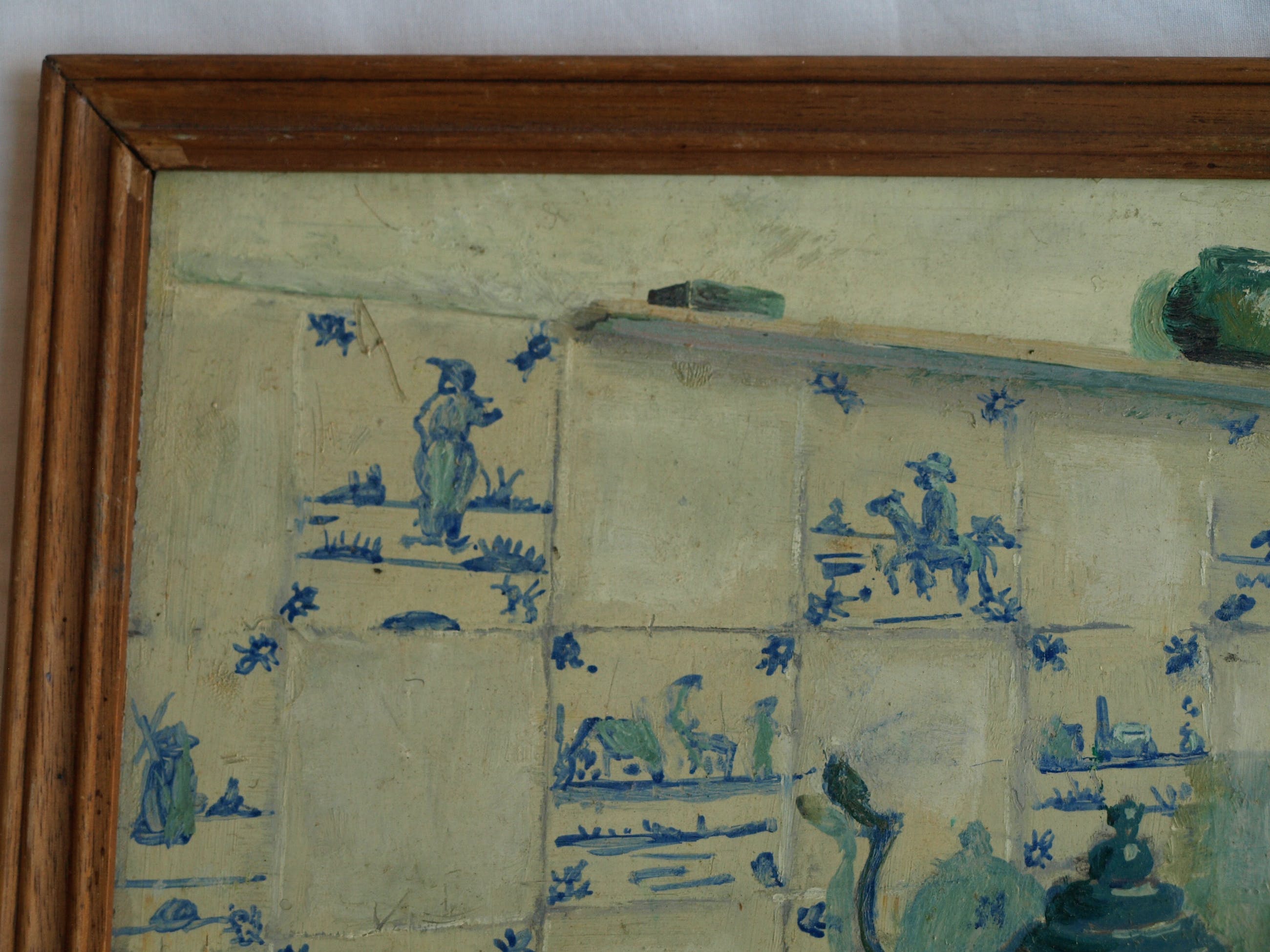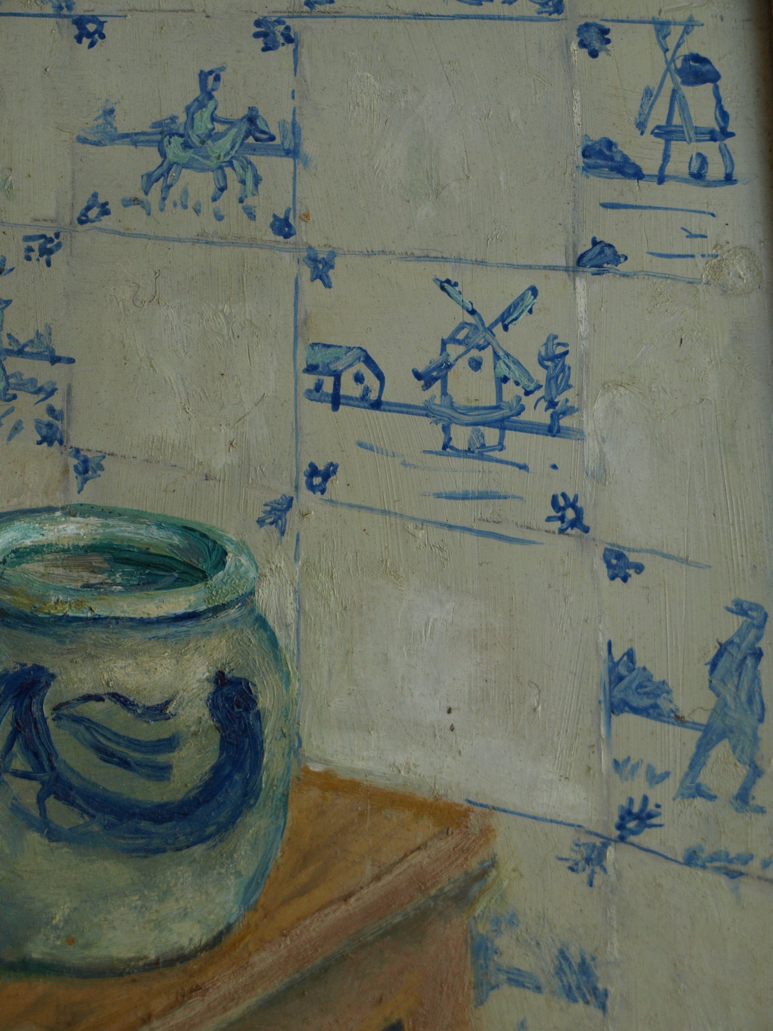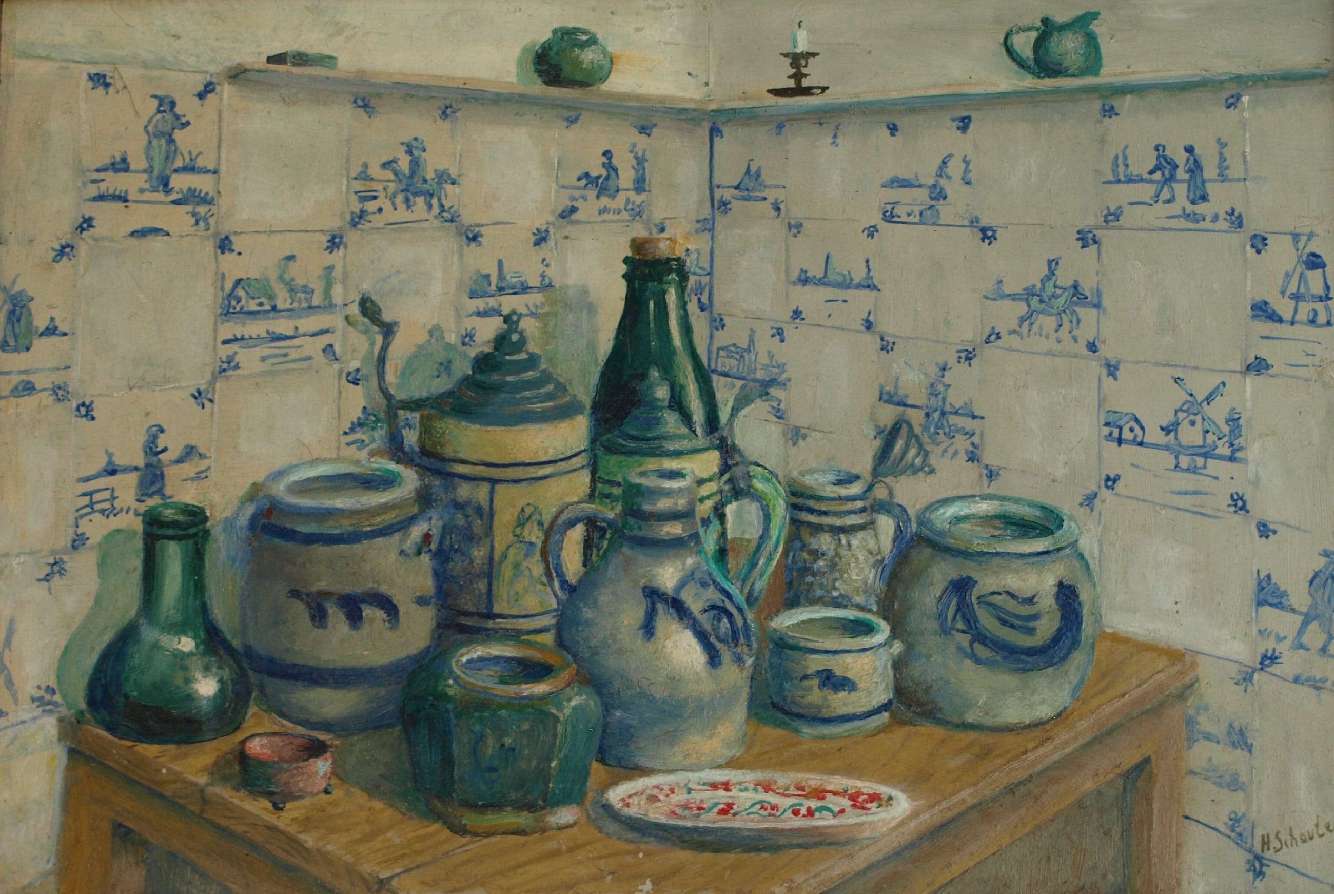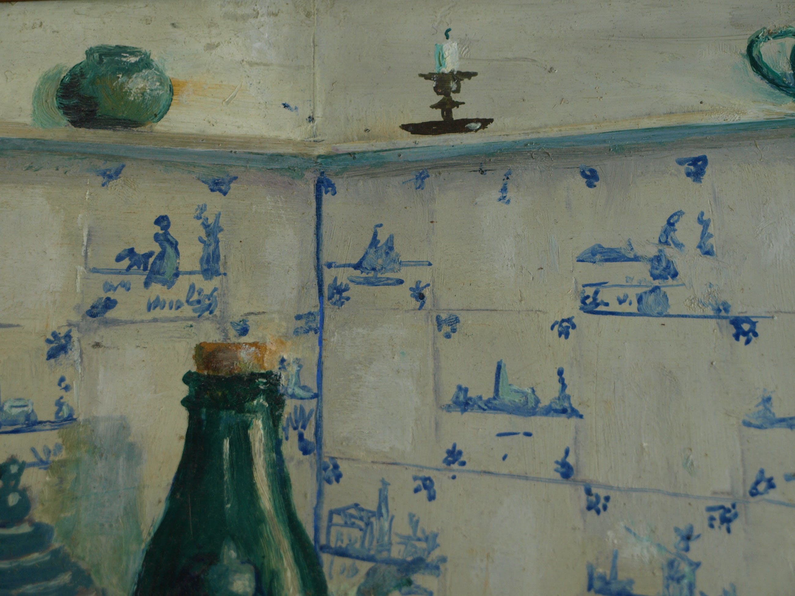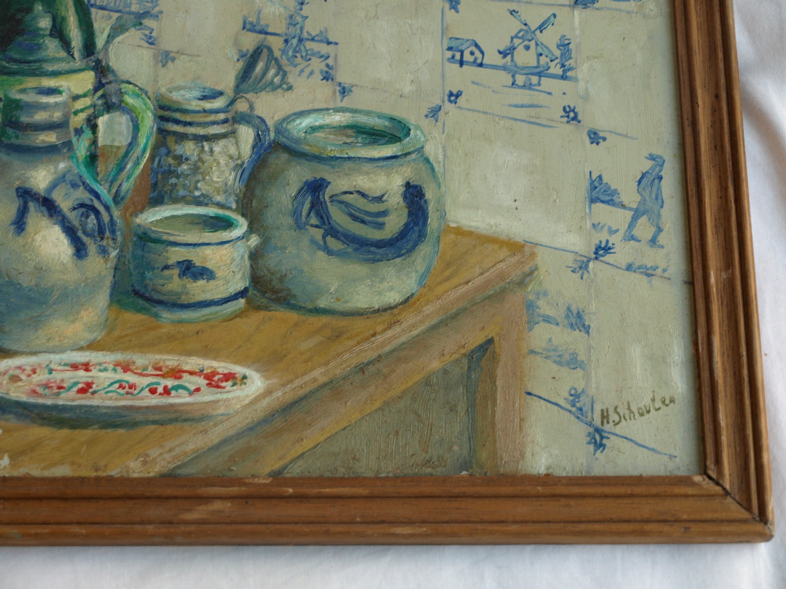 Onbekend - Ingelijst, olieverf op board , stilleven “Aardewerk met bierpullen” - Verkocht