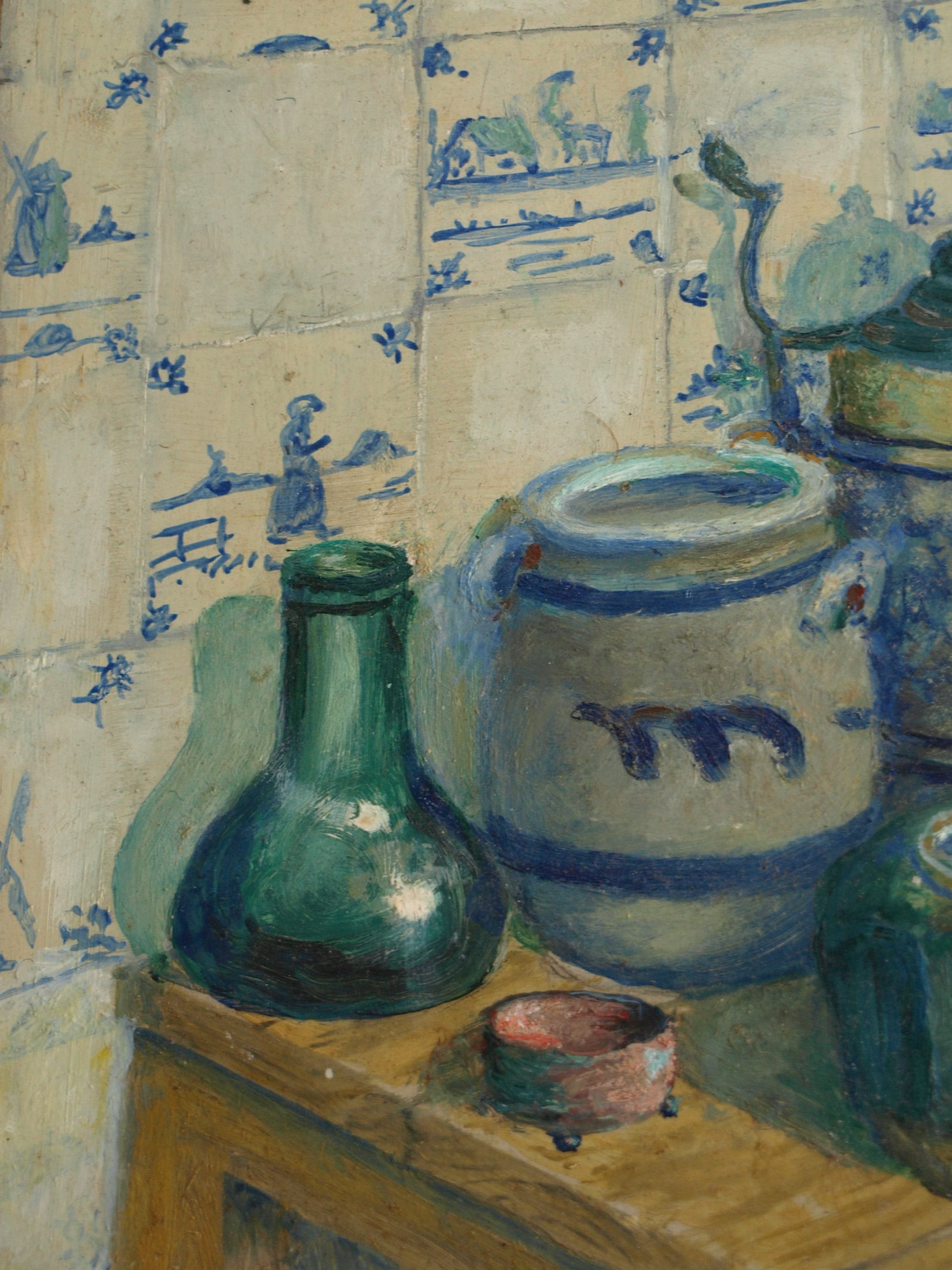 Niet of onleesbaar gesigneerd - Ingelijst, olieverf op board , stilleven “Aardewerk met bierpullen” kopen? Bied vanaf 1!