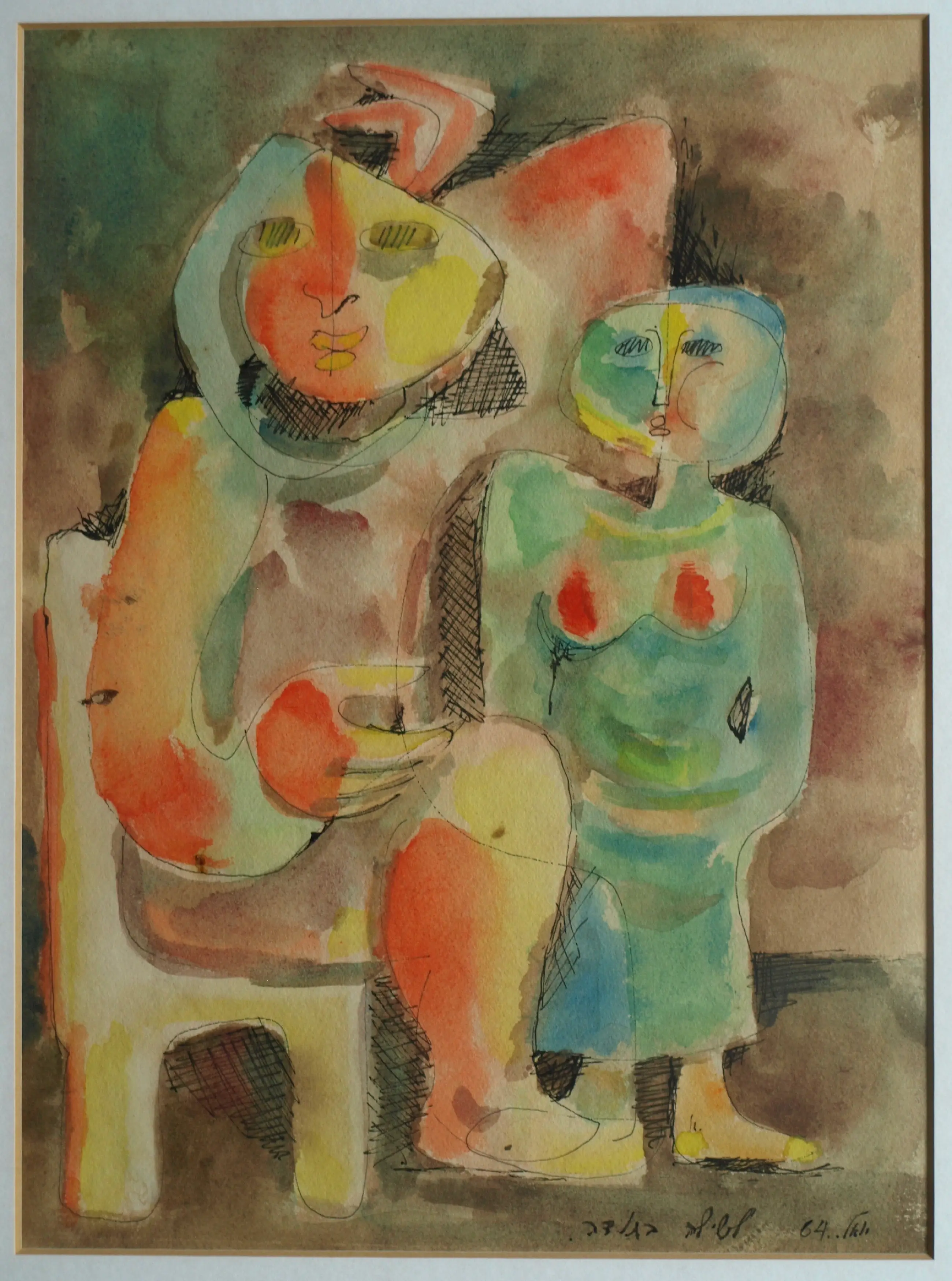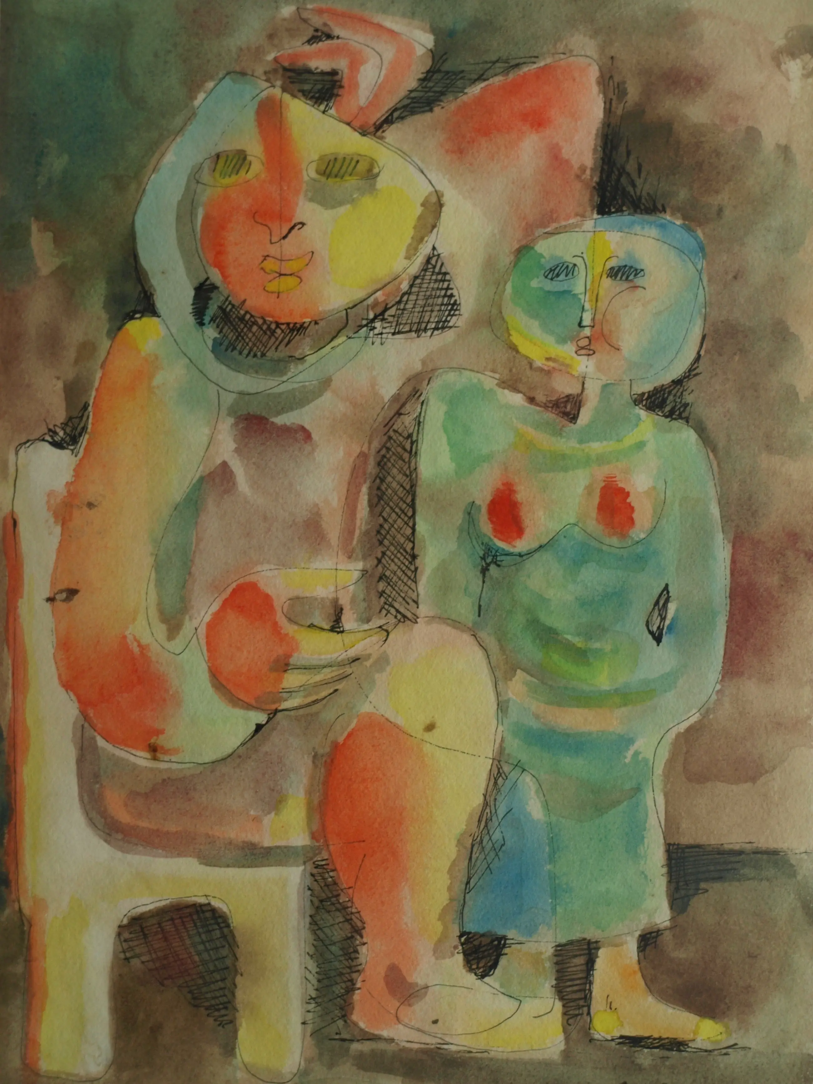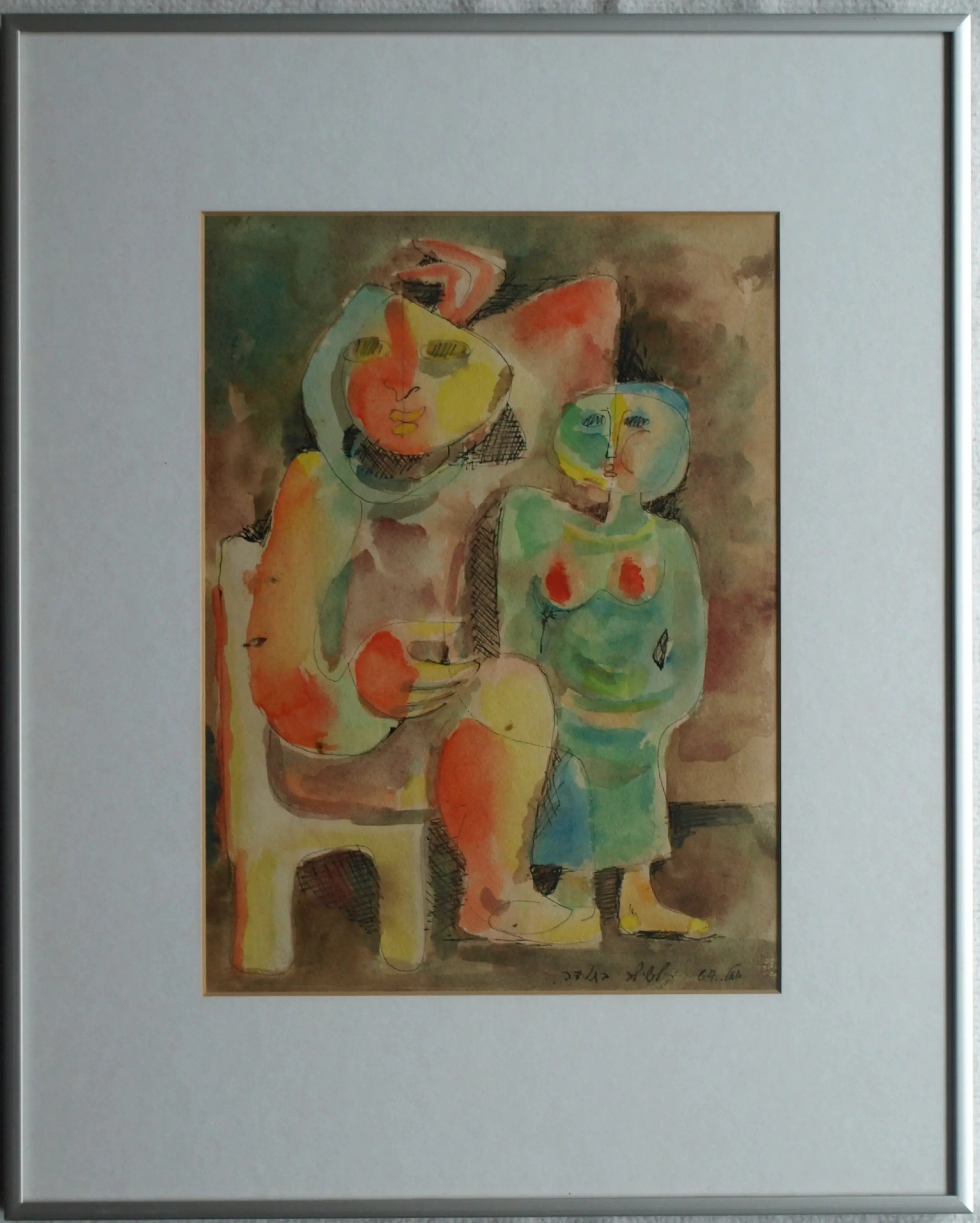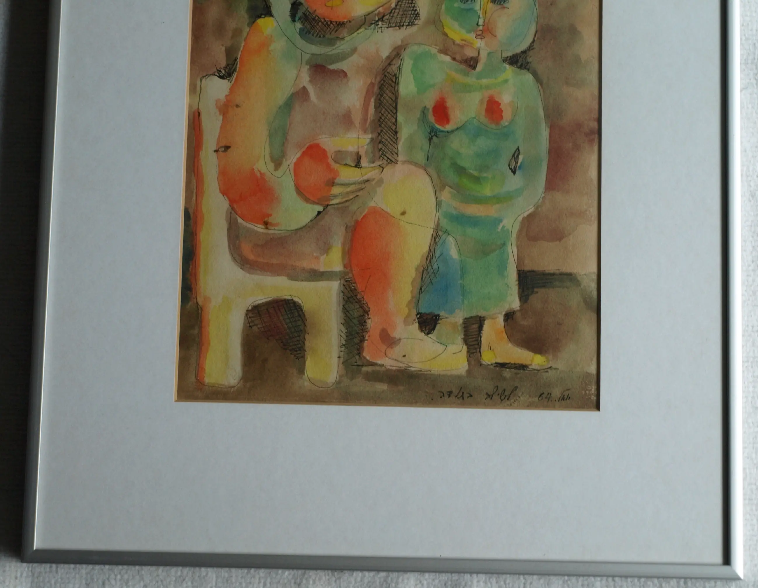Onbekend - Ingelijste aquarel & inkt , Man en Vrouw – gesigneerd – Lijst, 44 x 35 cm. - Verkocht