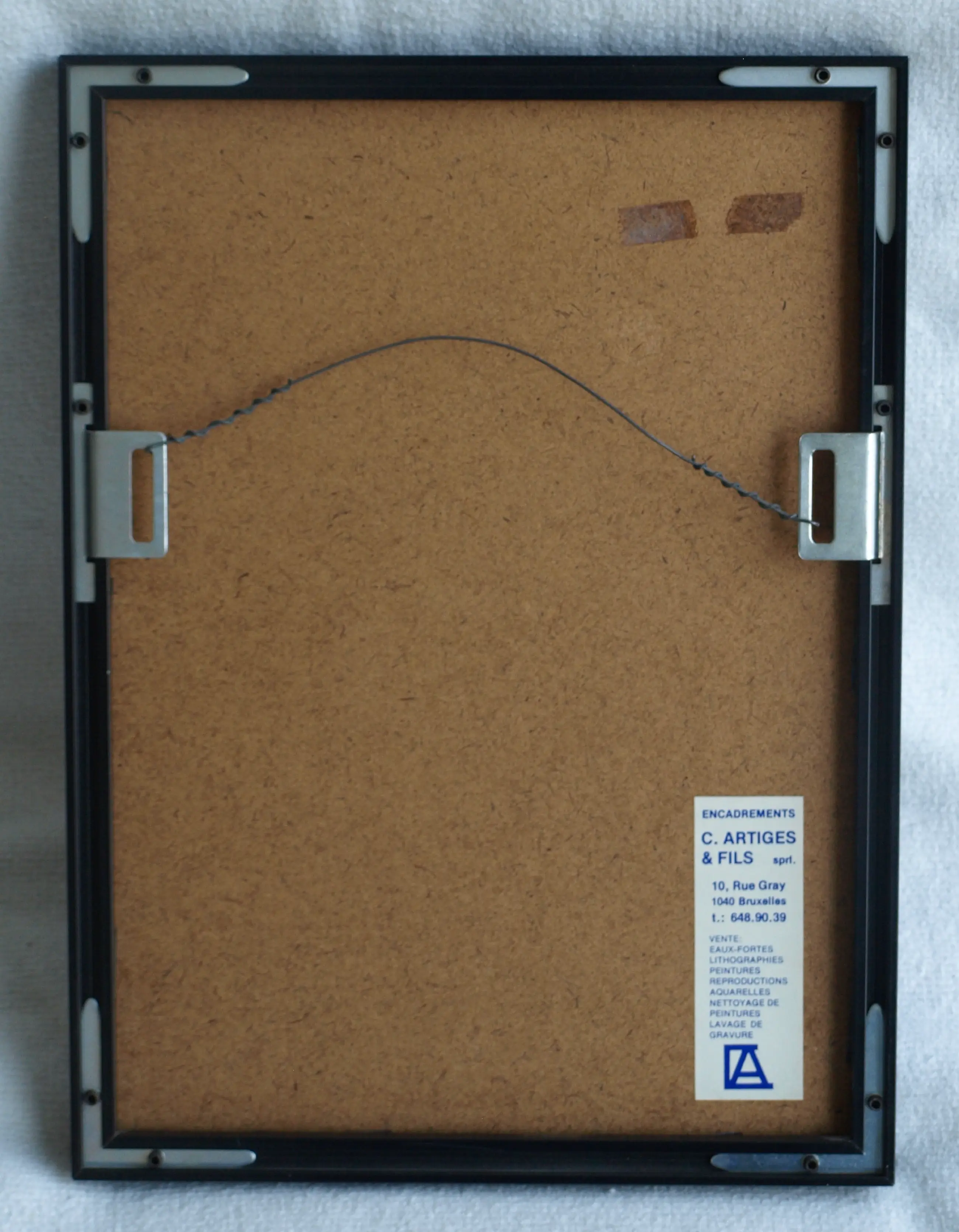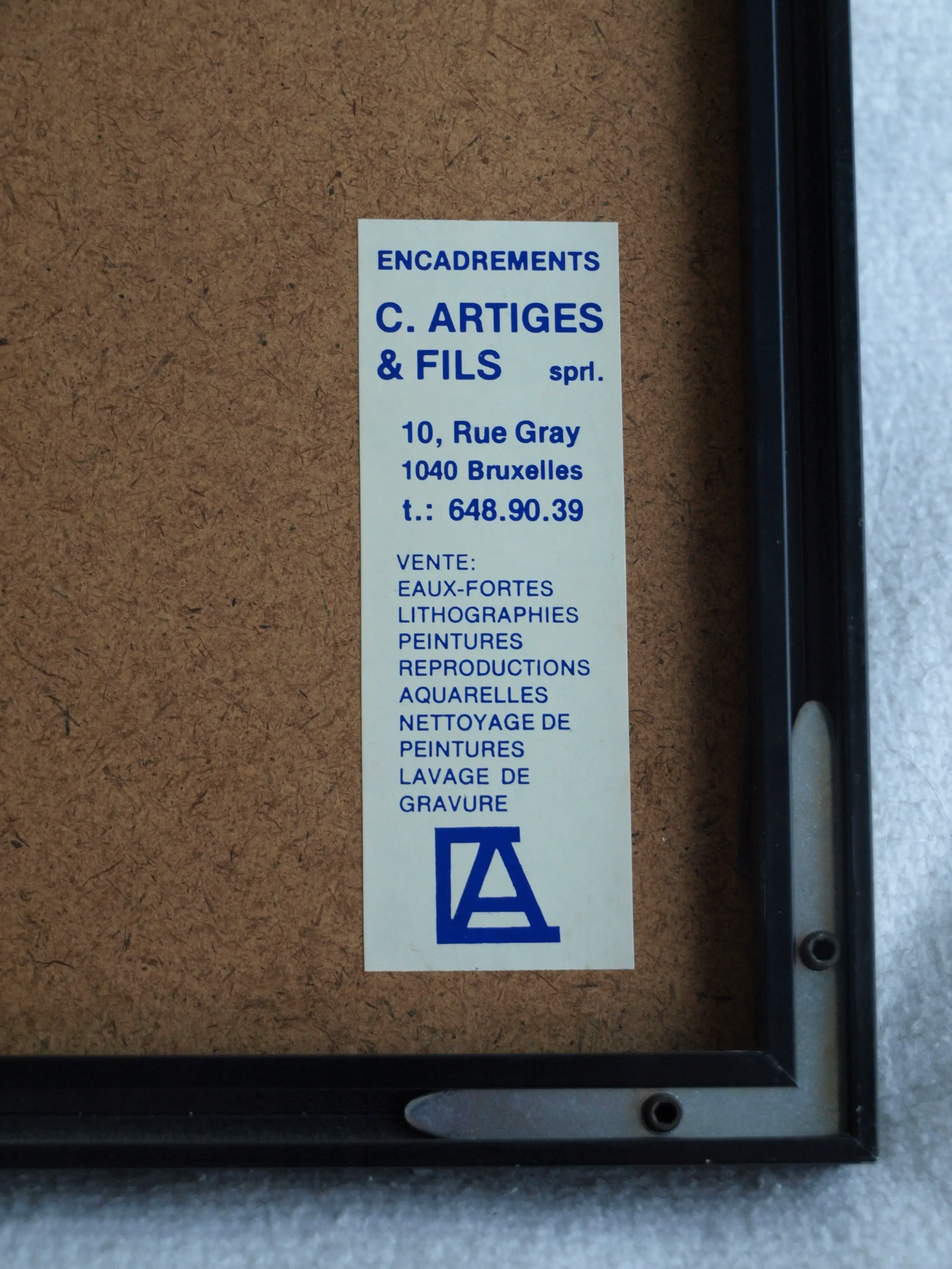 Een ingelijste tekening / aquarel uit 1982 van een ons onbekende, Belgische?, kunstenaar. -Gesigneerd en gedateerd rechtsonder. -Ingelijst in een houten lijst met passe-partout en glasplaat. Ingelijst bij Artiges C. & Fils , Rue Gray 10 , Brussel. -Afmetingen: Lijst, 36 x 26,5 x cm. Beeld, 23 x 14,5 cm. -Herkomst: Uit de inboedel van een kunstverzamelaar. -Conditie: De tekening is in goede staat. De lijst heeft slijtplekjes. Zie ook de foto’s voor een eigen indruk. Kan zo aan de muur.