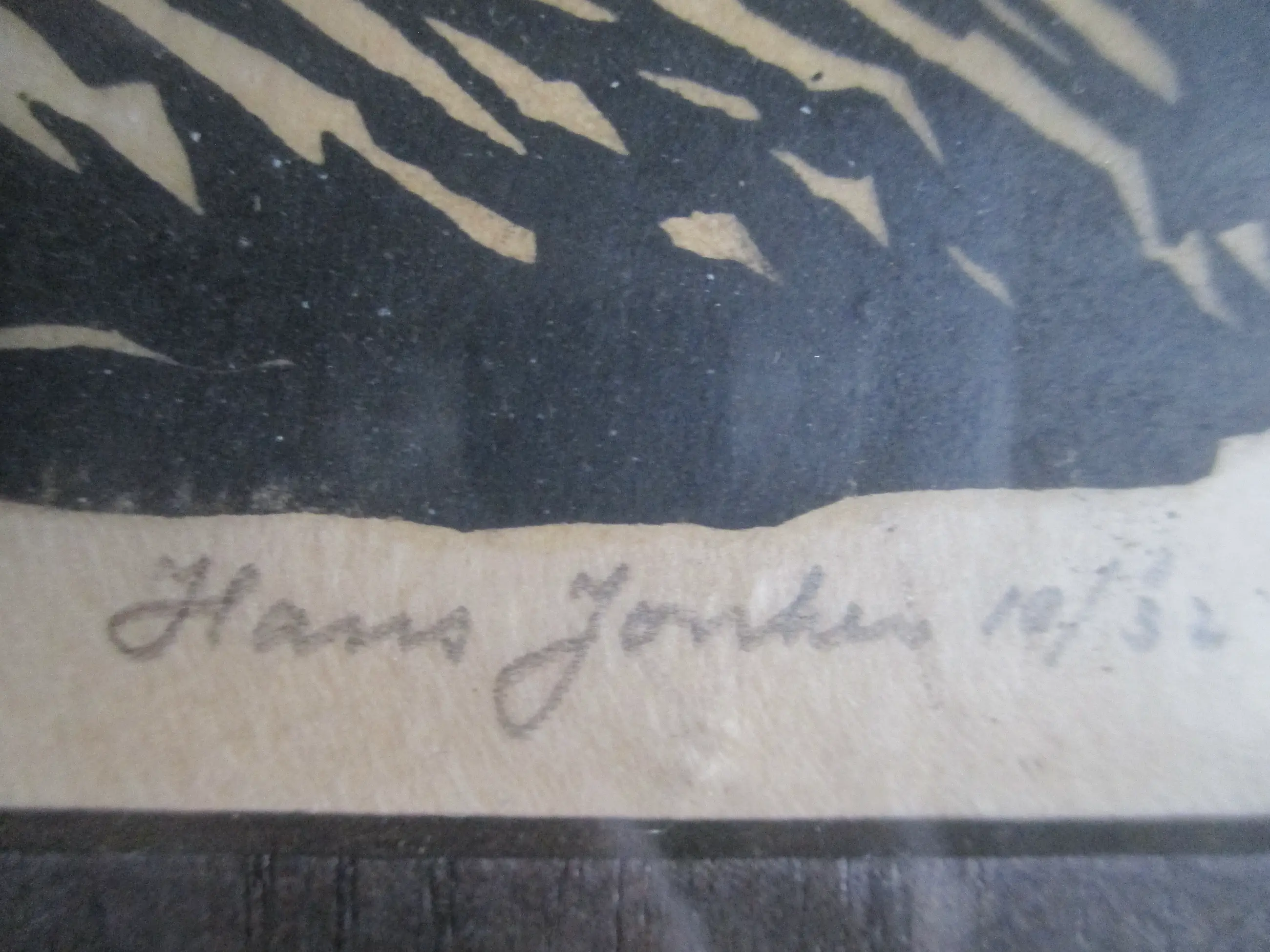 Houtsnede , gesigneerd, gedateerd en genummerd in potlood. Ingelijst achter gefineerd passe-partout in aluminium wissellijst. Verzending 8,25, aangetekend 10,20