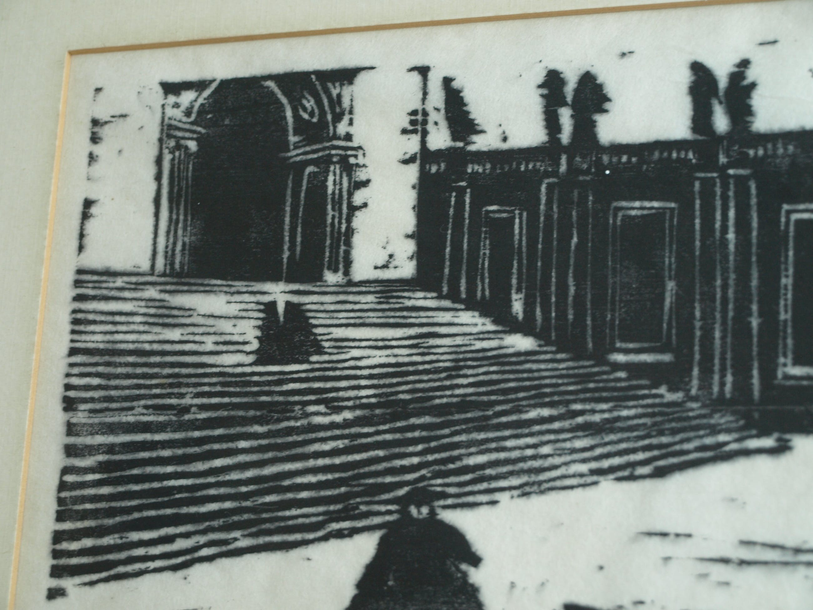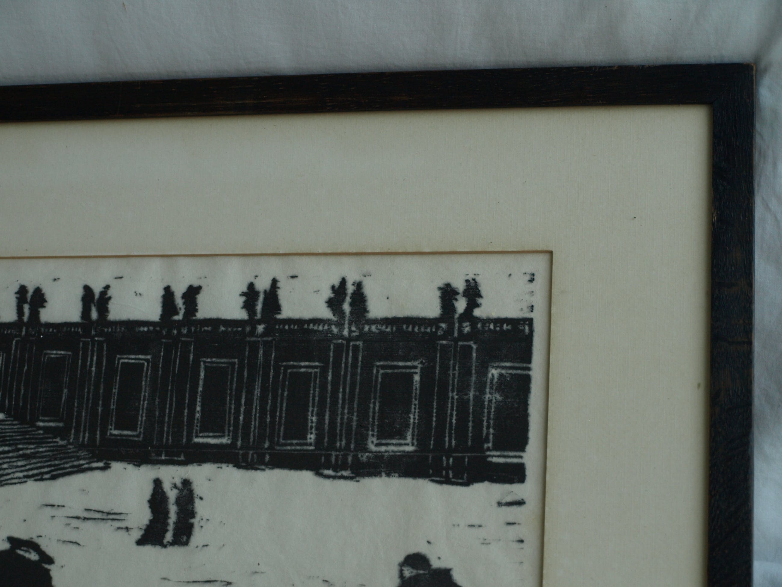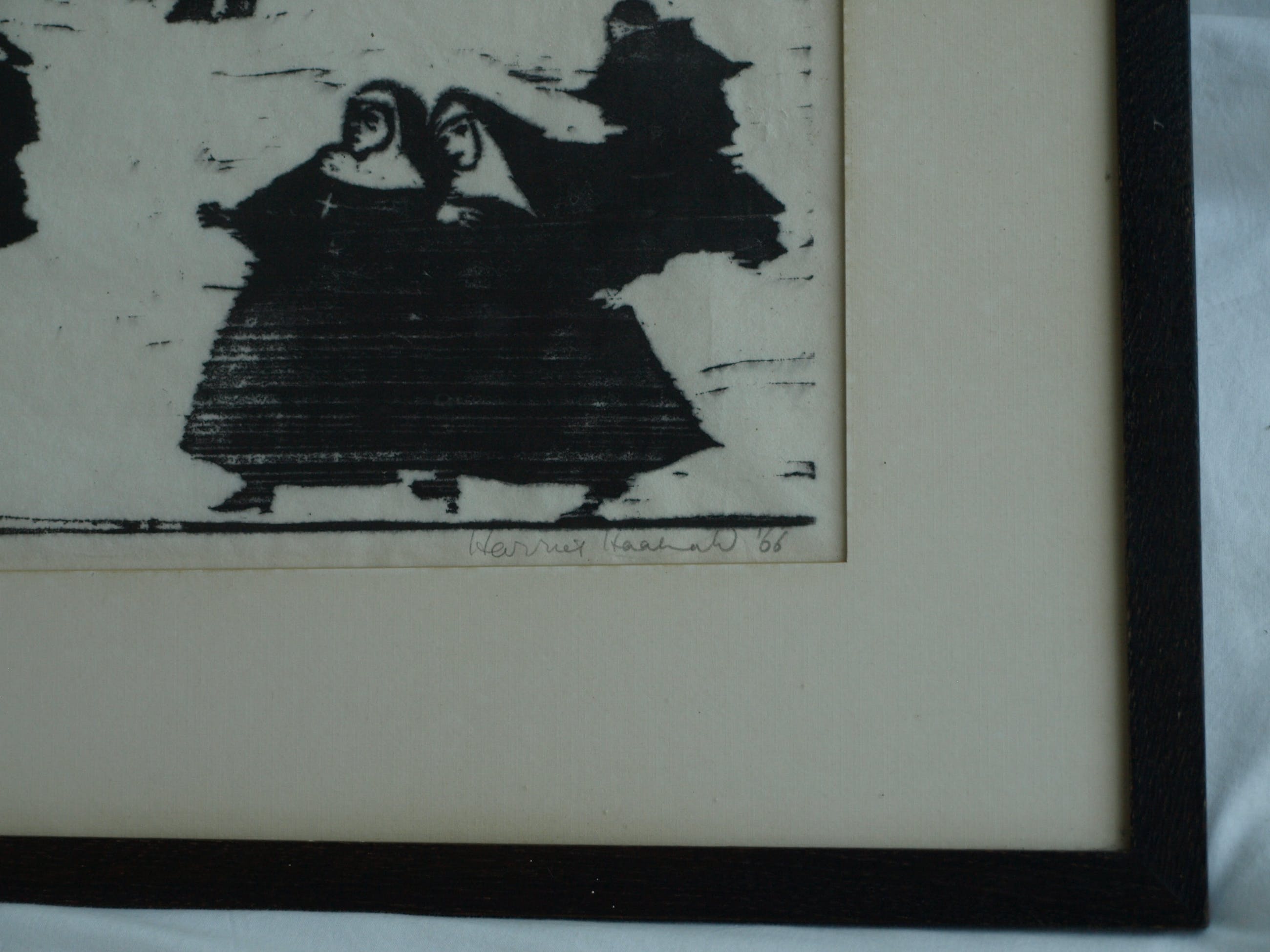 Een ingelijste houtsnede op uit 1966 van een ons onbekende kunstenaar.