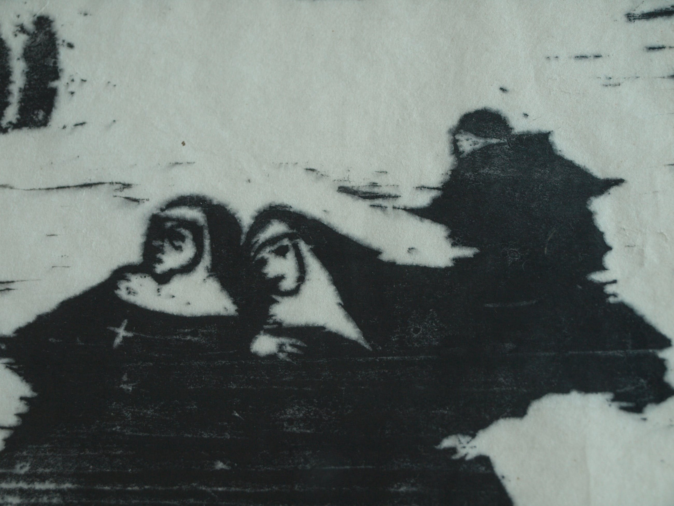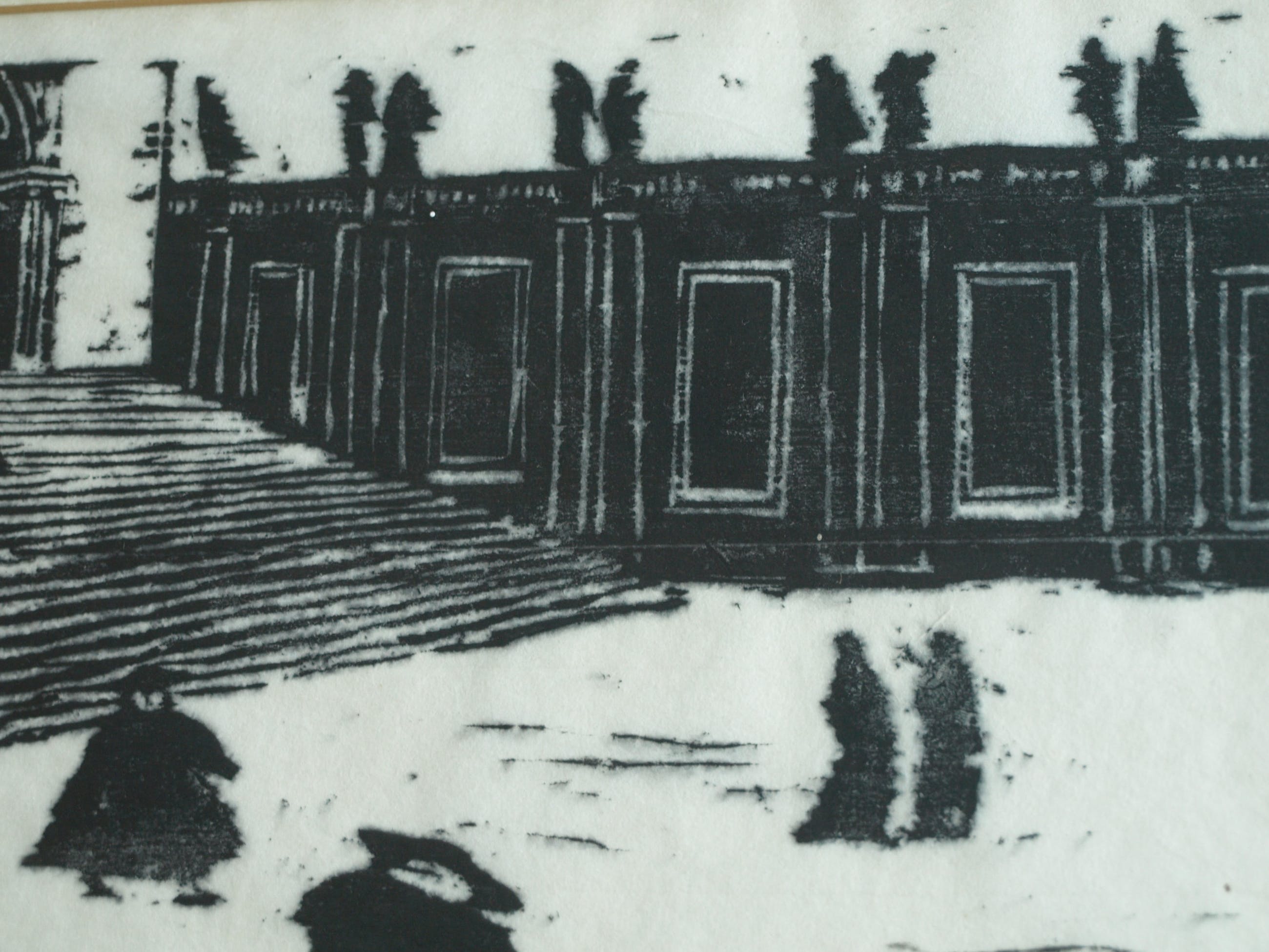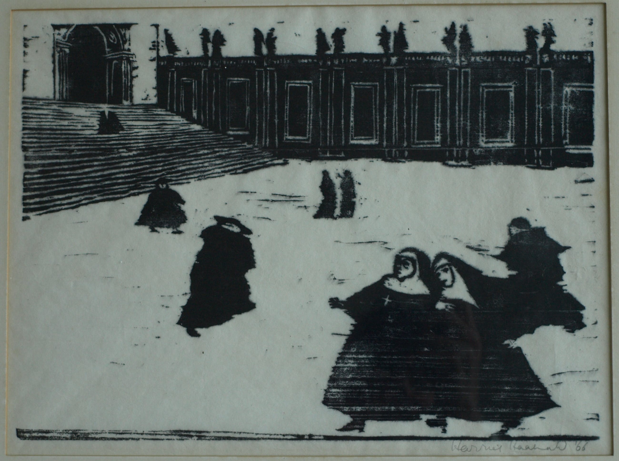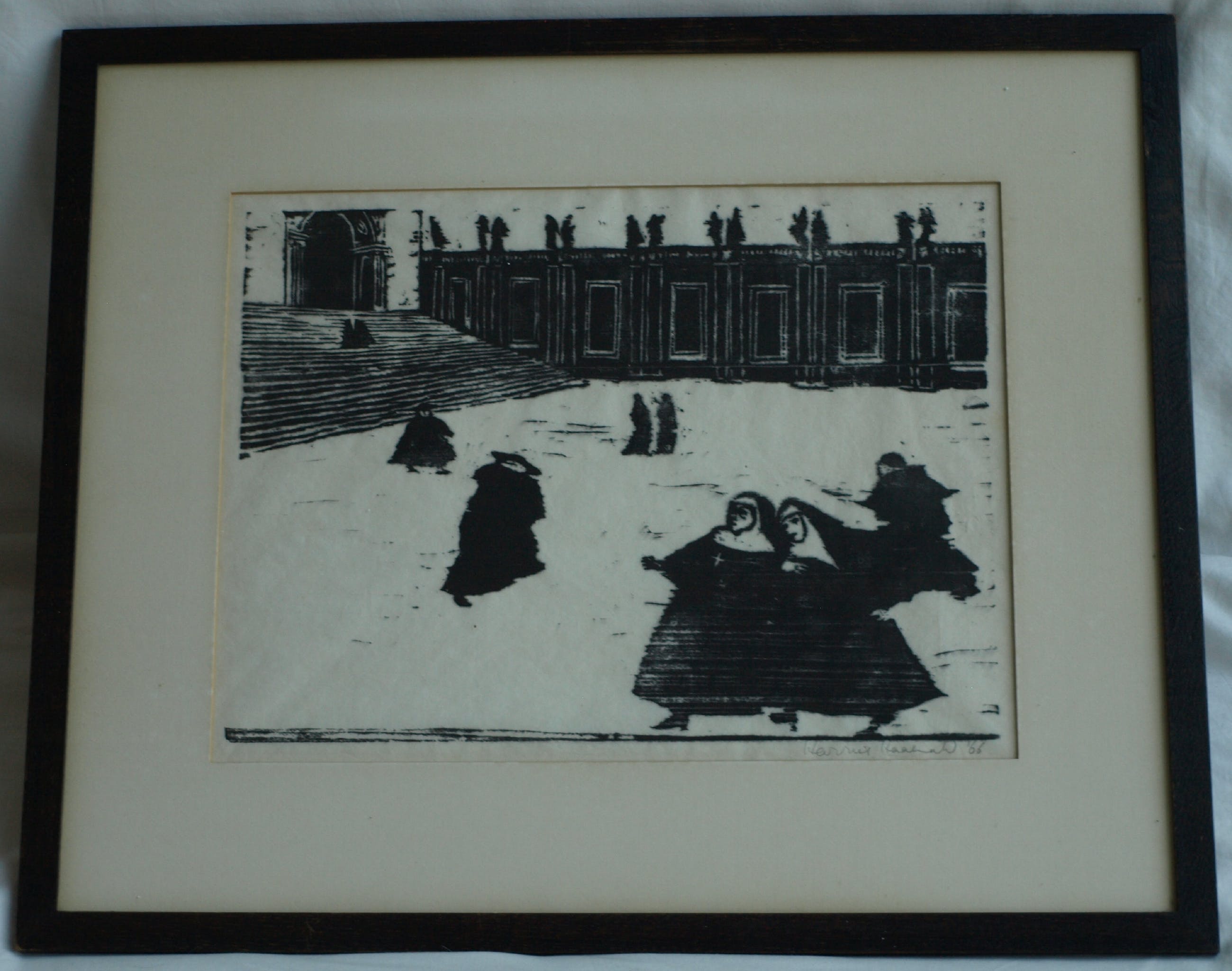 Een ingelijste houtsnede op uit 1966 van een ons onbekende kunstenaar.