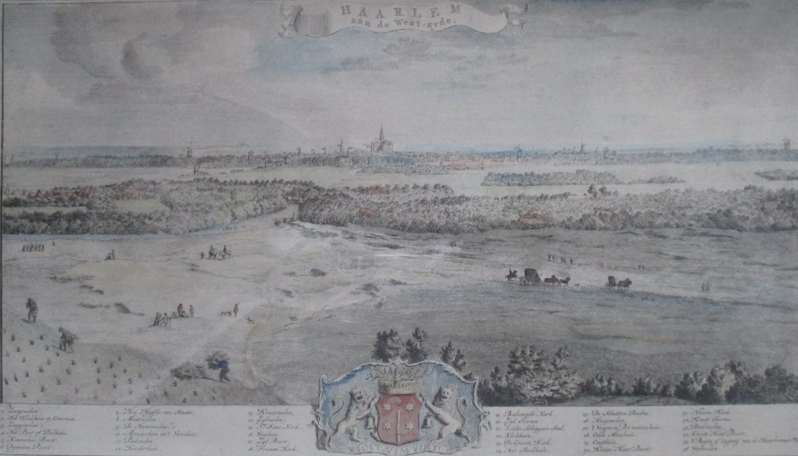 Ingekleurde gravure van Haarlem aan de Westzyde, gedrukt door Enschede en zonen. Ingelijst achter passe-partout en glas in houten lijst.