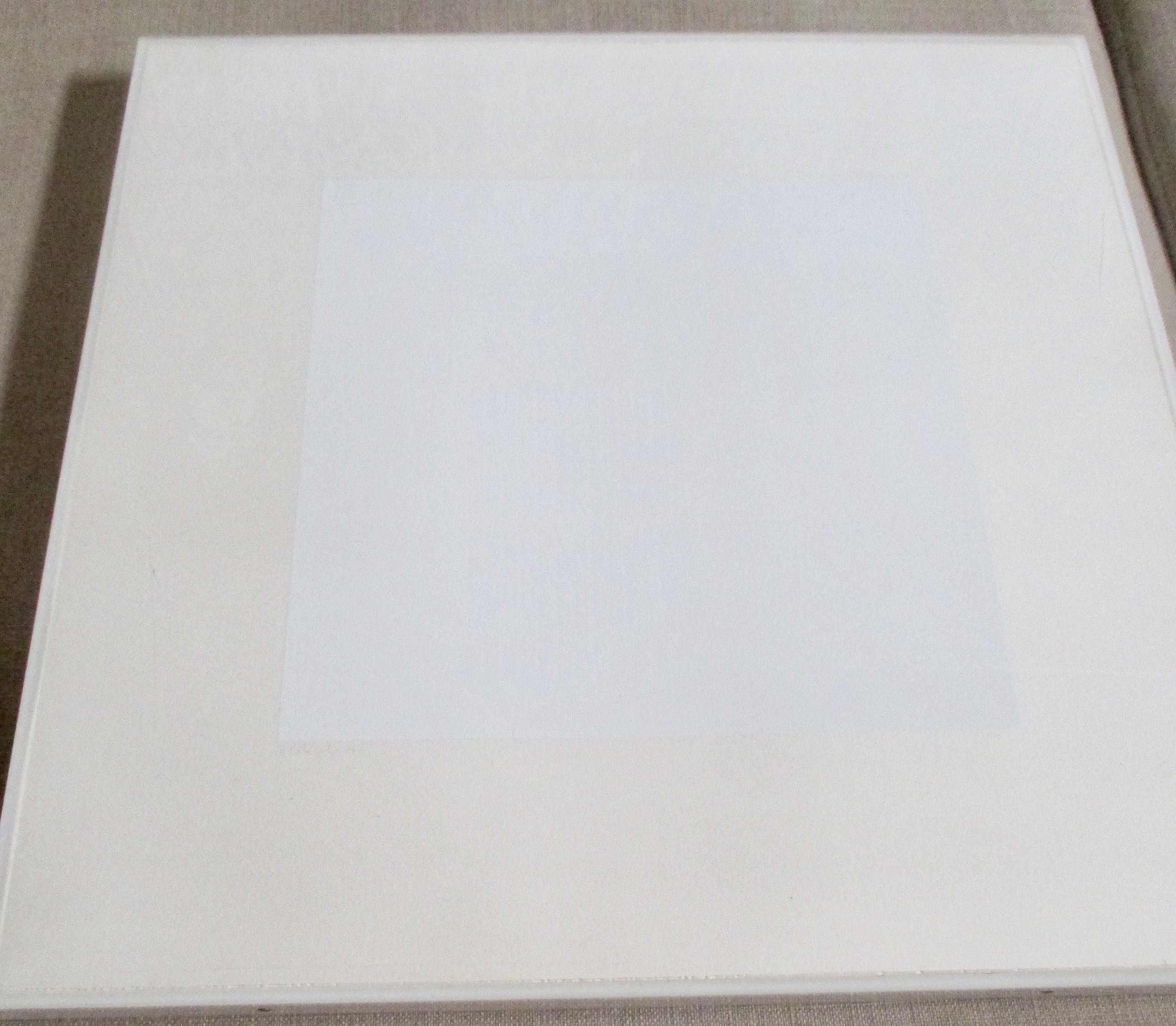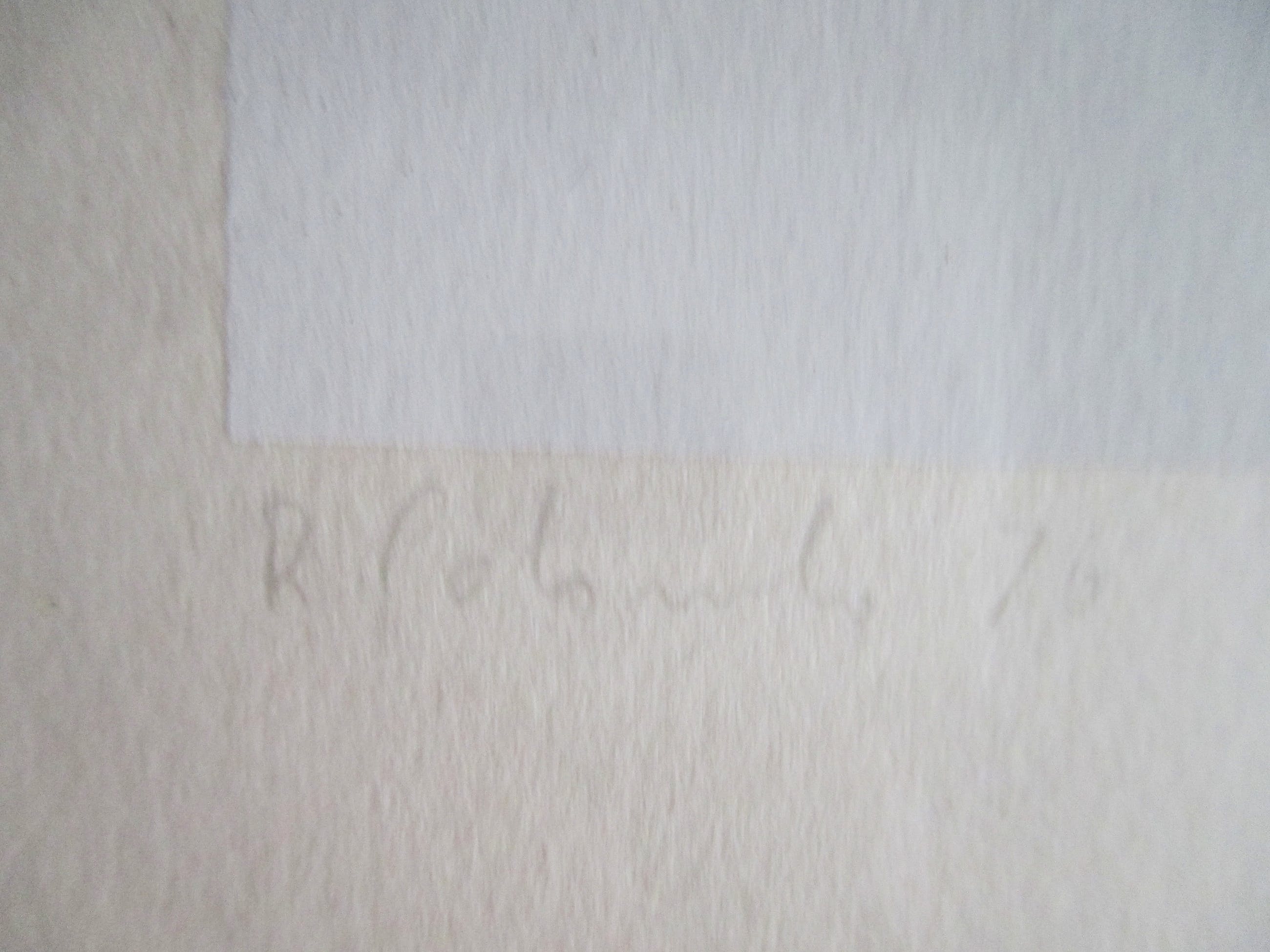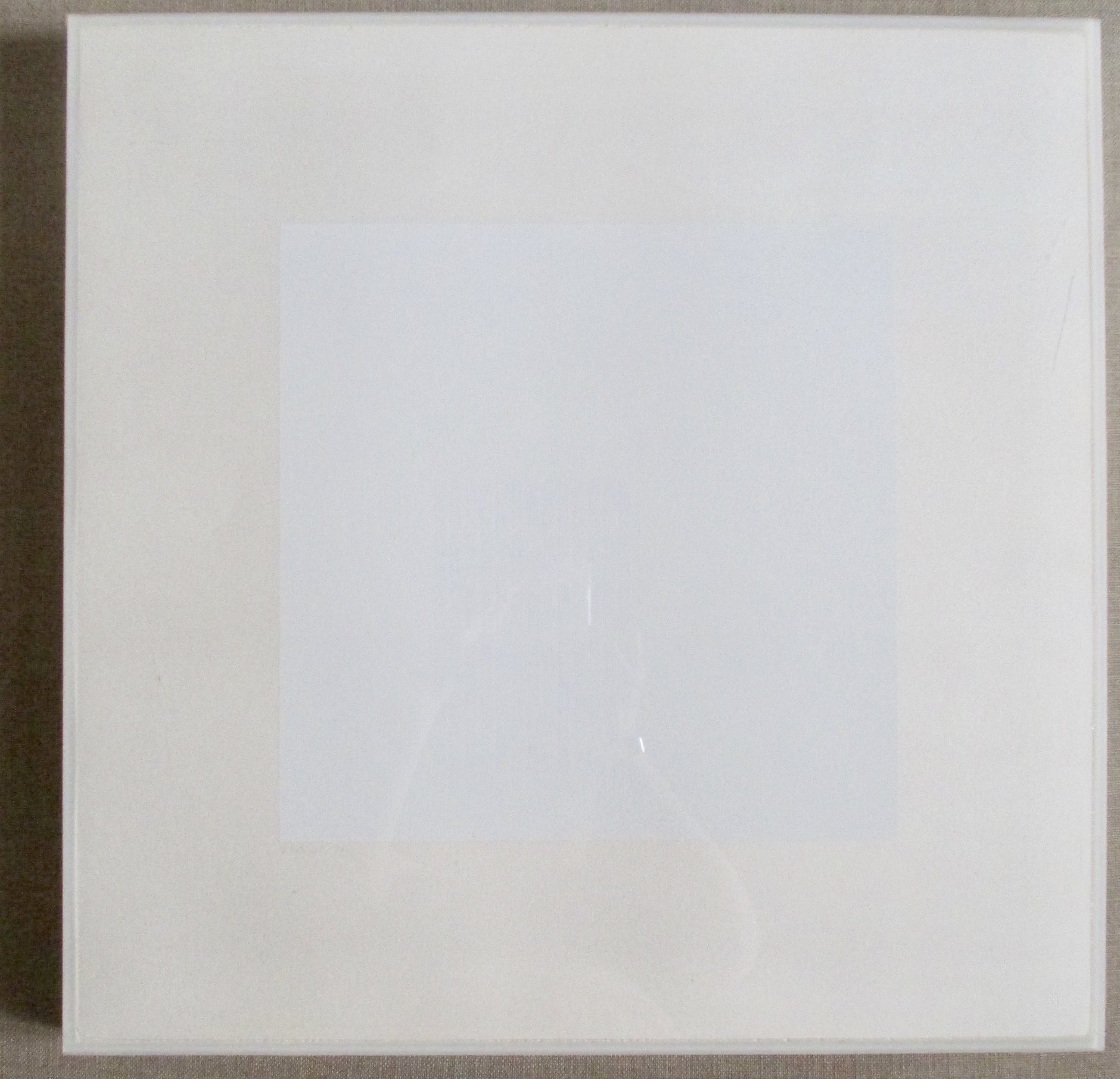 Zeefdruk, gesigneerd, gedateerd en genummerd in potlood. Ingelijst in plexiglas box. Het is lastig het beeld op de foto te krijgen door de spiegeling van het plexiglas en doordat het heel licht is, iets links van het midden zit een gedeelte verticale kleine lichtgrijze streepjes die rechtsonderaan omvallen. Verzending 18 euro aangetekend