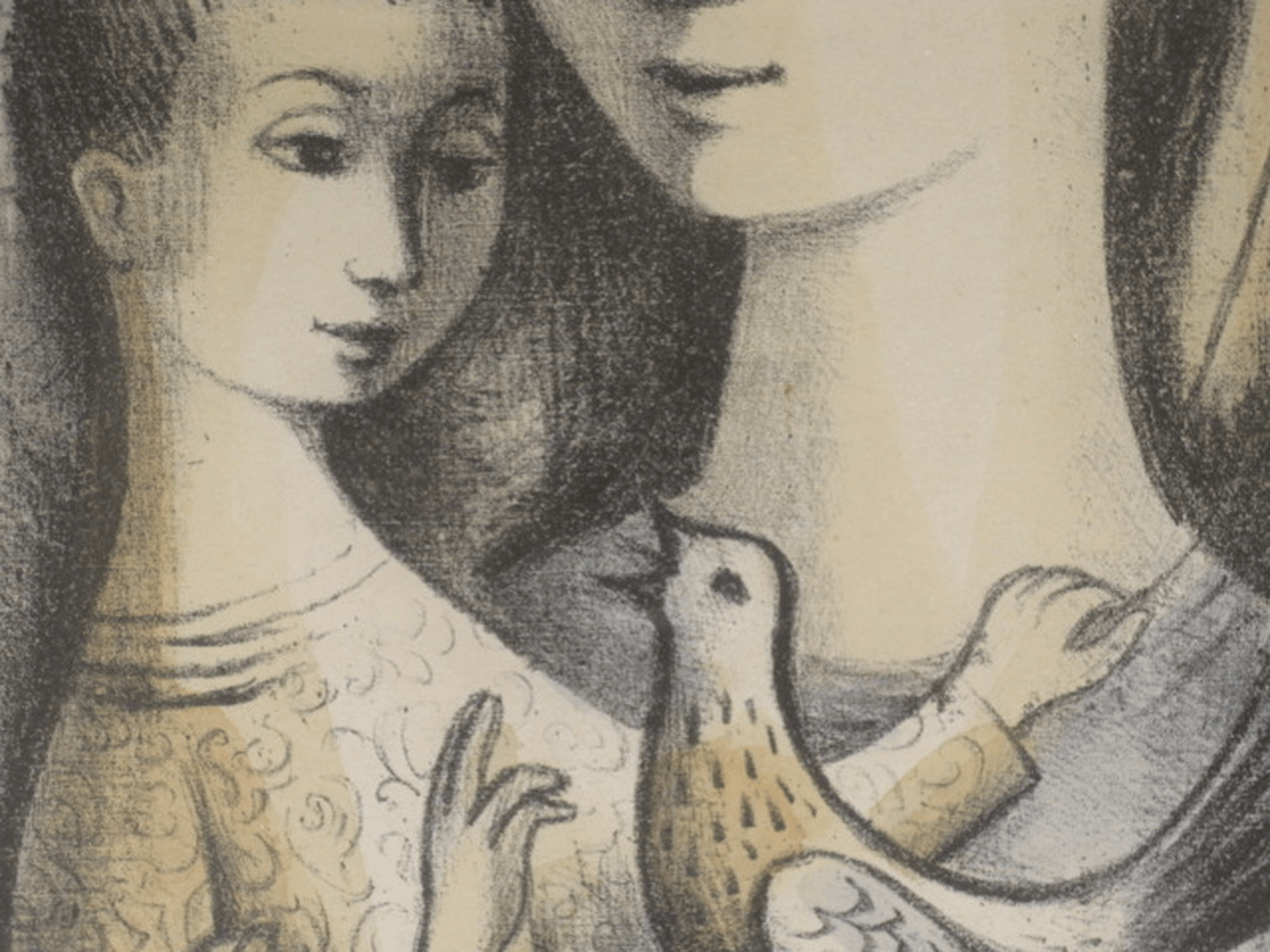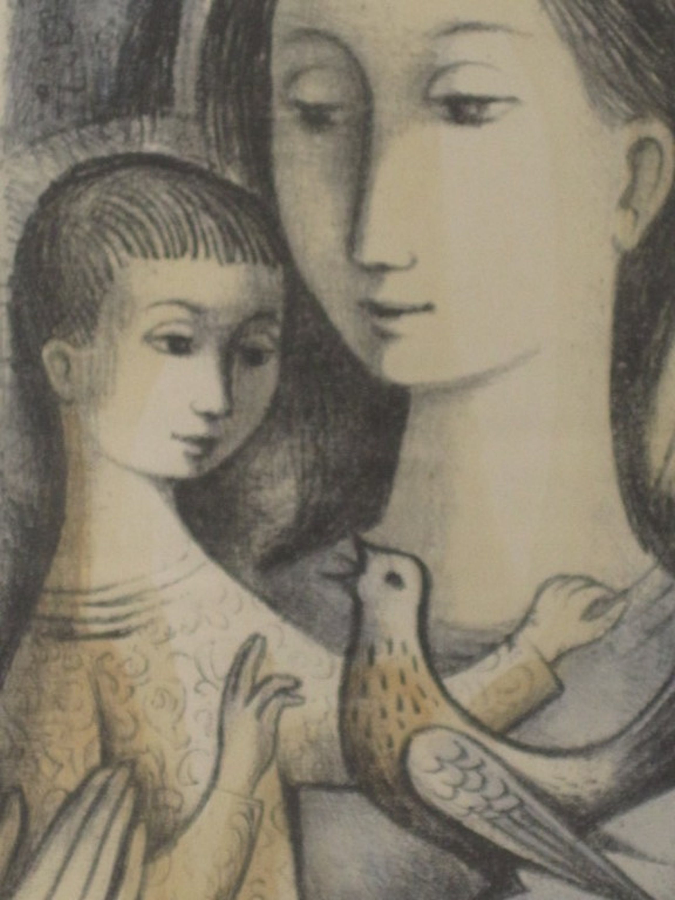 Onbekend - Ingetogen 1958 gesigneerde "Maria en kind" litho in de stijl van Charles Eyck - Verkocht