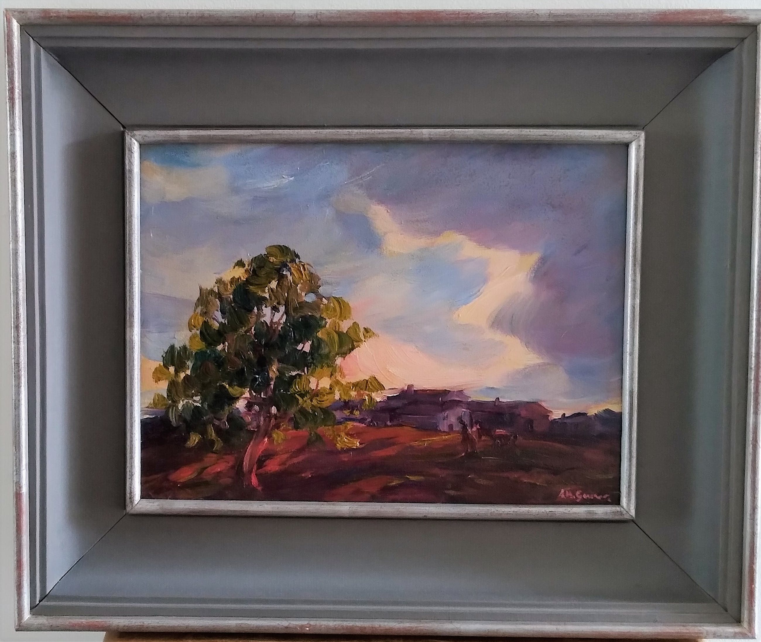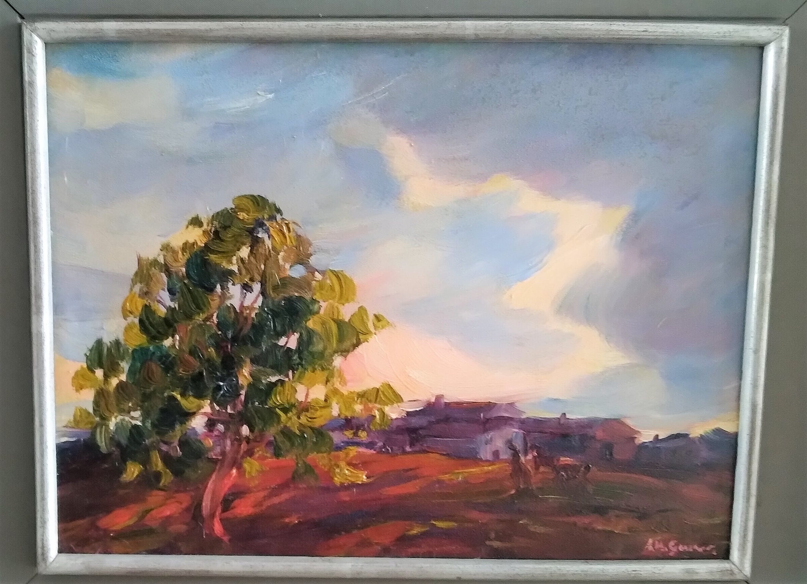 Bijzonder mooi, sprekend werk!Het platteland, omarmd door vurige luchten.