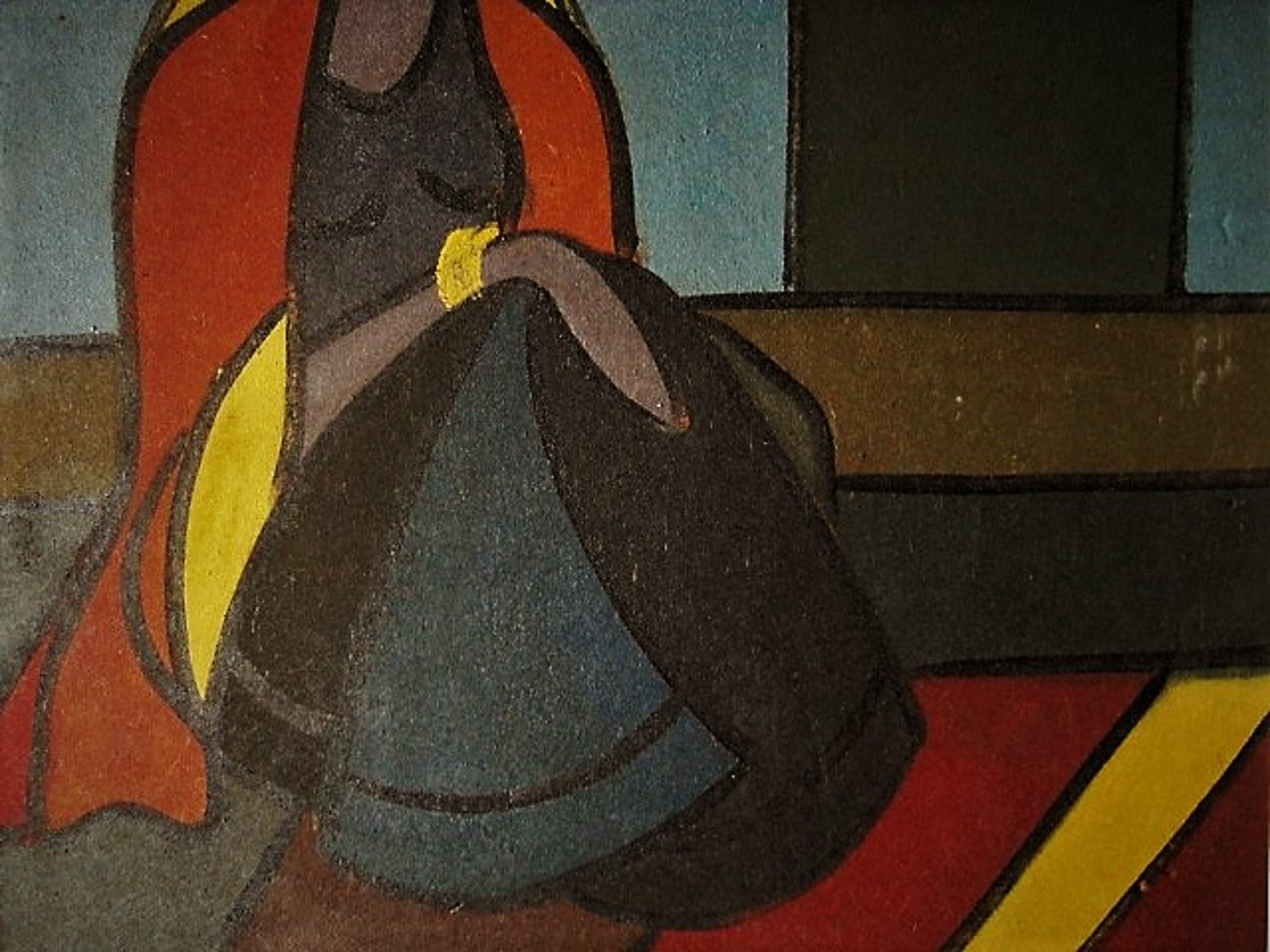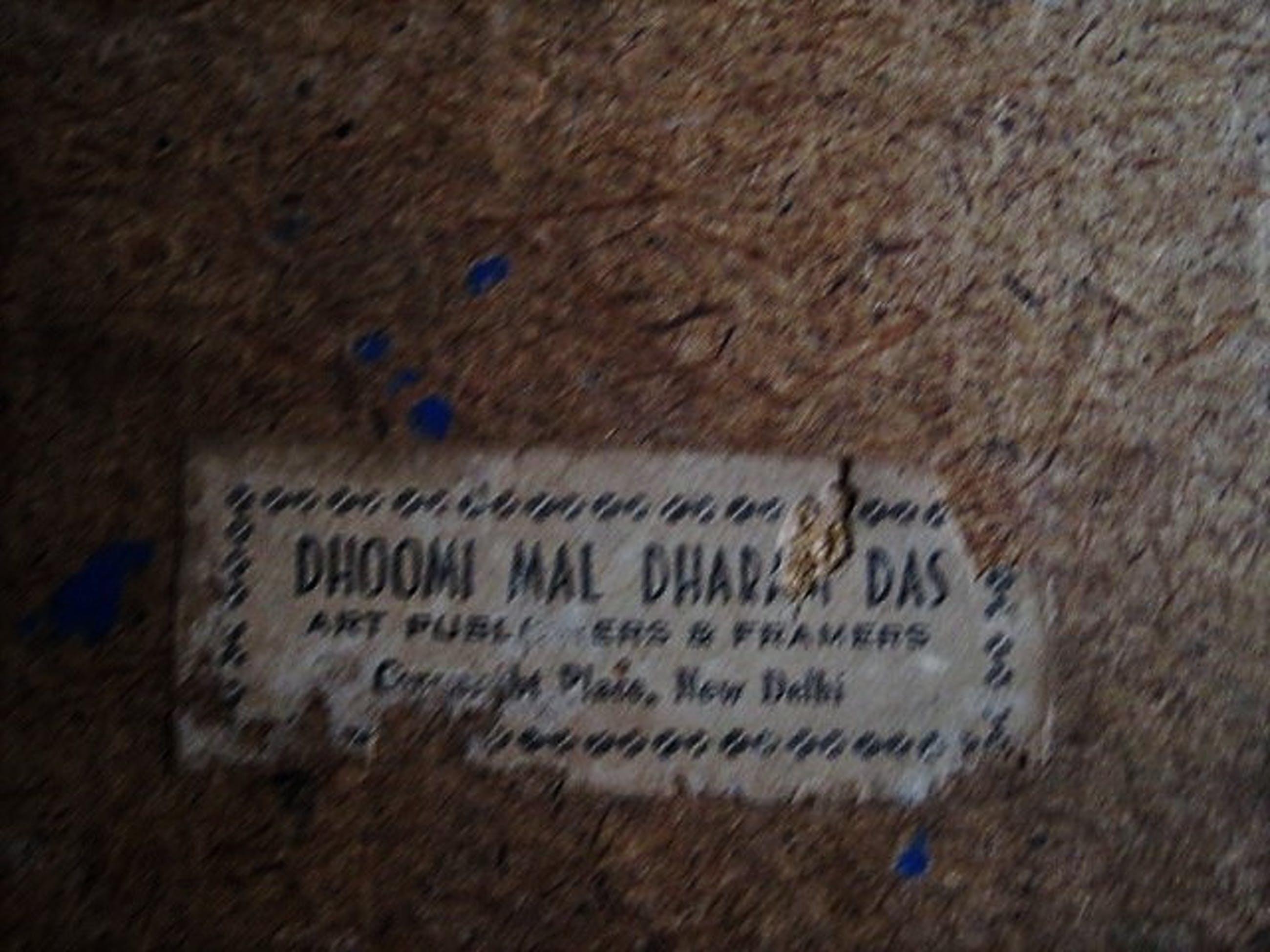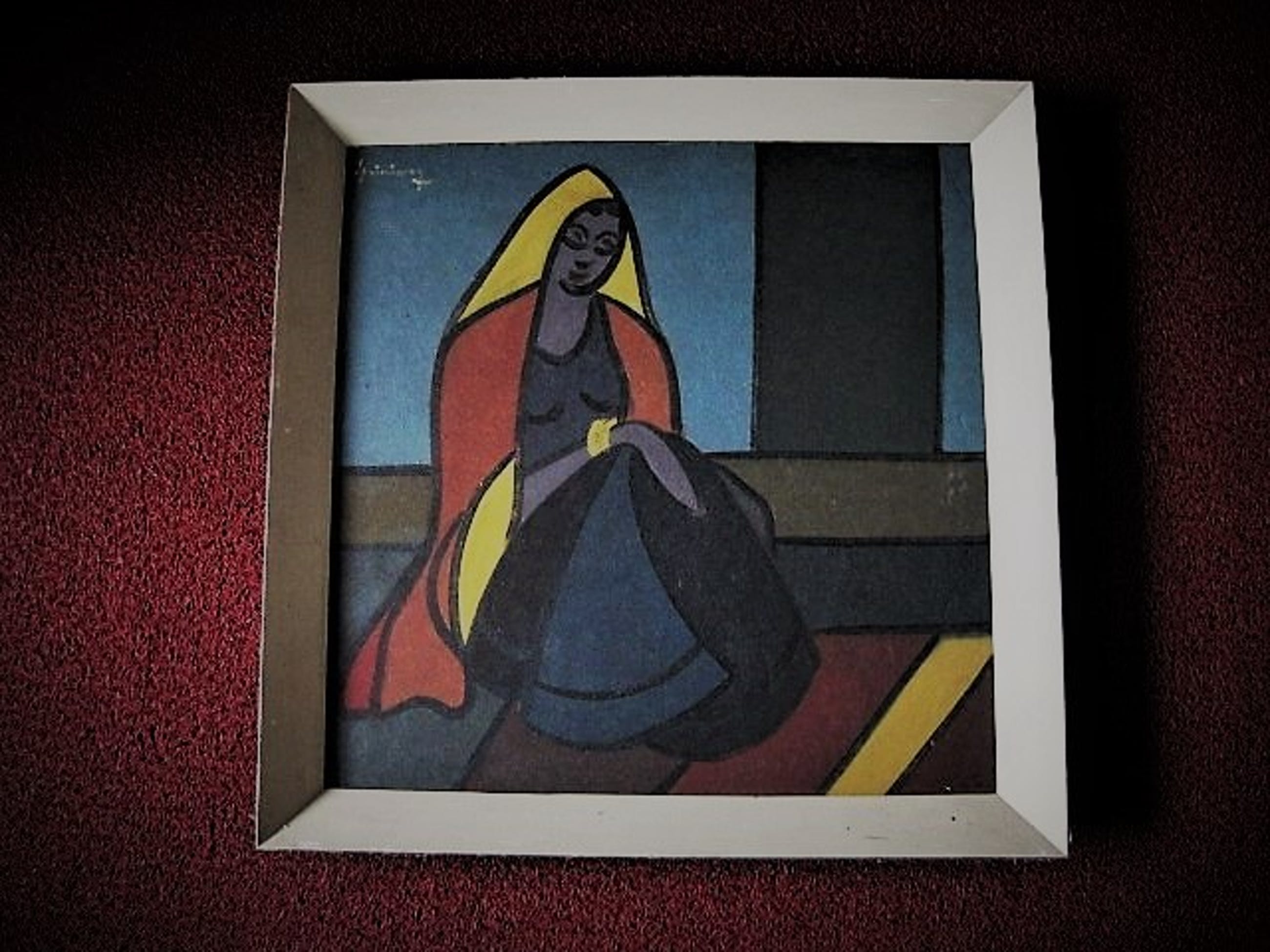 Zeer bijzonder Indiaas olieverf op board schilderij, geschilderd omstreeks 1940 in een bijna Kubistische stijl. Linksboven gesigneerd en destijds verkocht bij de toonaangevende New Delhi Dhoomimal Gallery (label op achterzijde).
