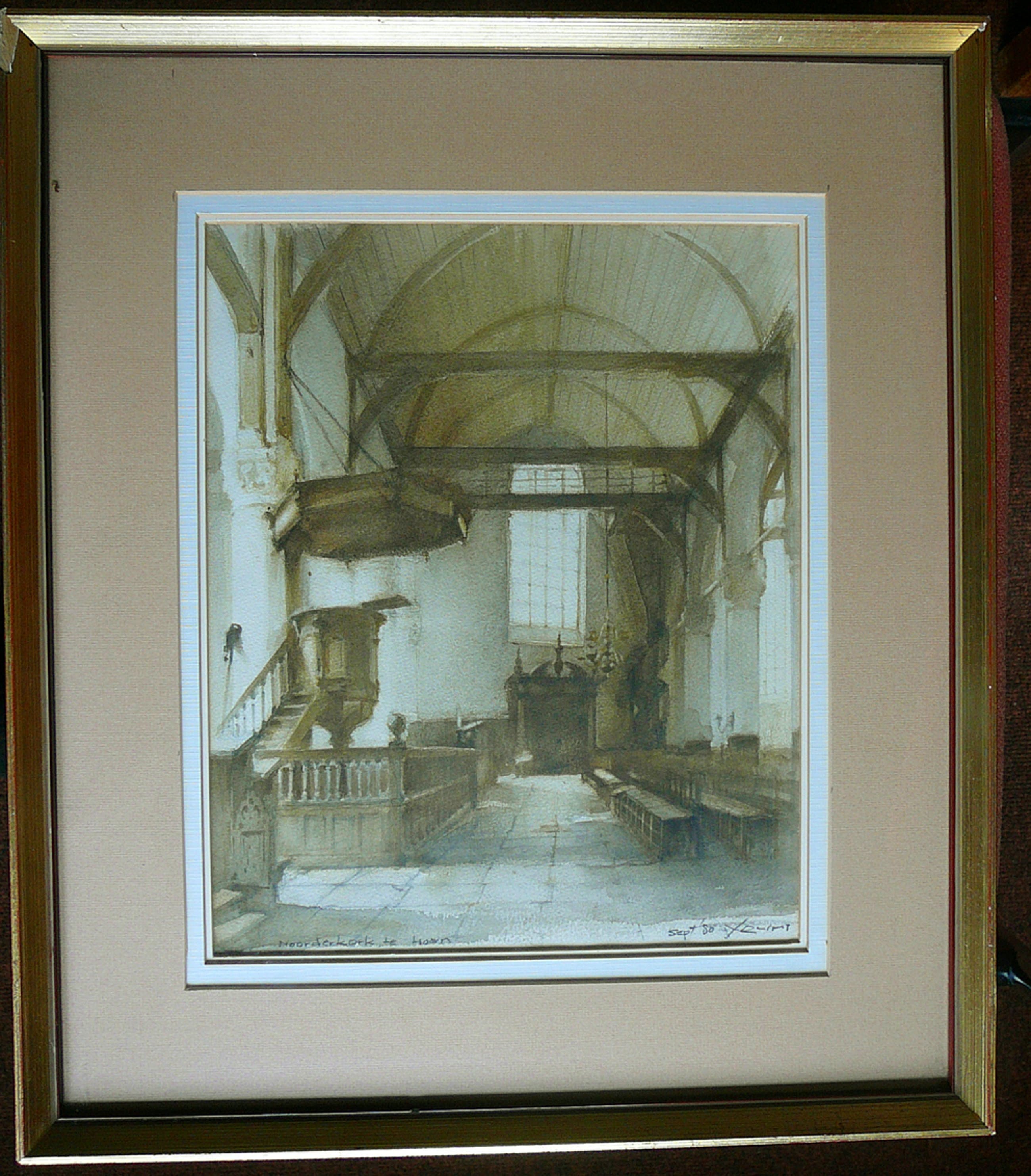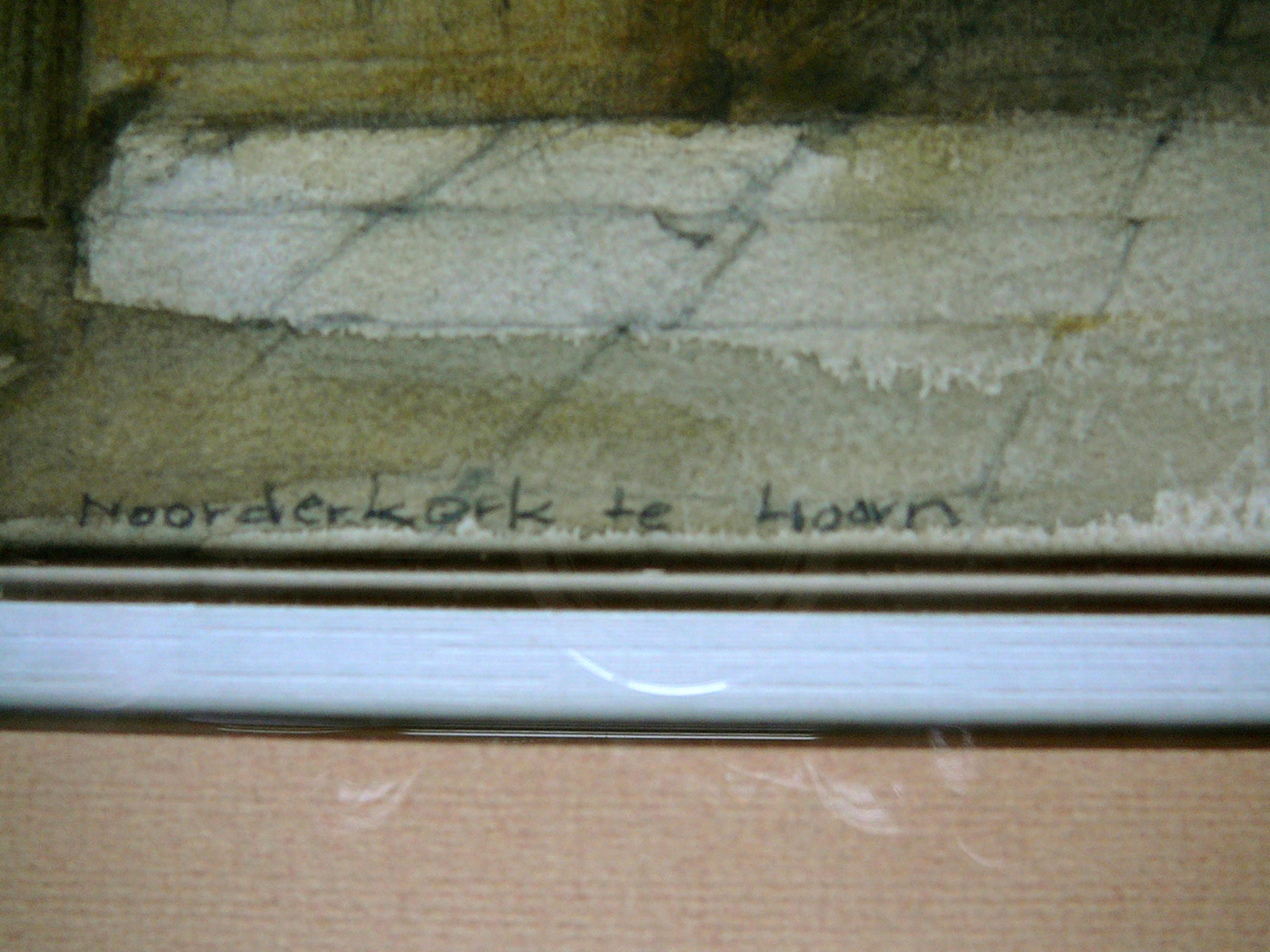 Zeer fraaie aquarel in traditionele sepia kleuren met een voorstelling van het interieur van de Noorderkerk te Hoorn. Het werk is rechtsonder onleesbaar gesigneerd en gedateerd sept. 80. Achter glas en 3-delig gelaagd passepartout. Bronskleurige baklijst met enkele gebruikssporen.