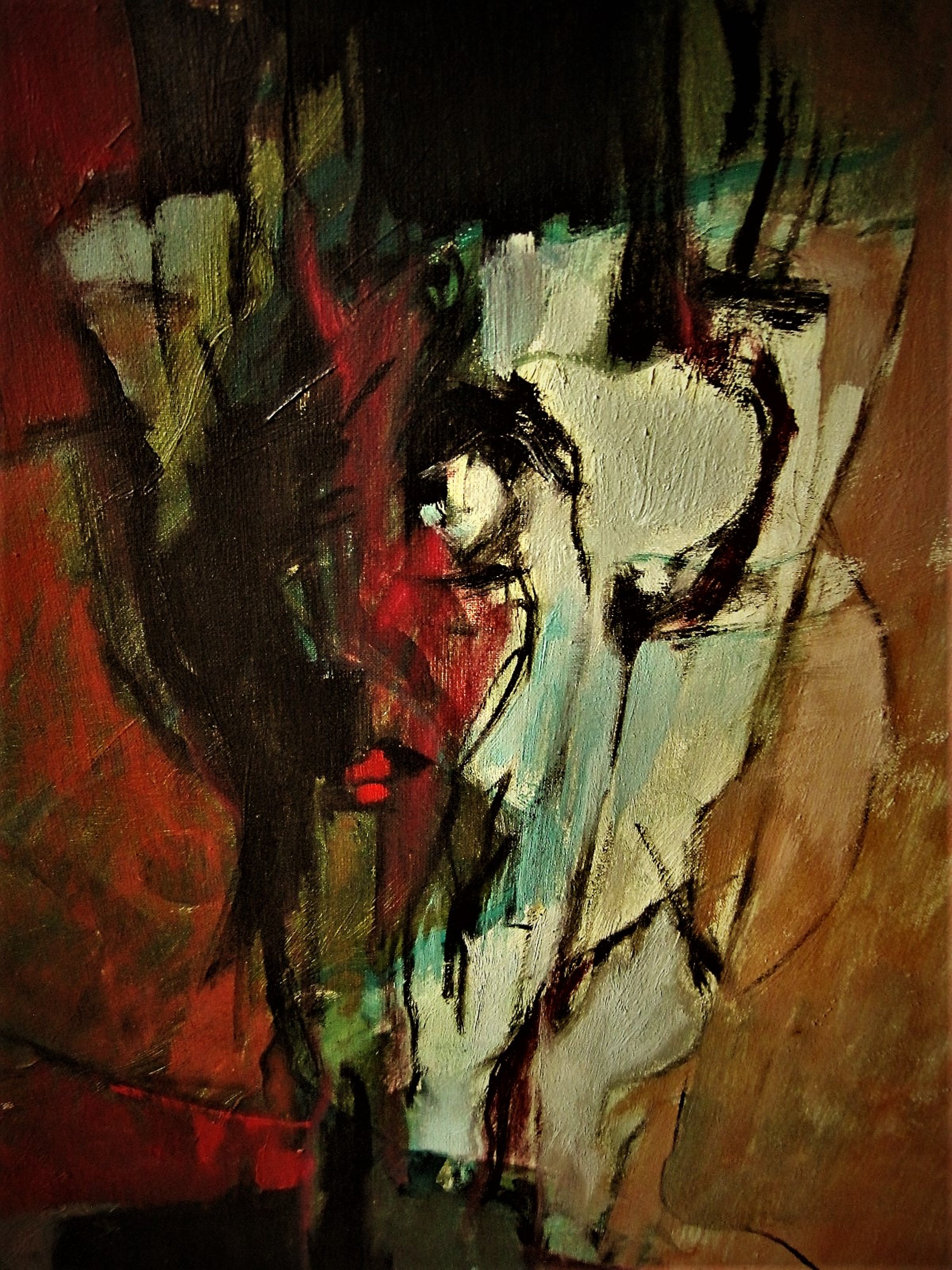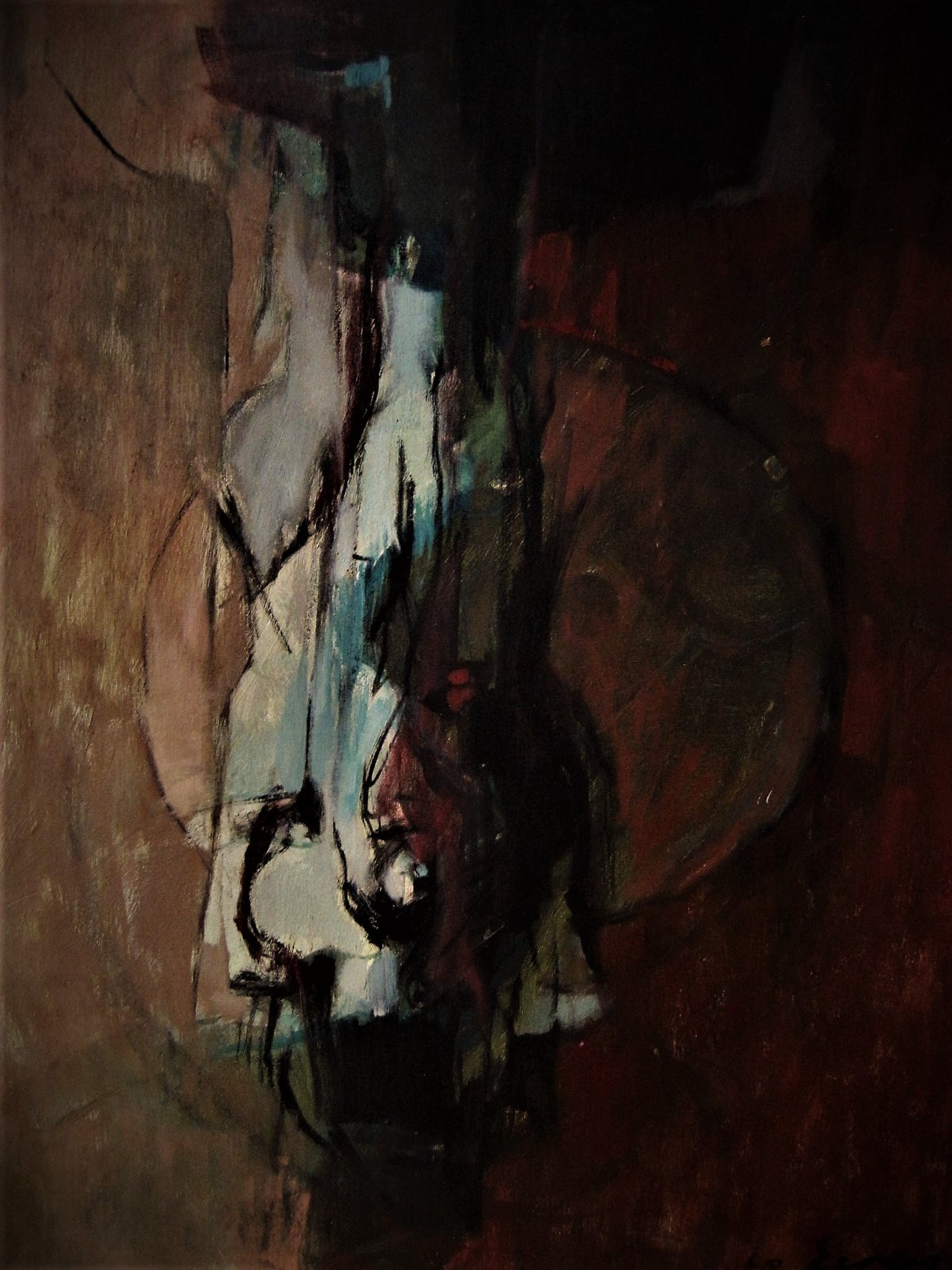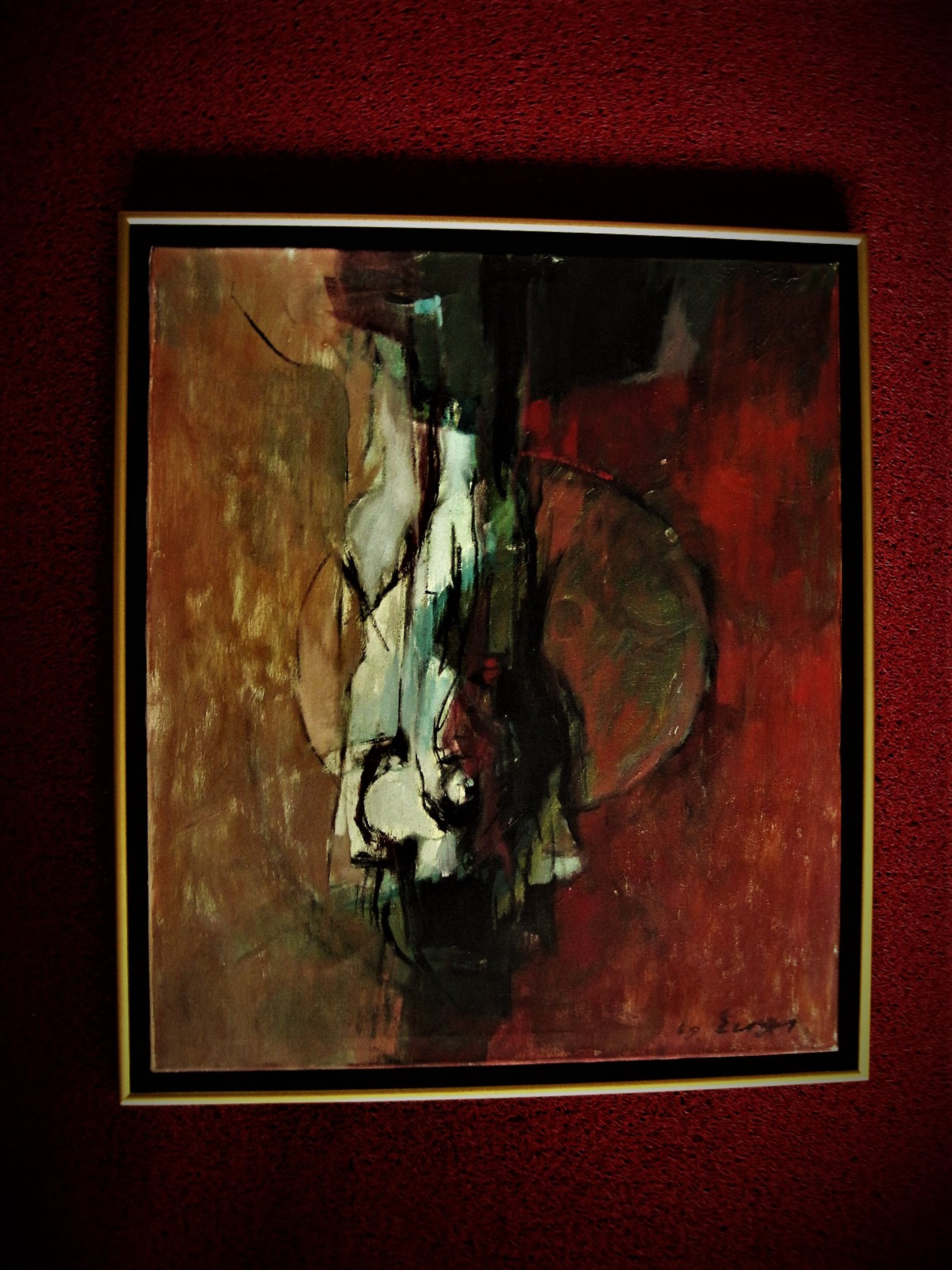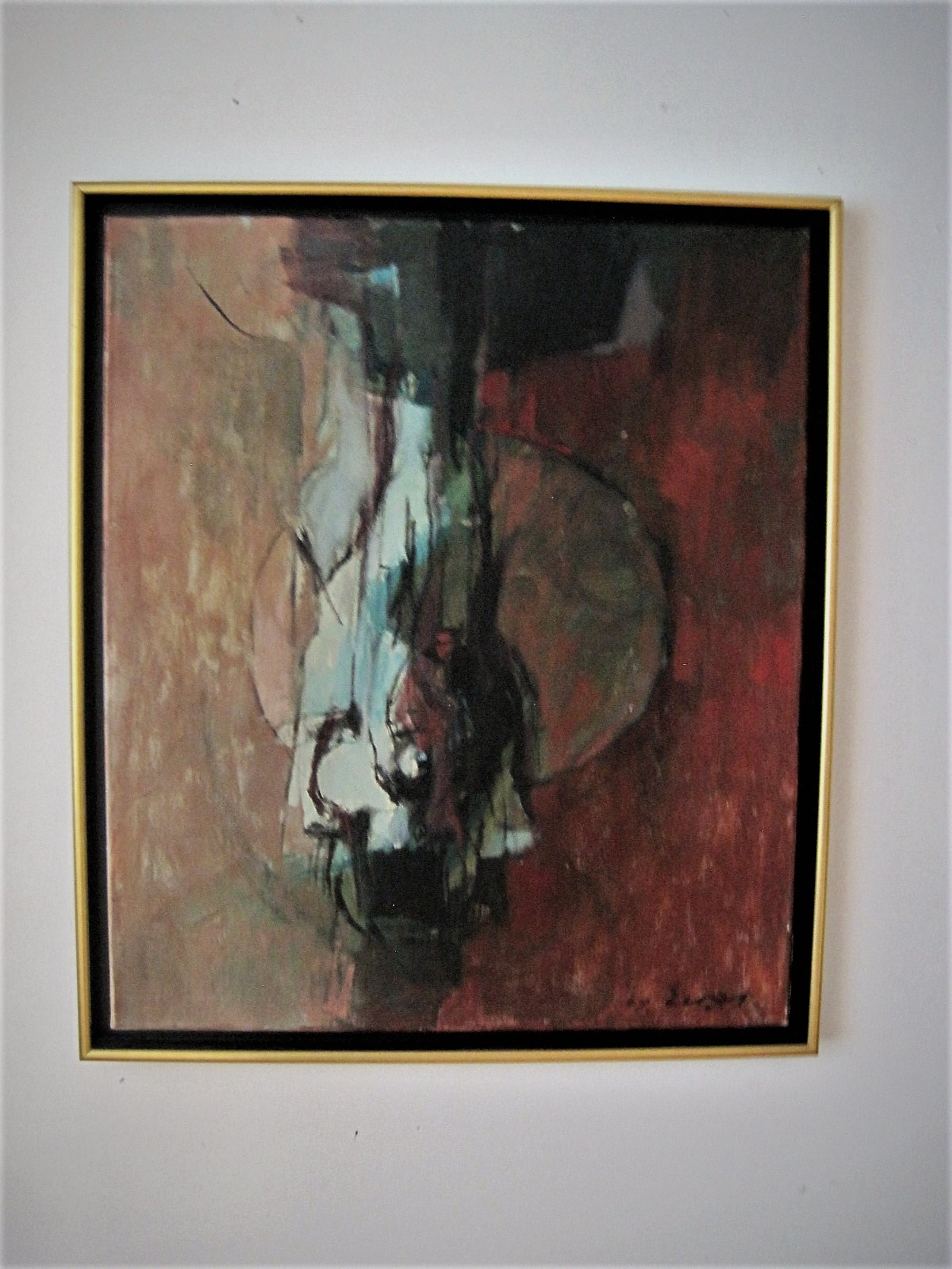 Bijzonder olieverf op doek schilderij met een abstracte voorstelling. die op de achterzijde getiteld is "Meneer Tienoppen". Rechtsonder gesigneerd en gedateerd Eug.. 69