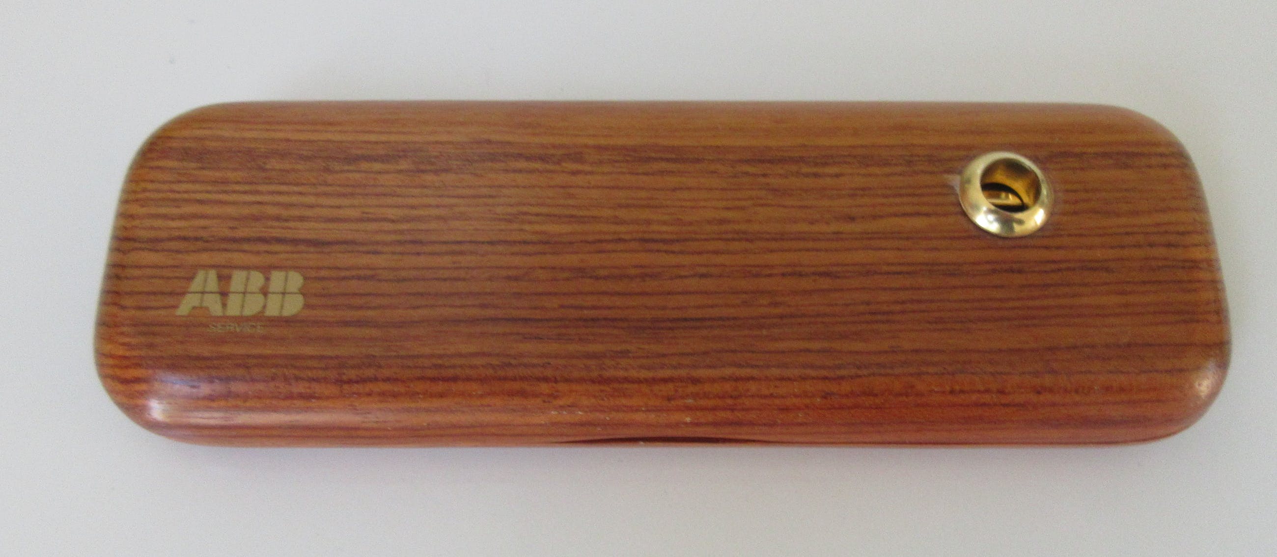 Een retro pennenset van Houten en gouden pennen (balpen en vulpen) van Iridium Point in een mooie houten doos. Gemaakt als relatiegeschenk voor de firma ABB Service. Geproduceerd in de jaren 1980 in Duitsland. De bovenzijde van de vulpen heeft lichte corrosie zoals in de foto's.