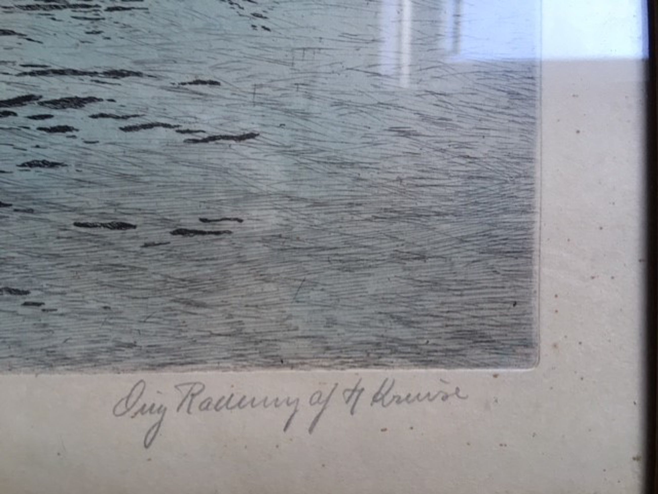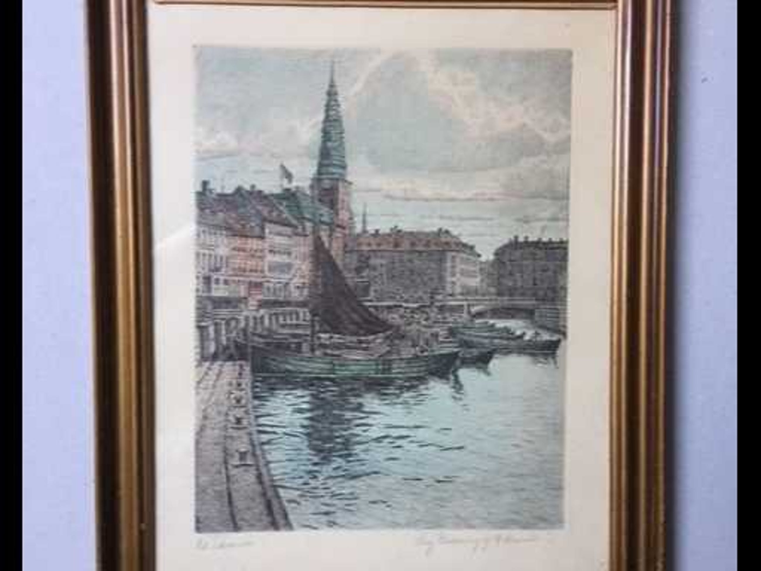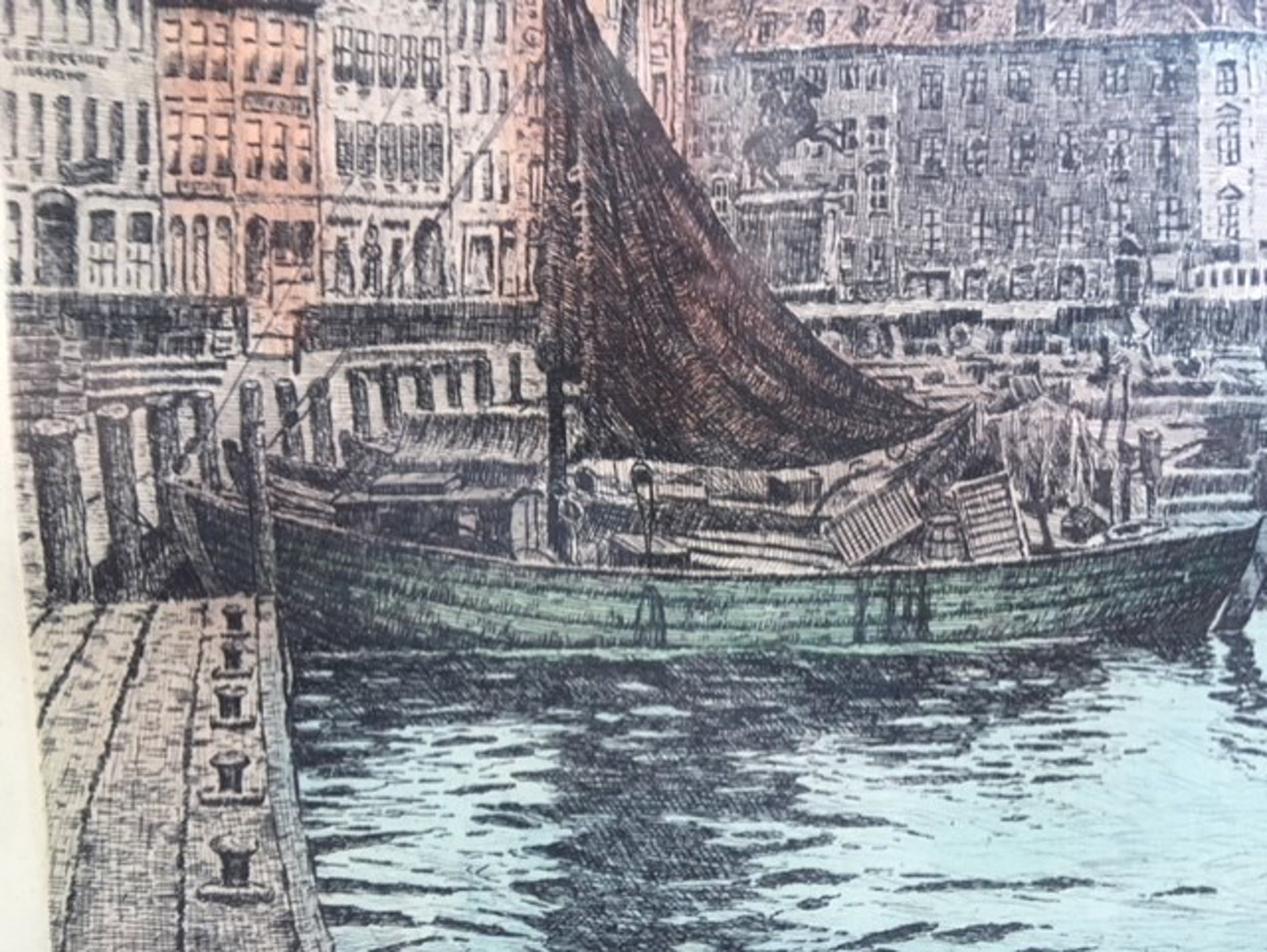 Kleurenets van onbekende kunstenaar: Italiaans havengezicht.Potlood gesigneerd, ca. 1950.Afm. incl. 39 x 32 cm.