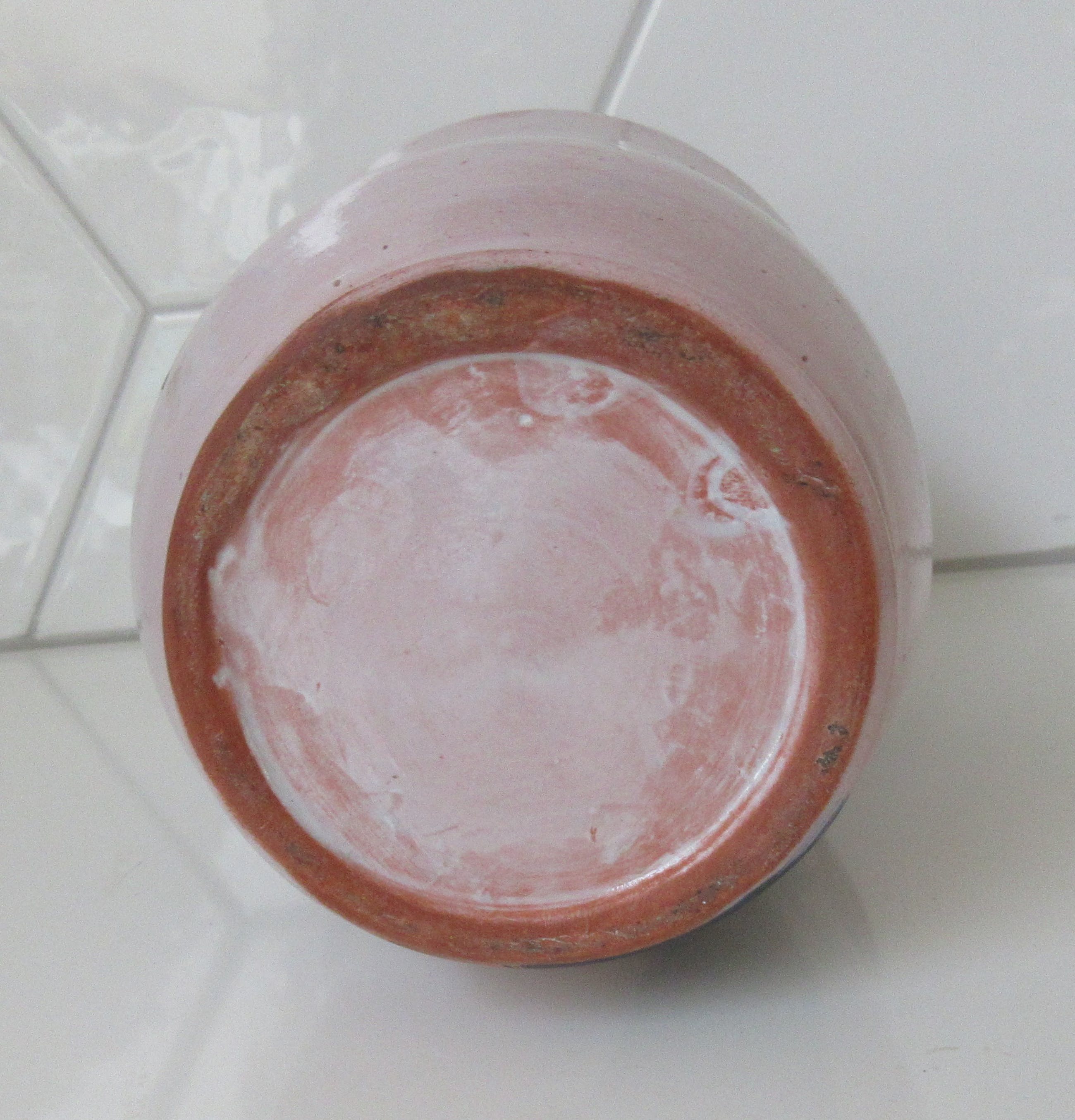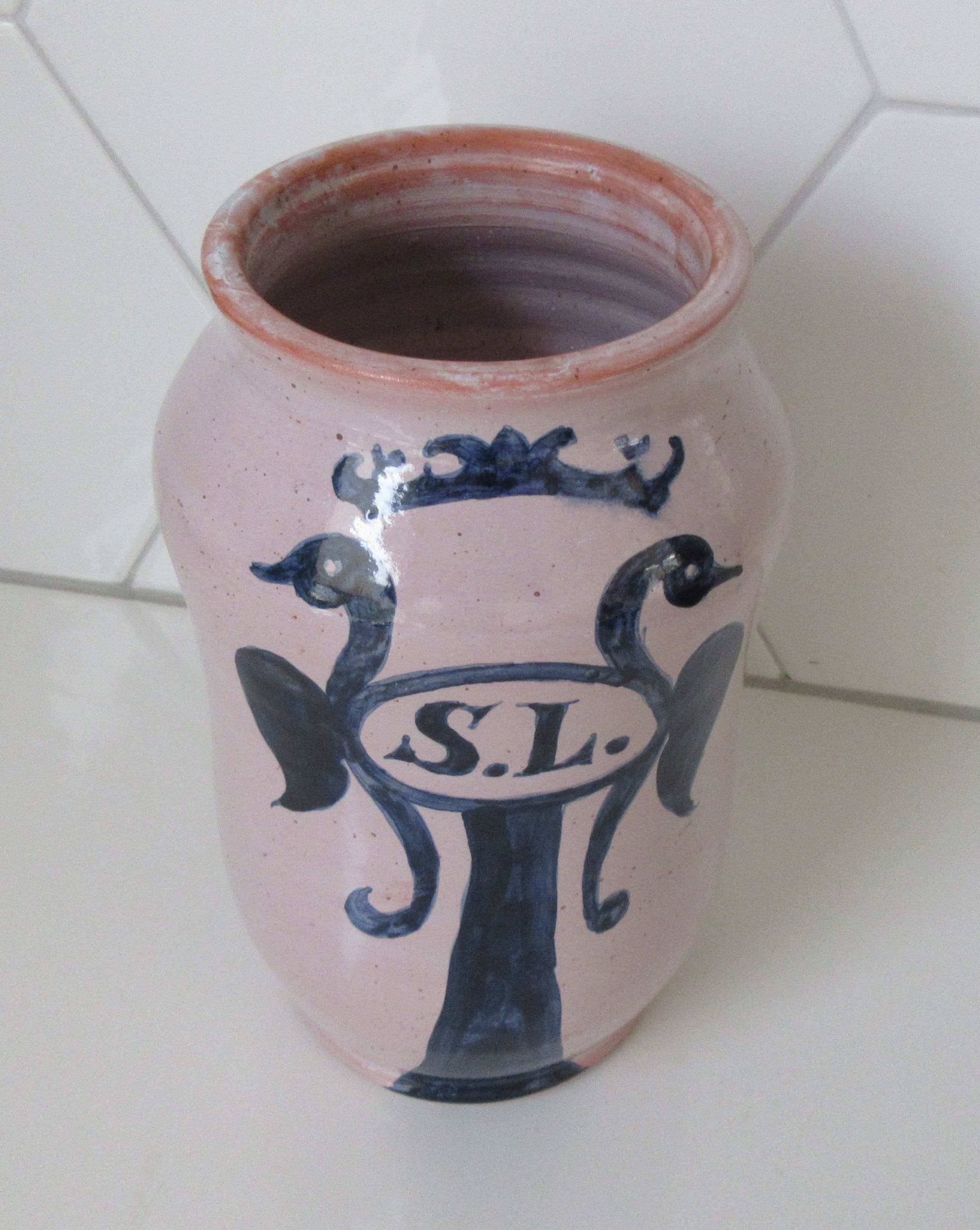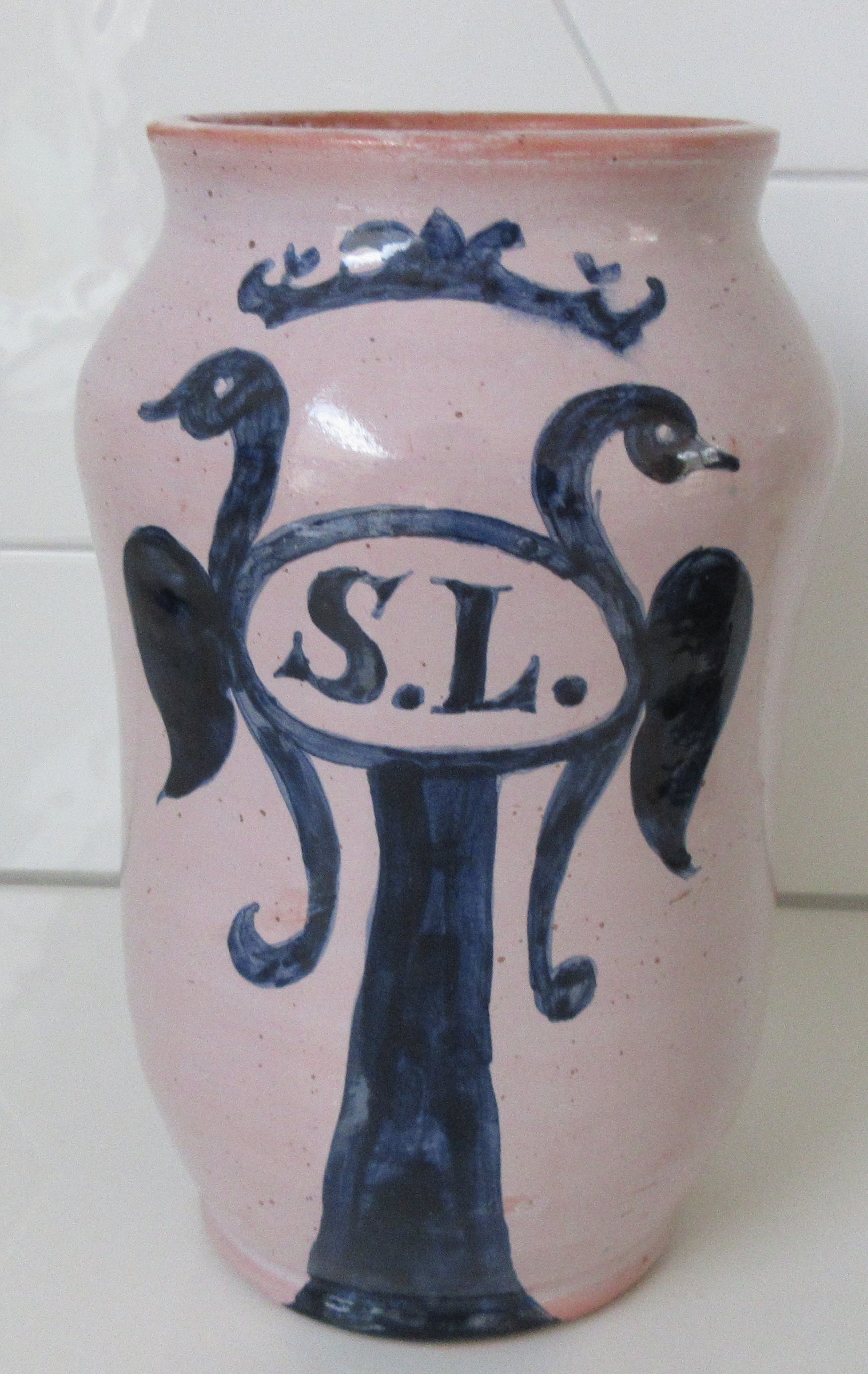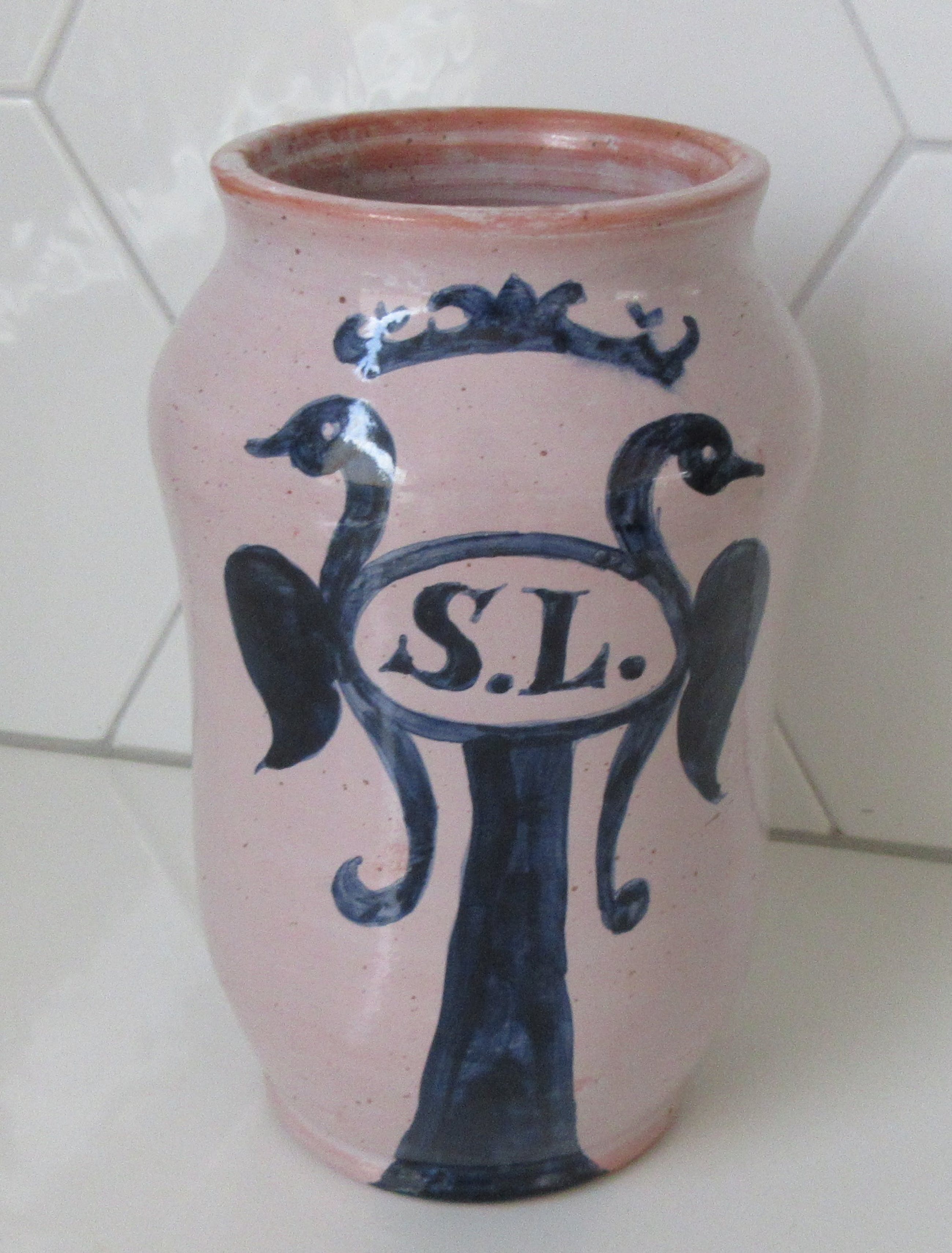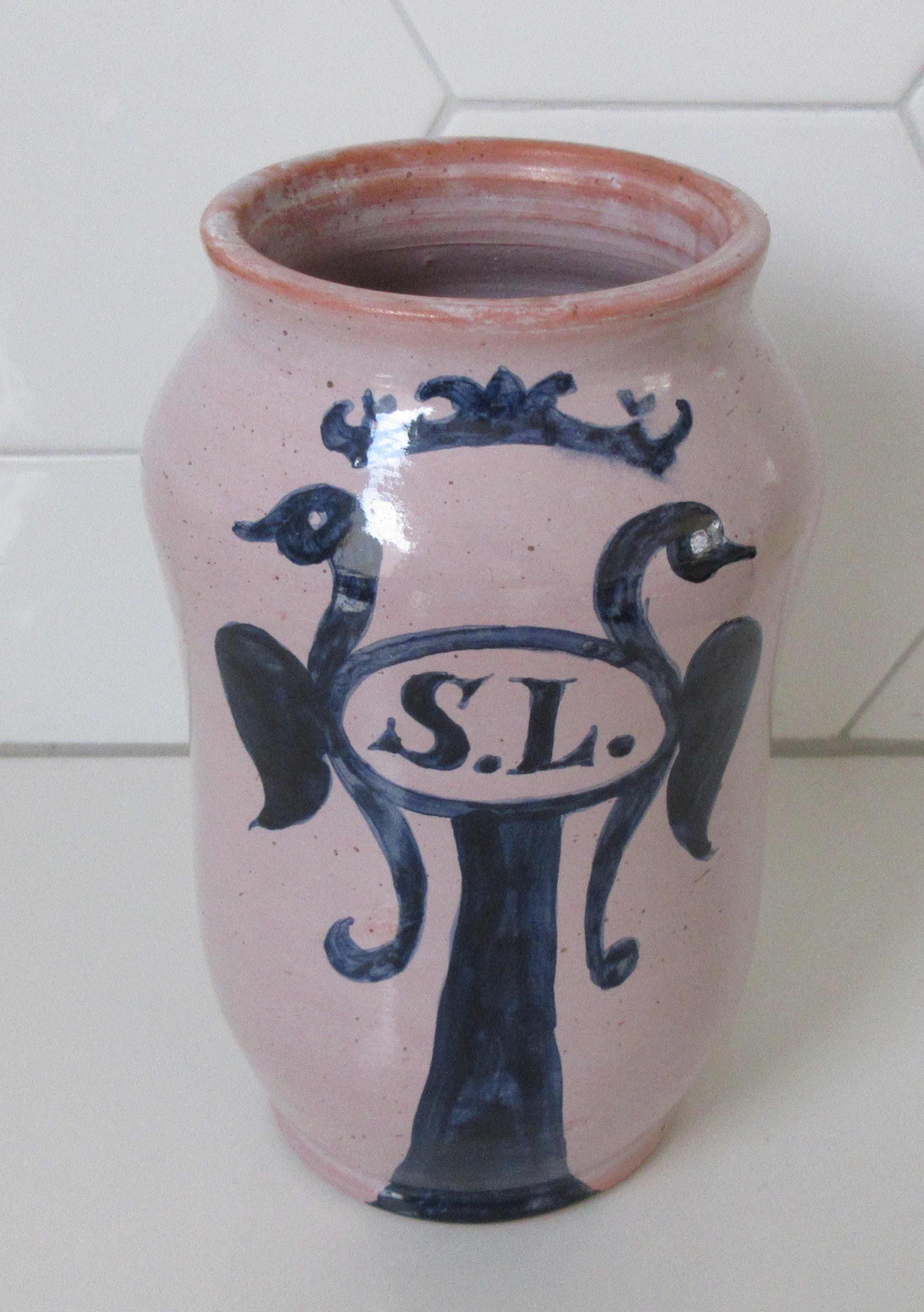Very nice looking early 20th century red Majolica Italian Albarello Apothecary Jar. White glazed and hand painted in deel blue with a coat of arms with a crown above and beneath two blue birds and the letters S.L. In prefect condition but unmarked.