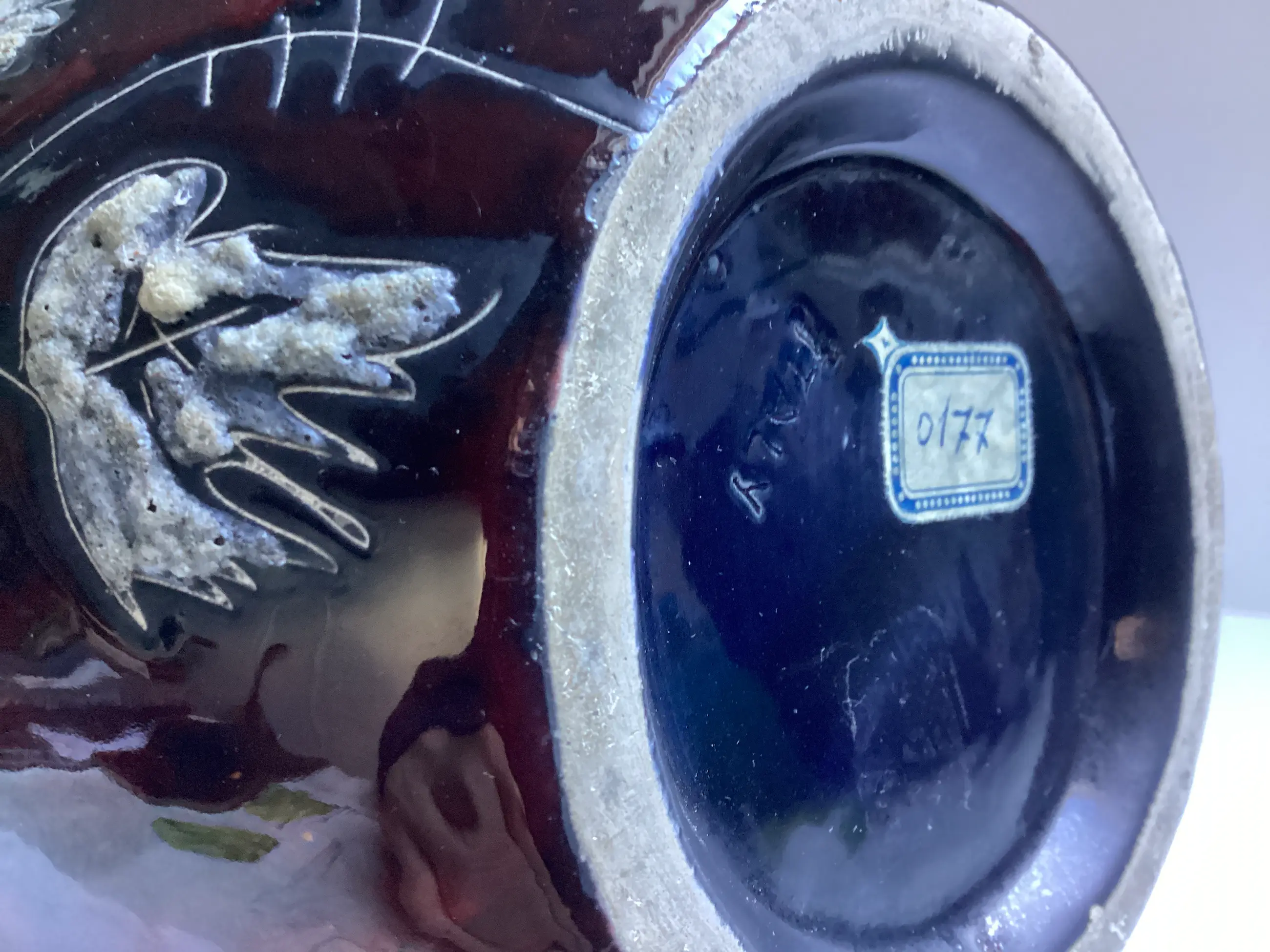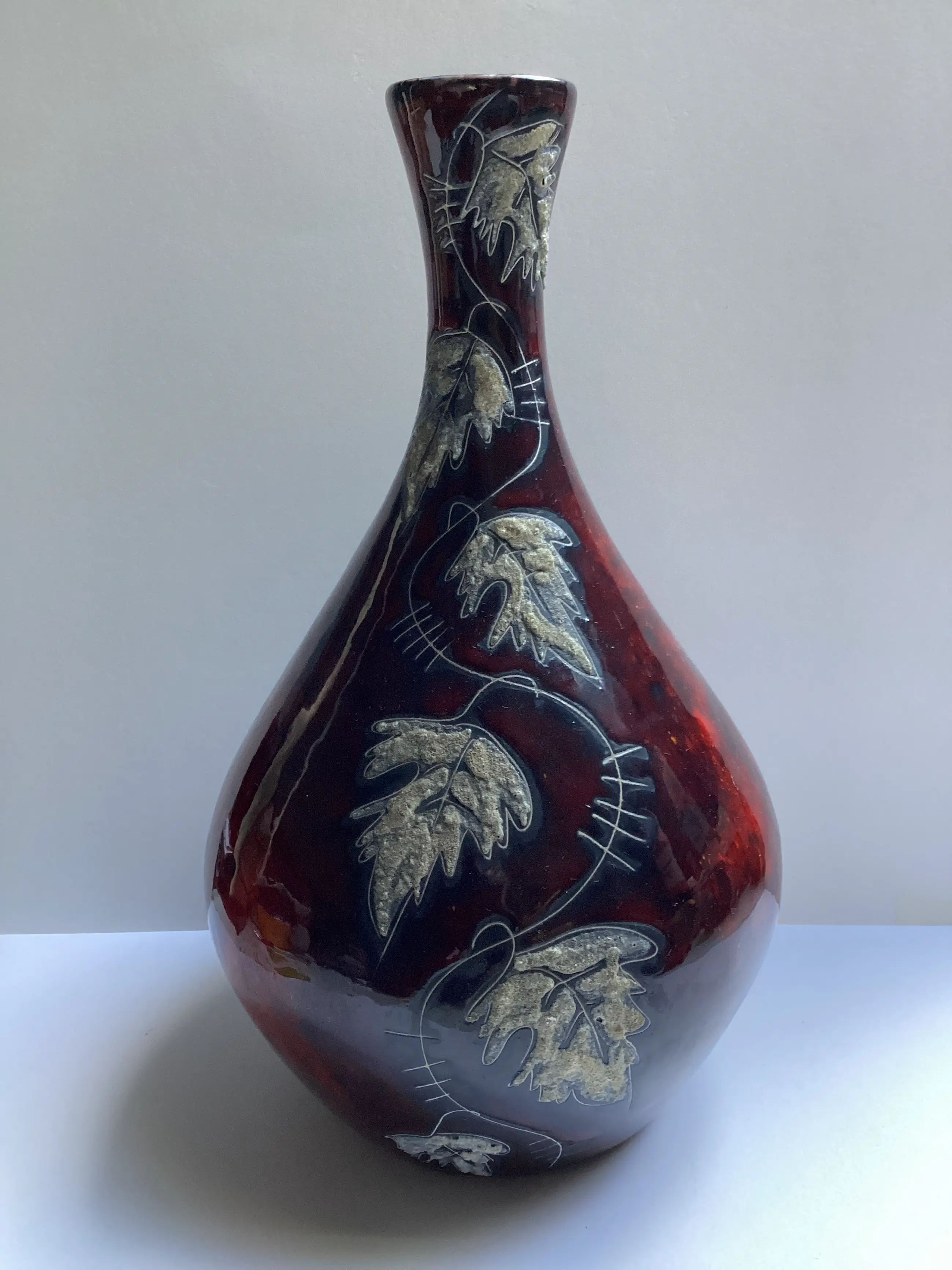 Decor: in sgraffito techniek uitgevoerde verticale florale voorstelling in donker rood met lichtere vlekken.
