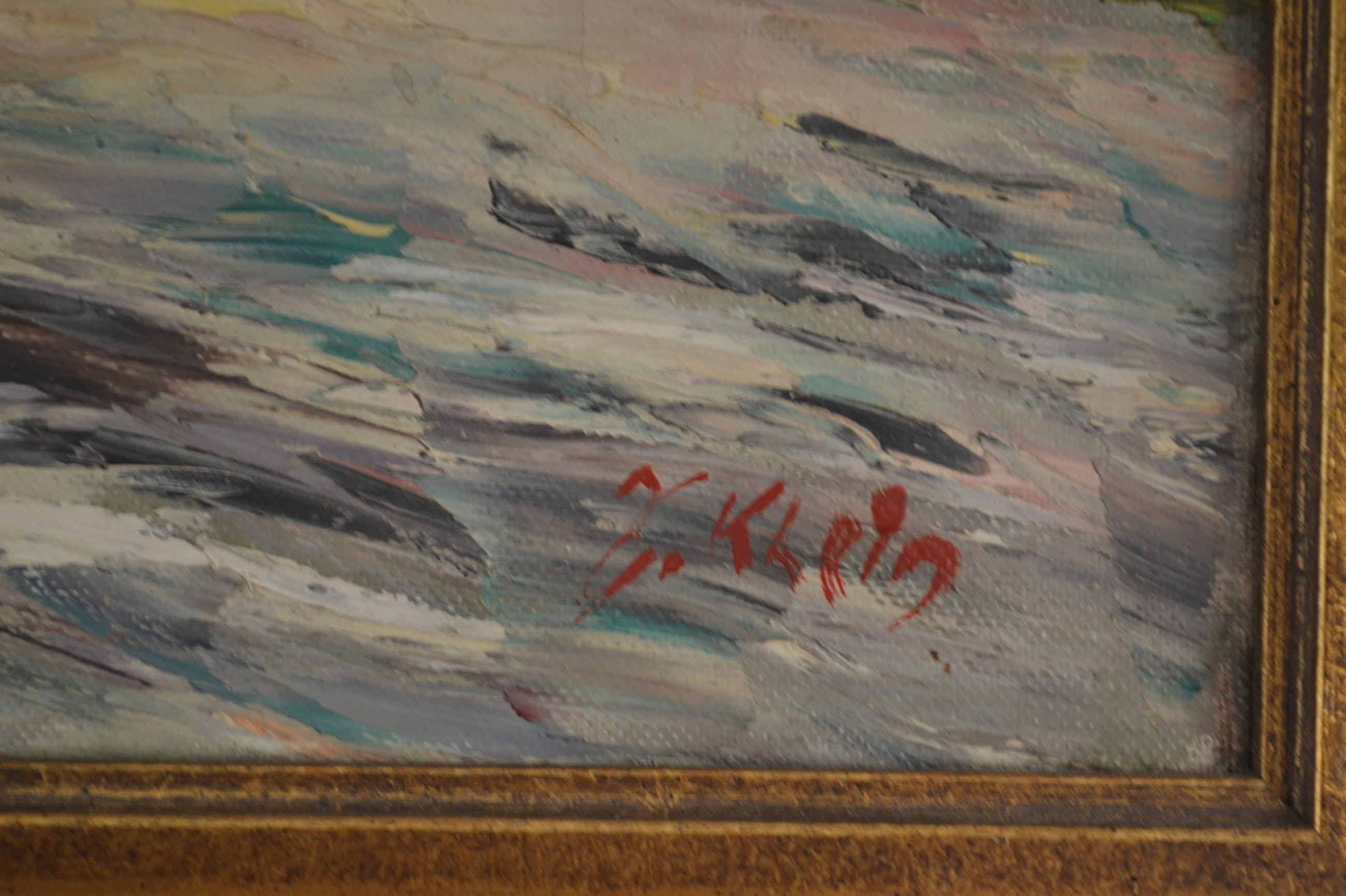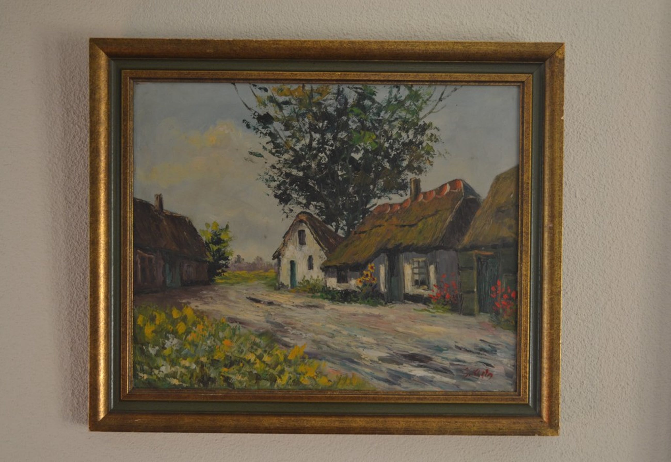 Net schilderij van een boerenhoeve. Olieverf op doek en rechtsonder gesigneerd, J(?) Klein.