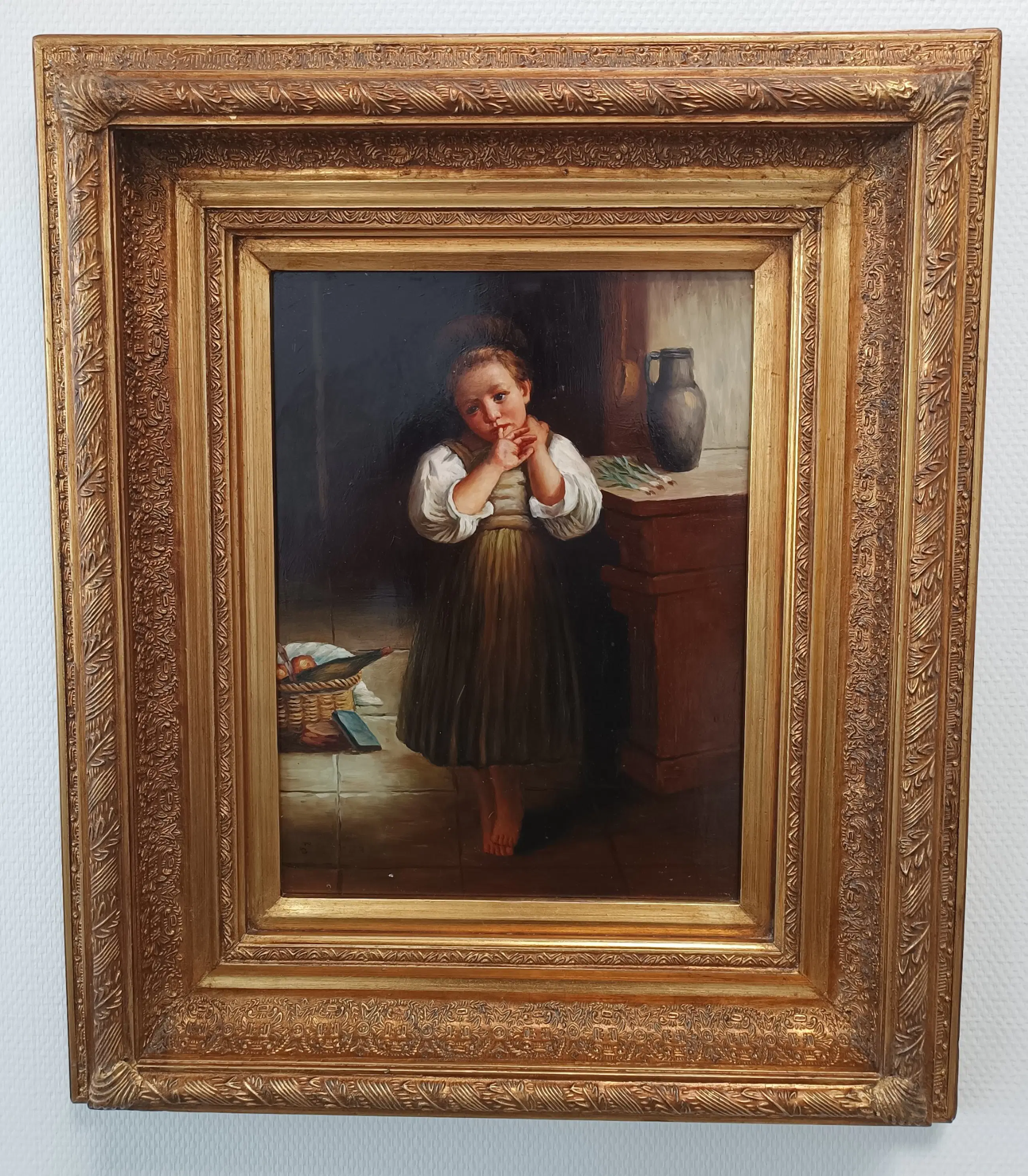 Warm genreschilderij met een meisje op blote voeten in een keukeninterieur: links een mand met fruit en fles, rechts een aarden kan en een bos asperges op het aanrecht. Sfeervol licht-donker en fijn uitgewerkte gelaatsuitdrukking. Het werk wordt geleverd in een rijk geornamenteerde, vergulde lijst.