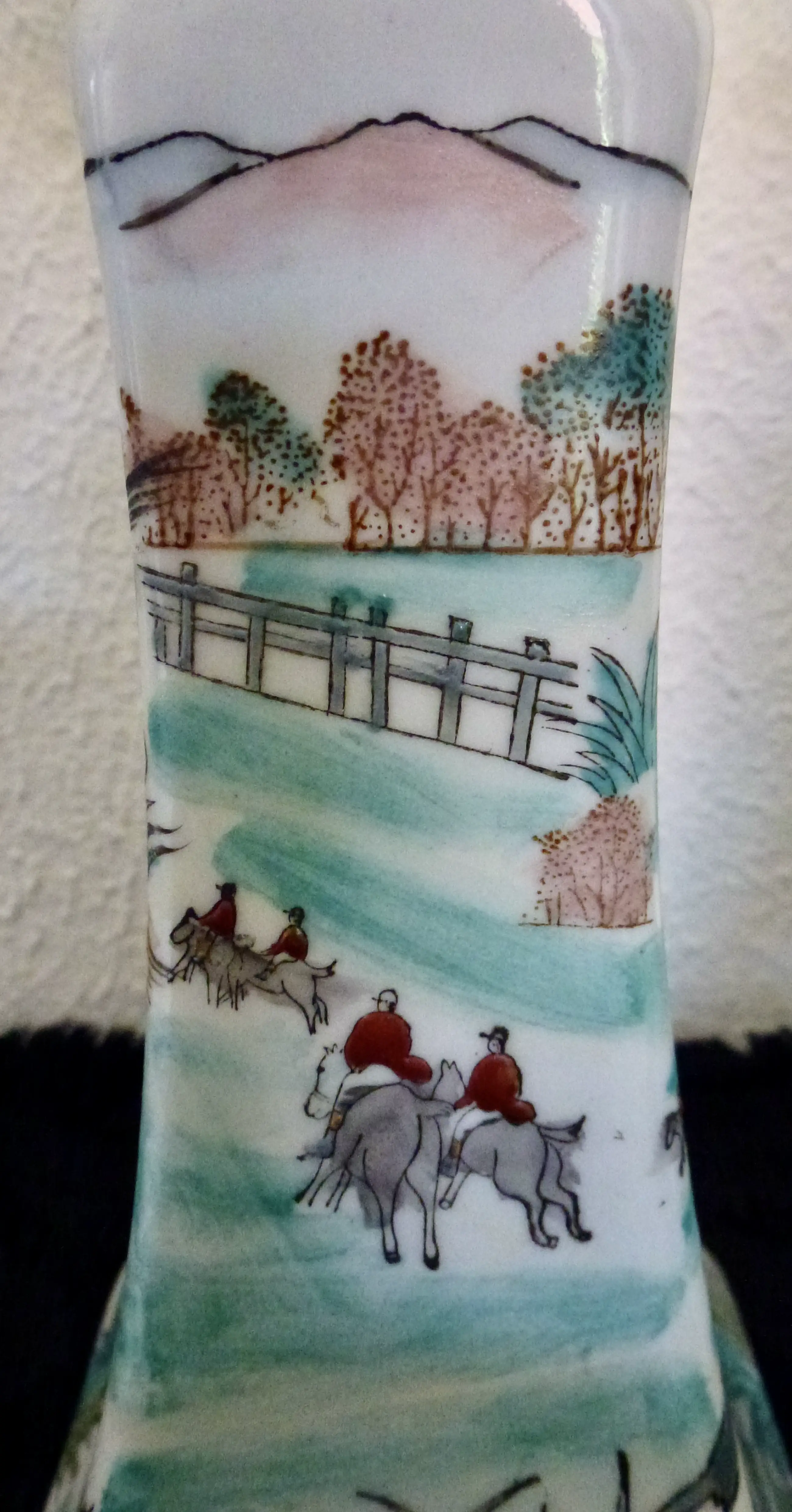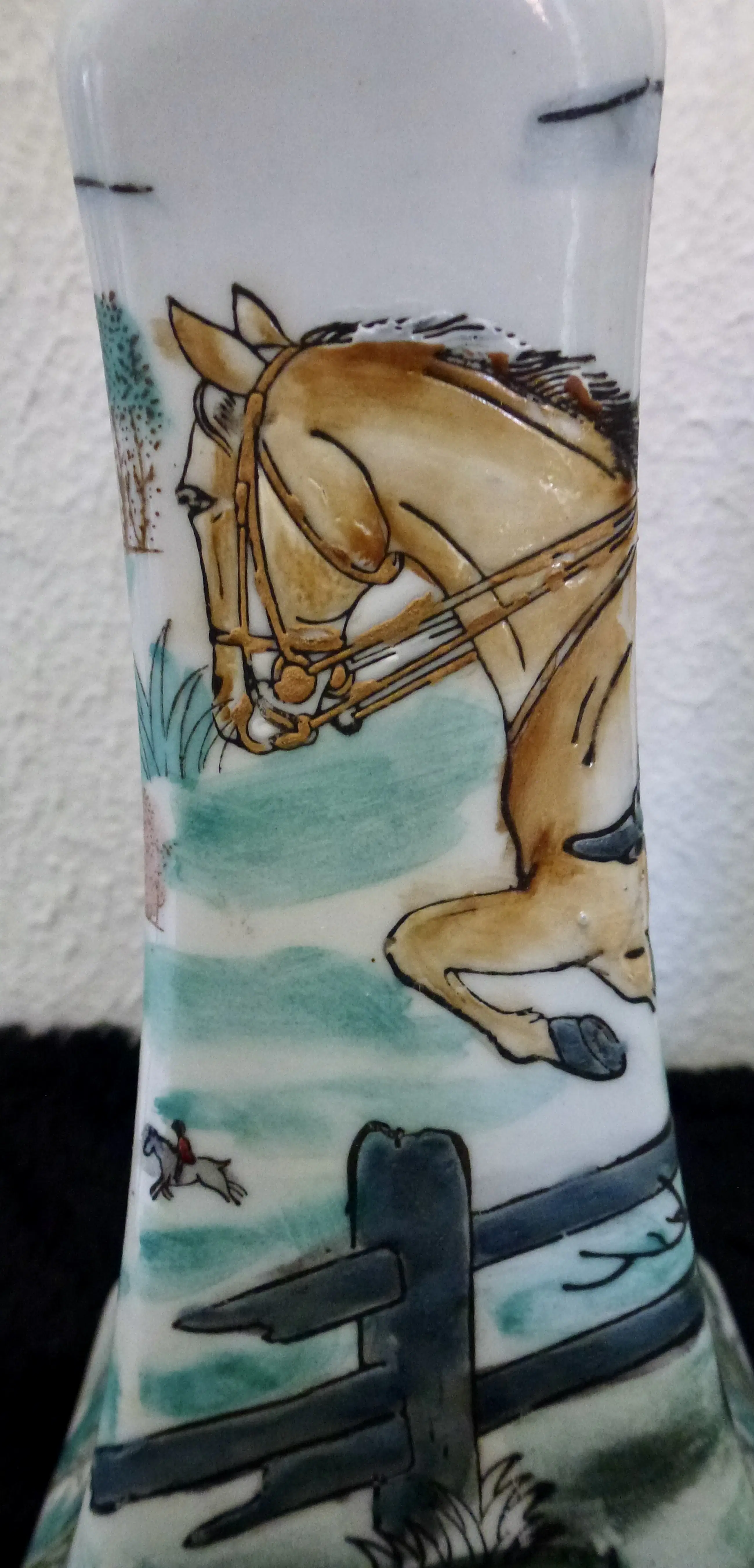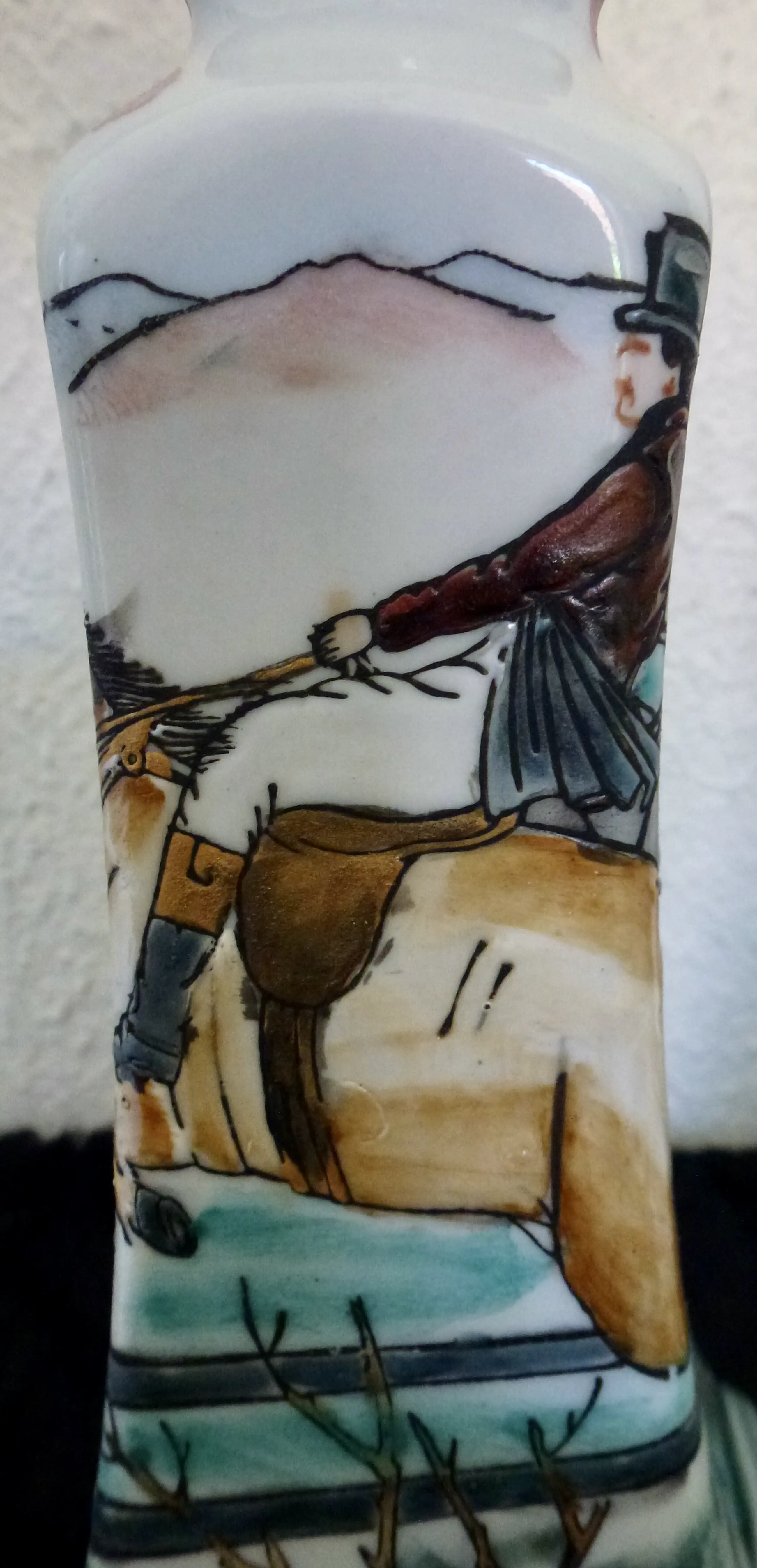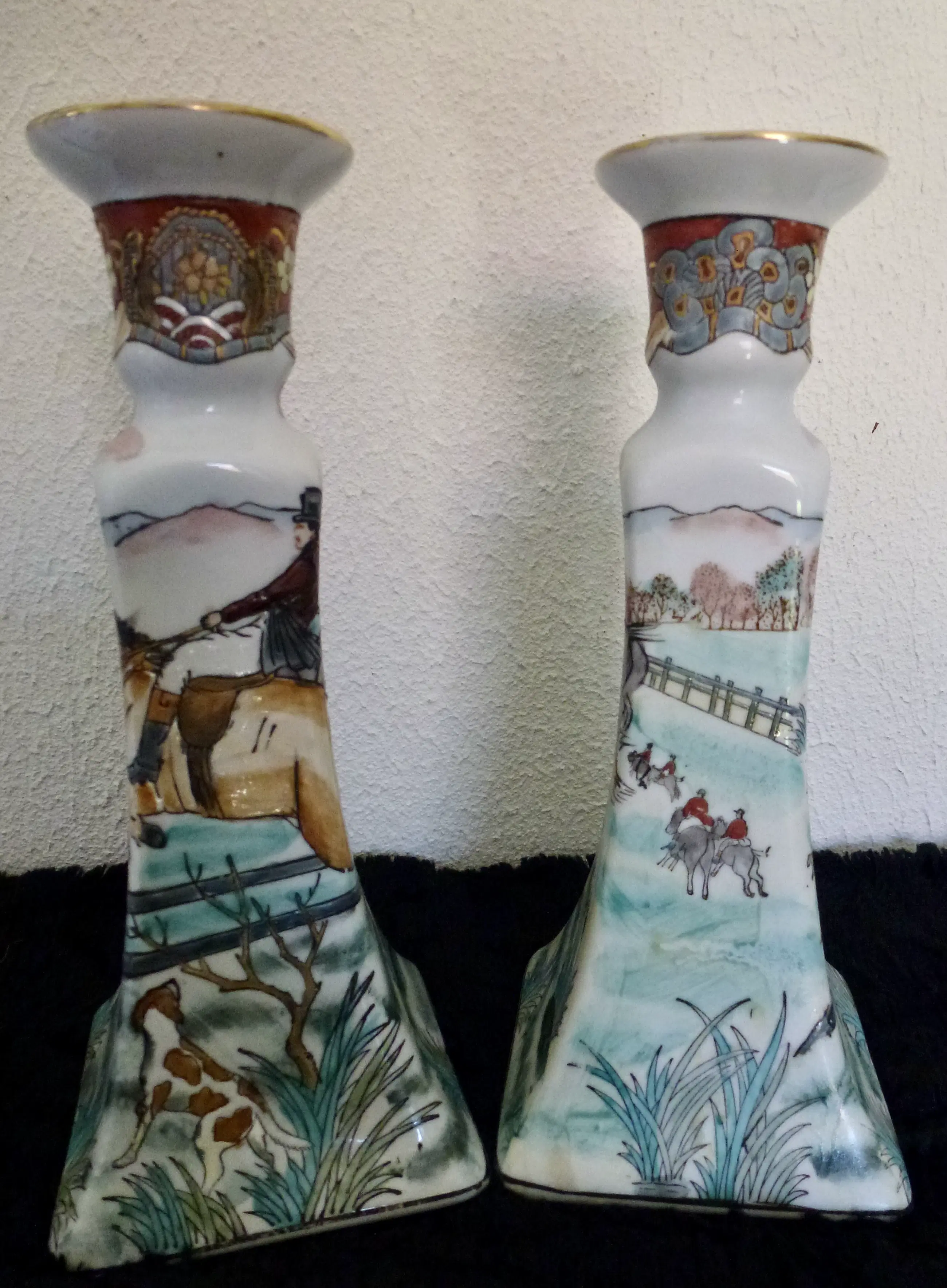 2 Kandelaren en een groot bord met afbeelding van de jacht, inclusief paarden en honden.
