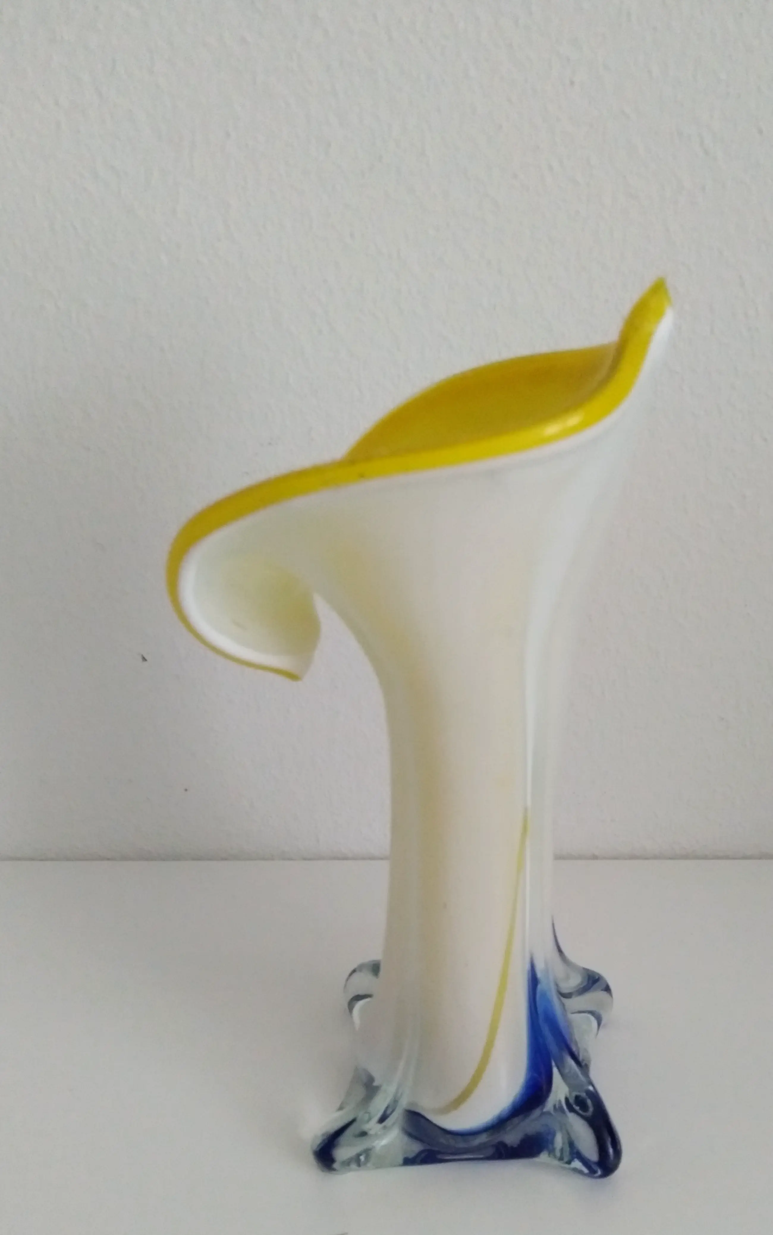 Charmante vaas van handgemaakt/mondgeblazen glas. De voet is helder transparant, daaruit rijzen wit en blauwe tinten op. De blikvanger is natuurlijk de 'kraag', in geel glas en gevormd naar een bloem (van de Calla). Verkeert in goede gebruikte staat.