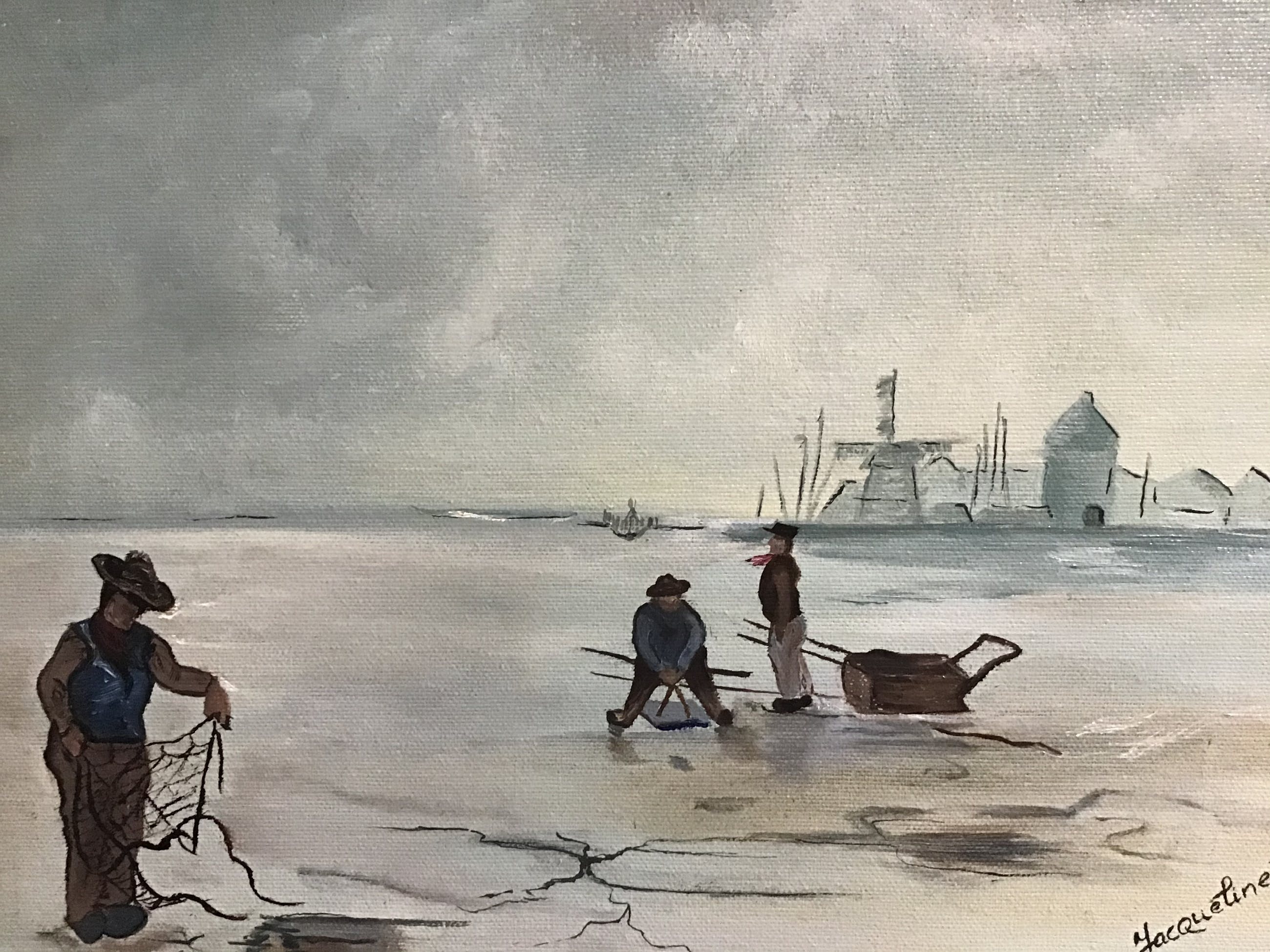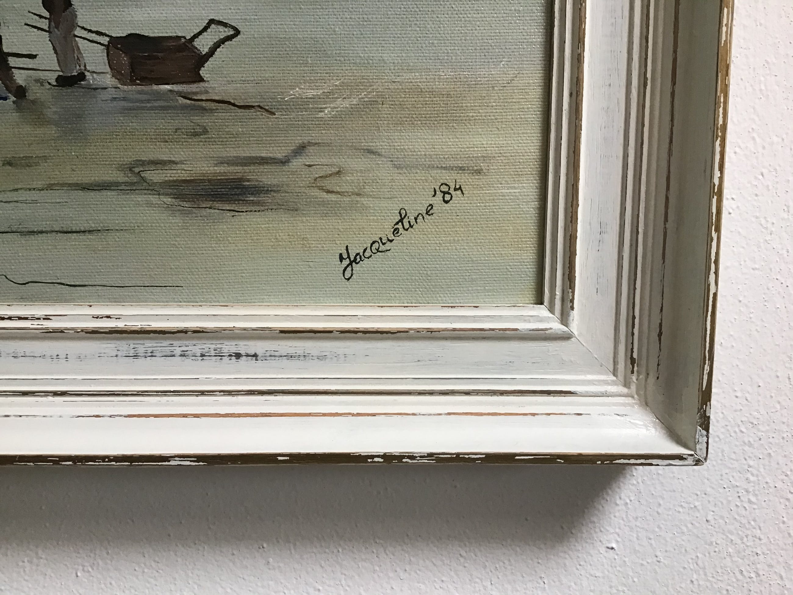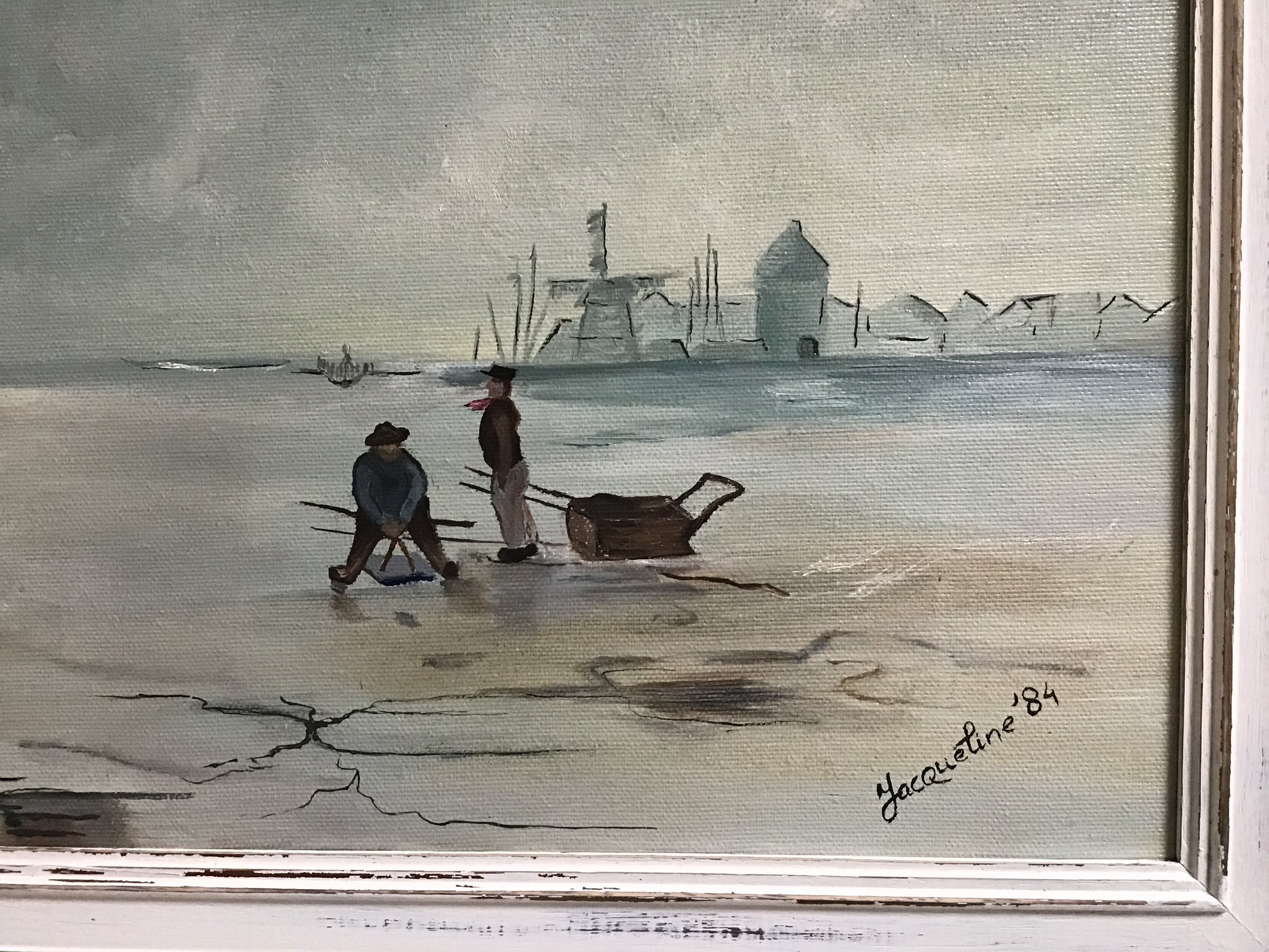 Ijsvissers op een Hollands water. Sfeervol winterlandschapje. Misschien ook mooi in een rustige lijst. Welke Jacqueline de maakster is weet ik niet.